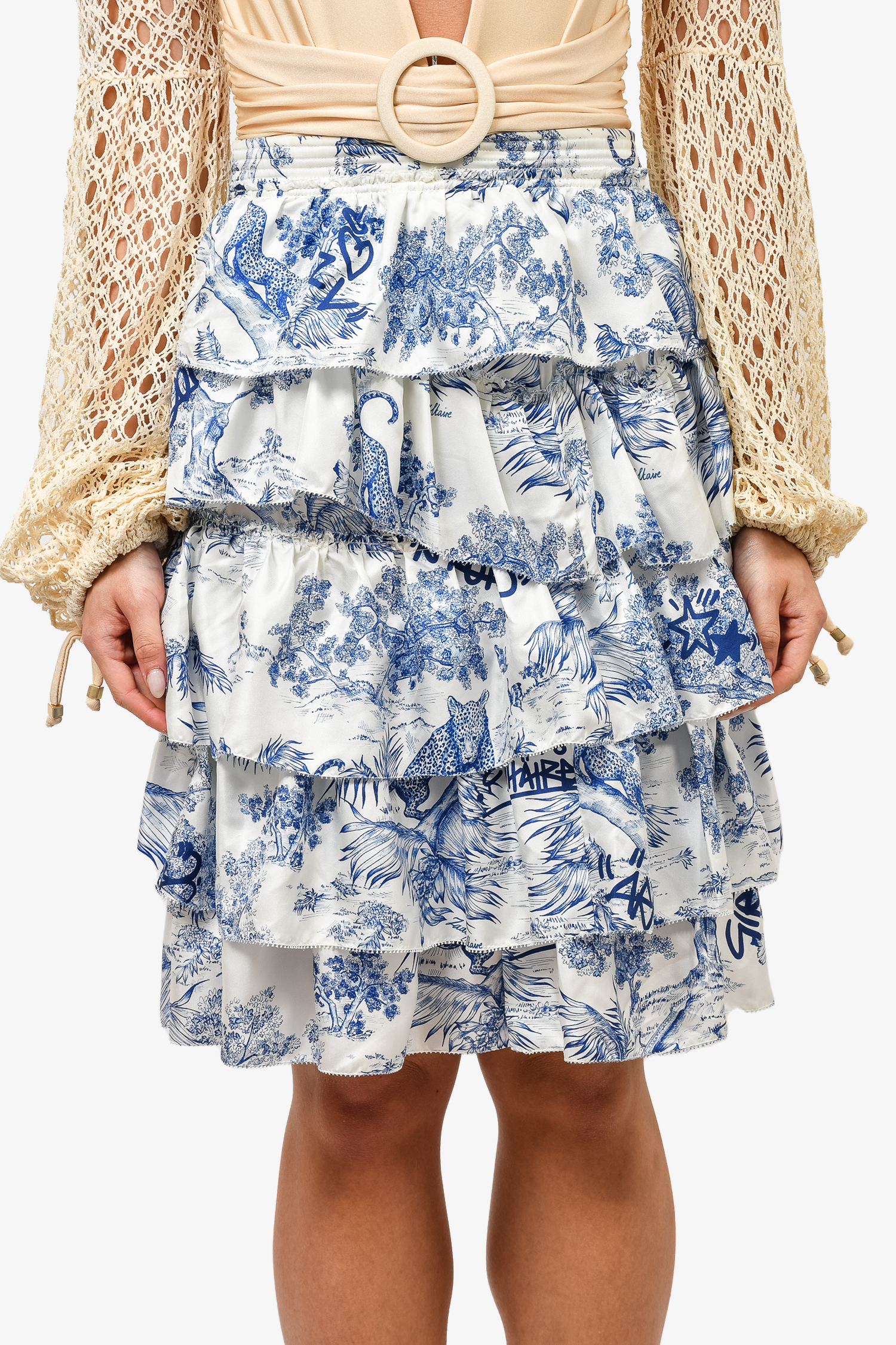 Refresh availabilityZadig & Voltaire Blue/White Printed Silk Ruffle Skirt. Side zip closure. Unlined. Tonal stitching.