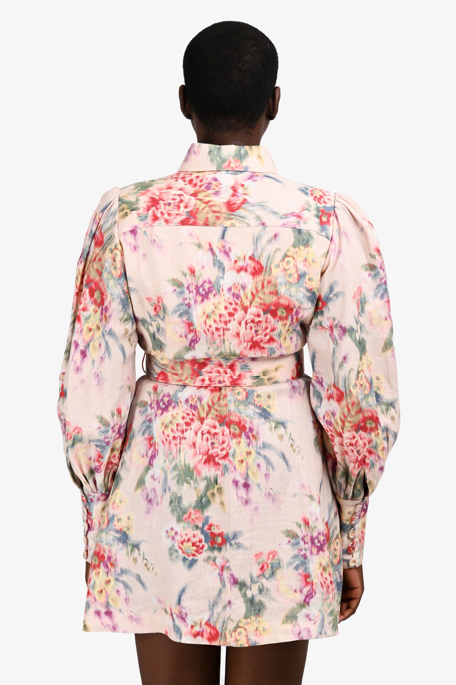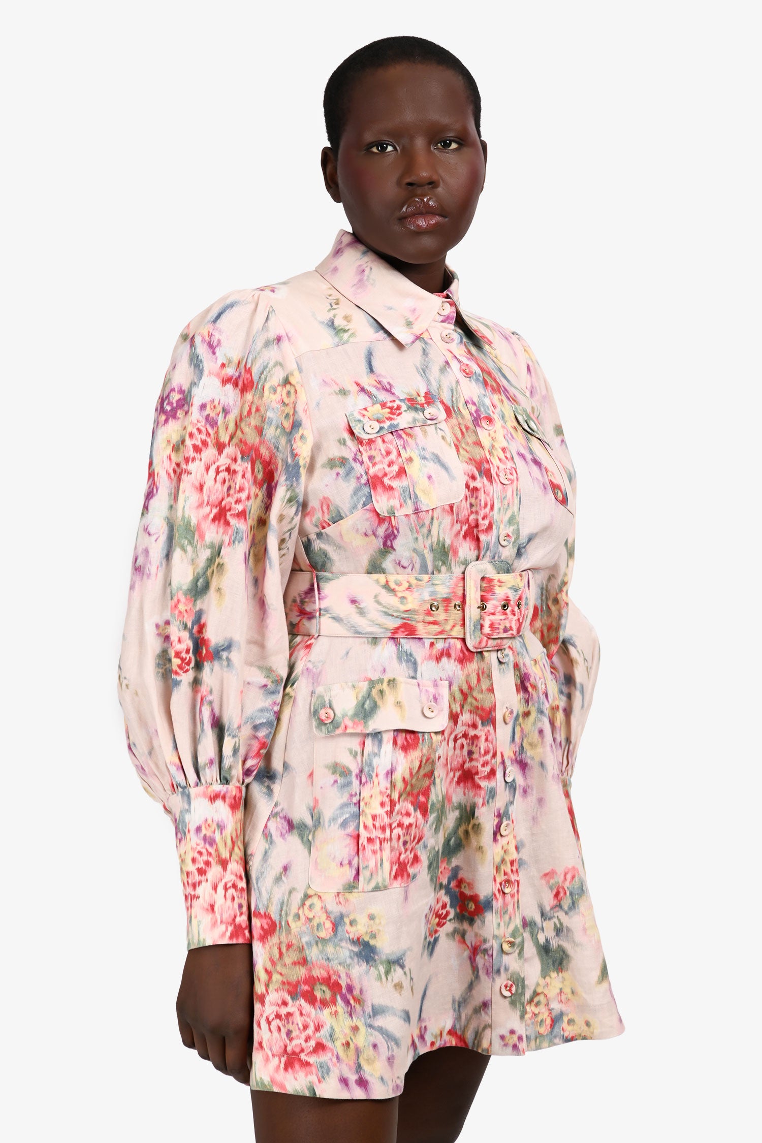 Refresh availabilityZimermann Pink Watercolour Floral Long Sleeve Belted Dress. Collared neckline. Button closure in the front. 4 exterior fold-over pockets with button detailing. Adjustable belt on the waist. Gold-tone hardware. Tonal stitching.