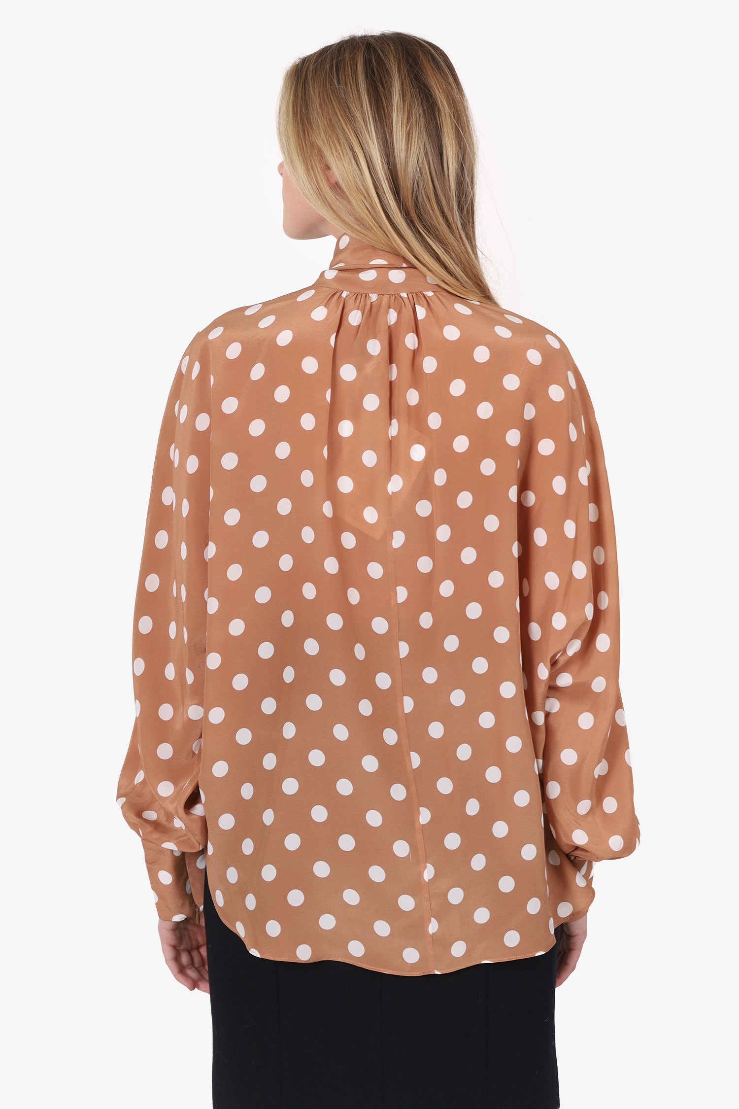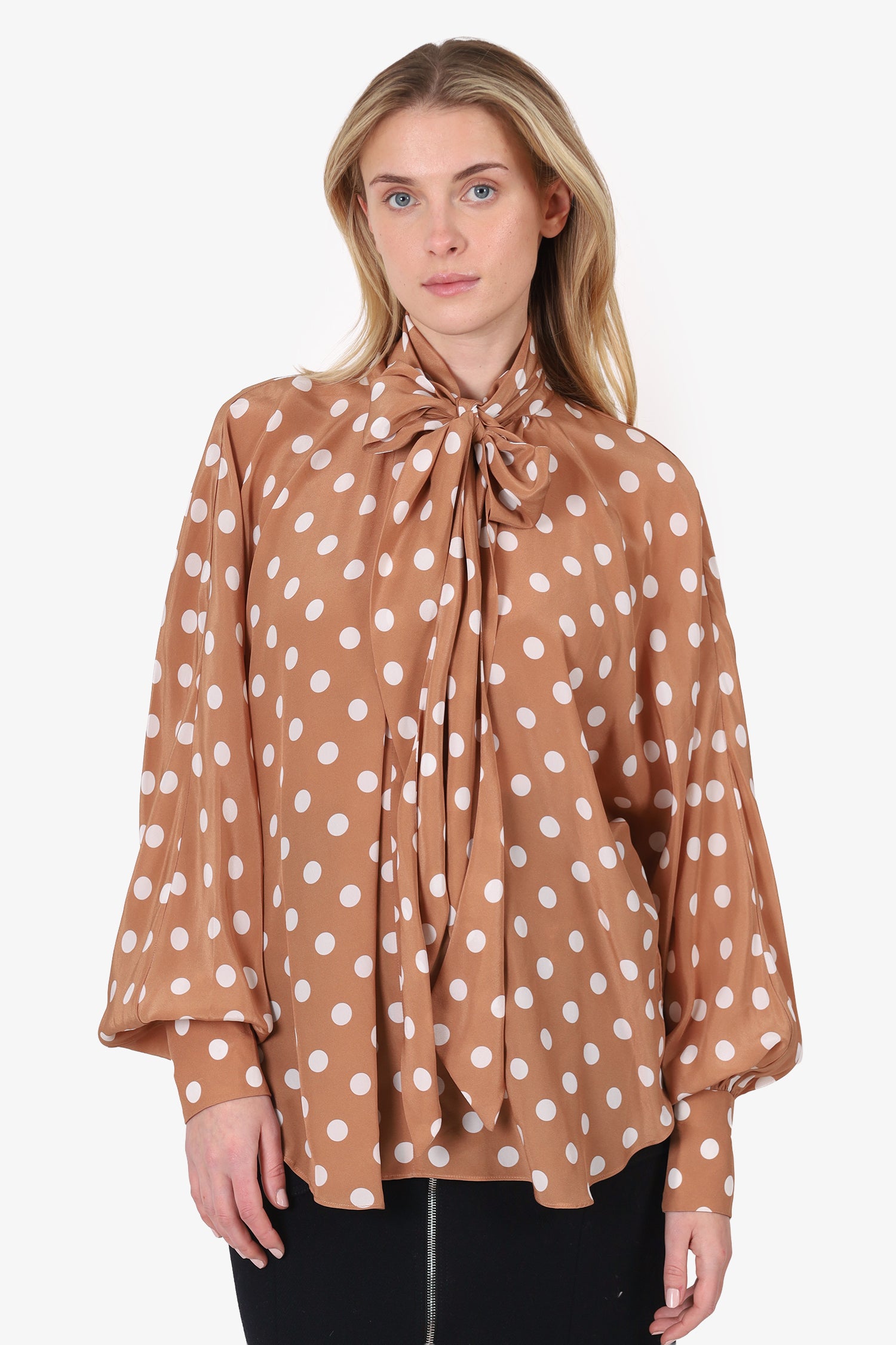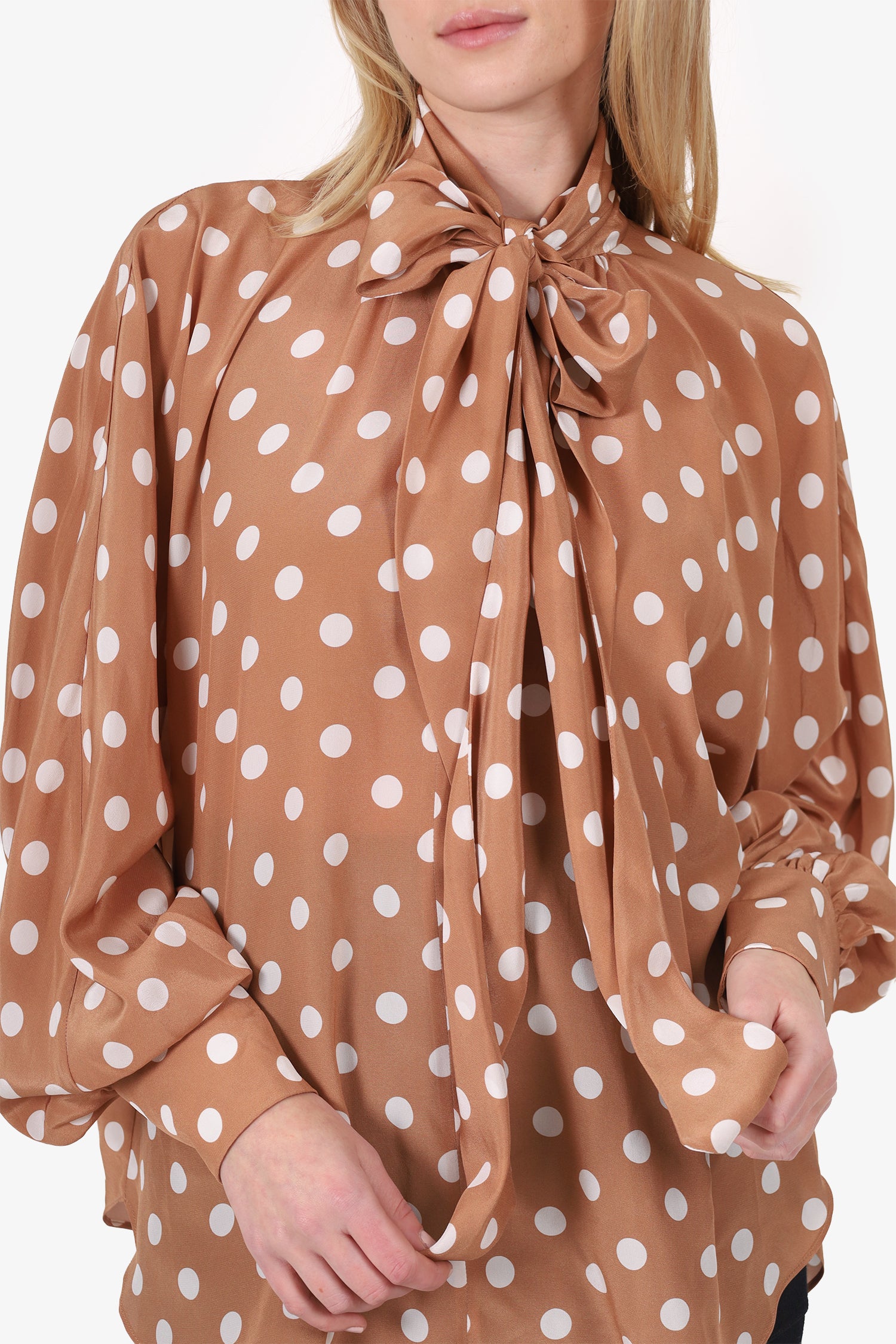 Refresh availabilityZimmerman Brown Polka-Dot Silk Blouse. Pull-on. Front button-up closure. High neckline with tie-up closure. Sleeve cuffs with button-up closure. Tonal stitching.