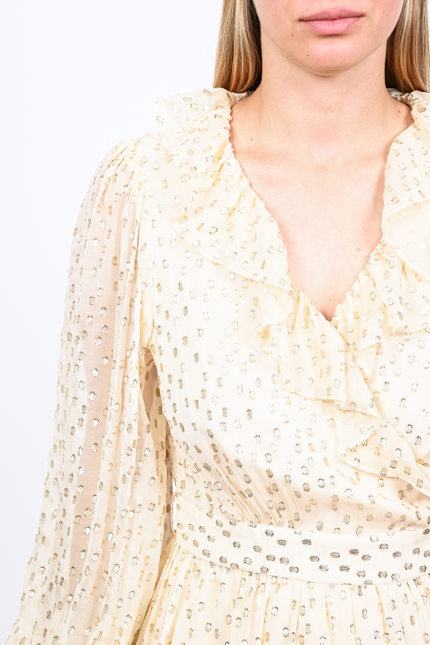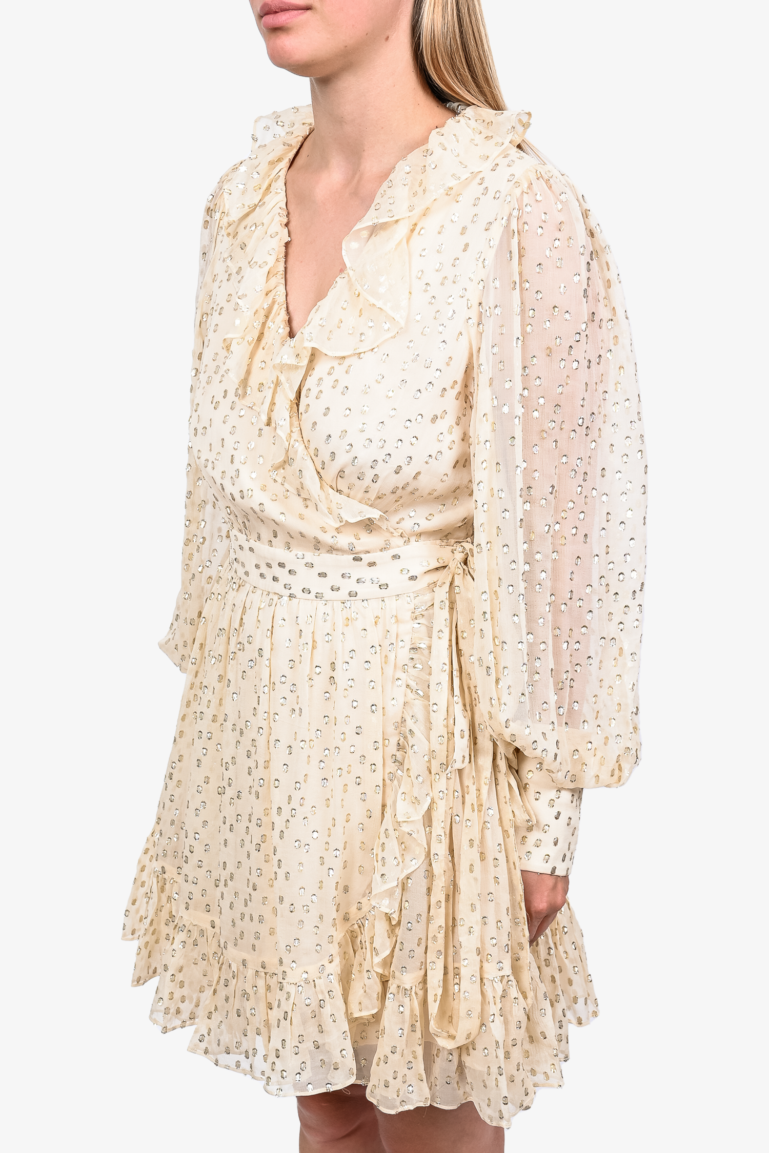 Refresh availabilityZimmerman Gold Dotted Shimmer Ruffle Wrap Mini Dress. Lined. Zip closure on the cuffs. Tonal stitching.