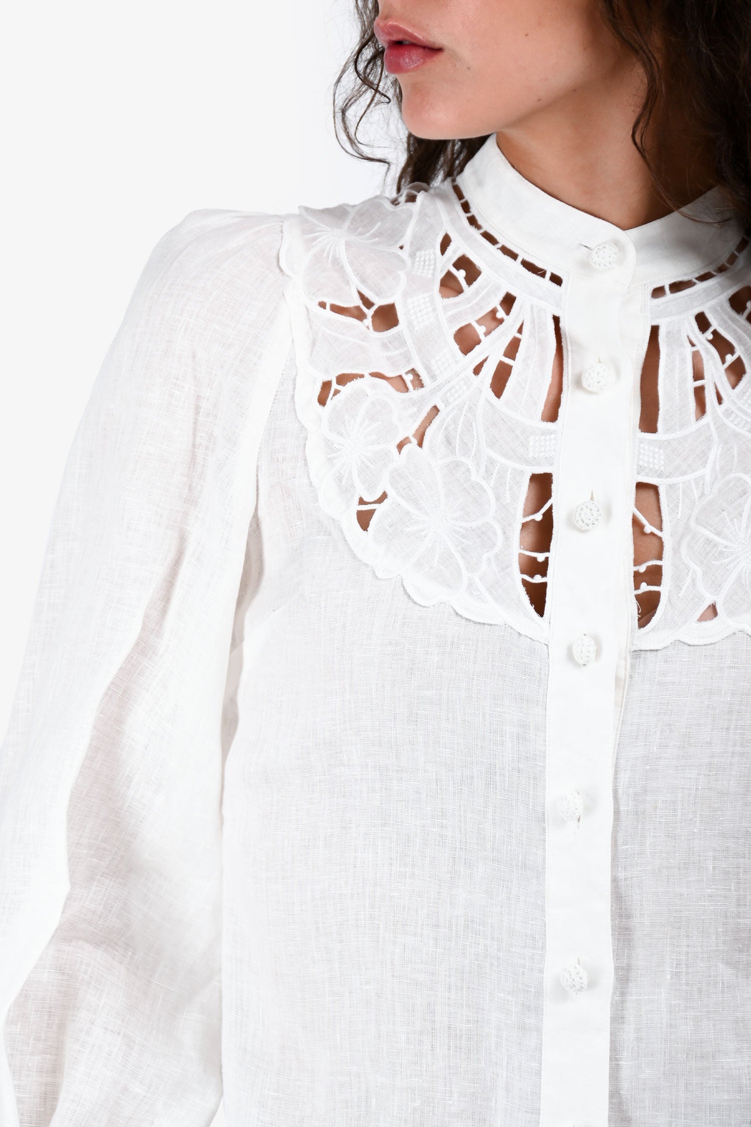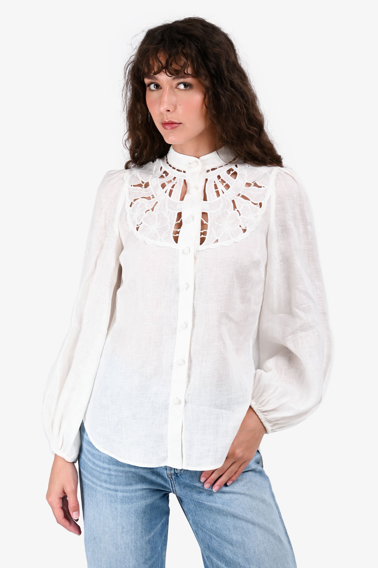 Refresh availabilityZimmerman White Floral Linen Long Sleeve Top. Long sleeves with elastic cuffs. Back zip closure. Tonal stitching.