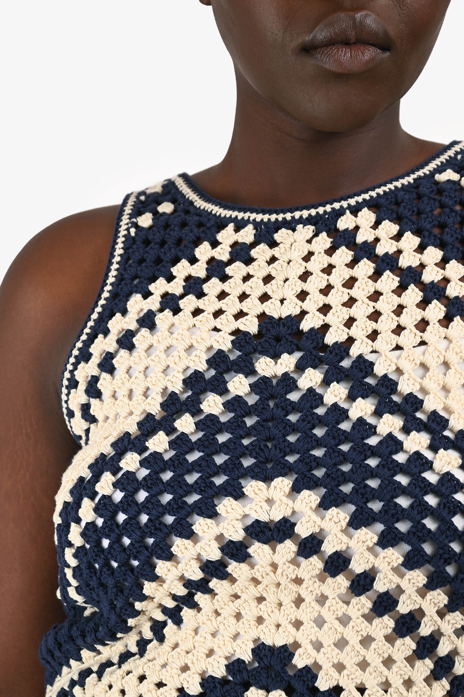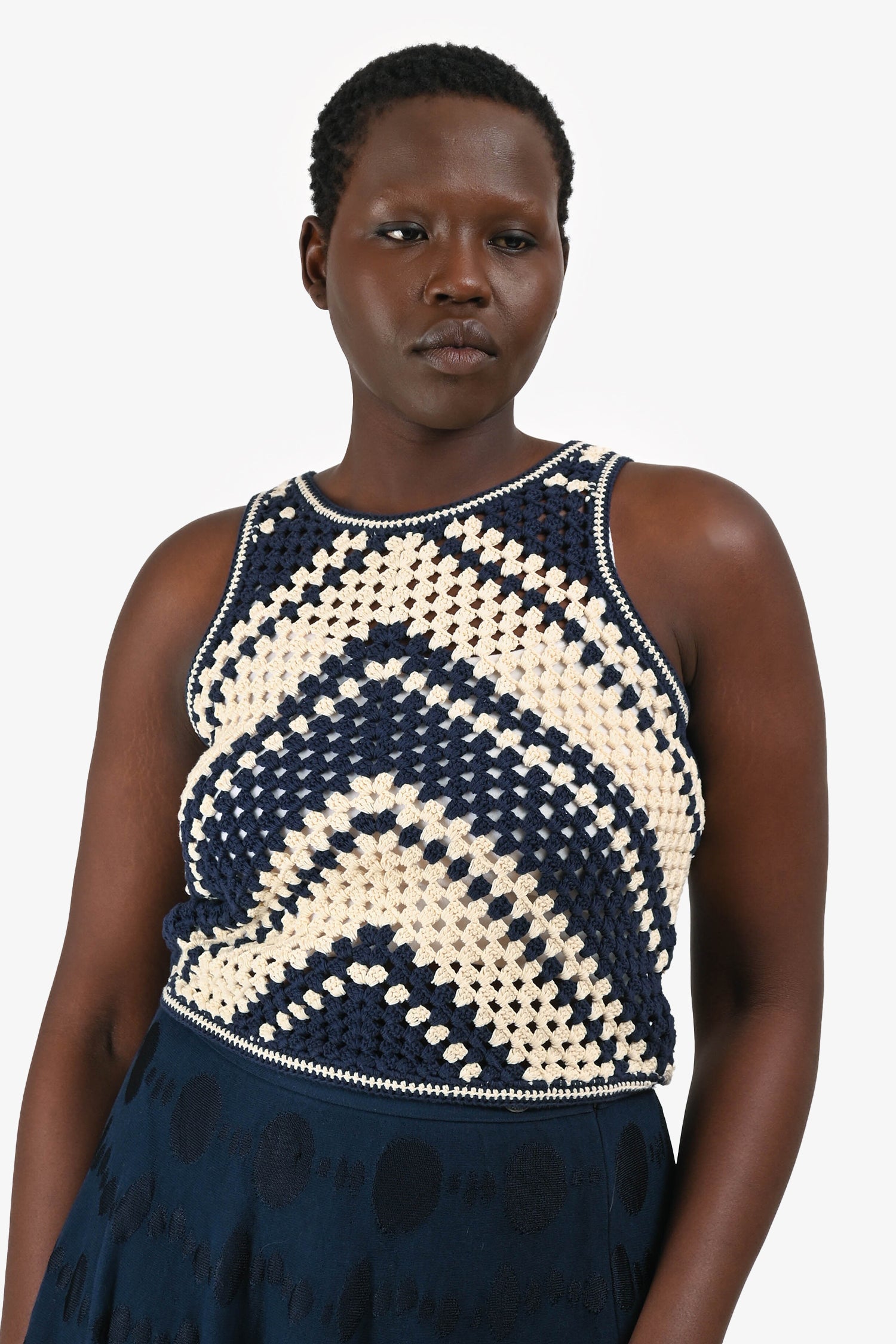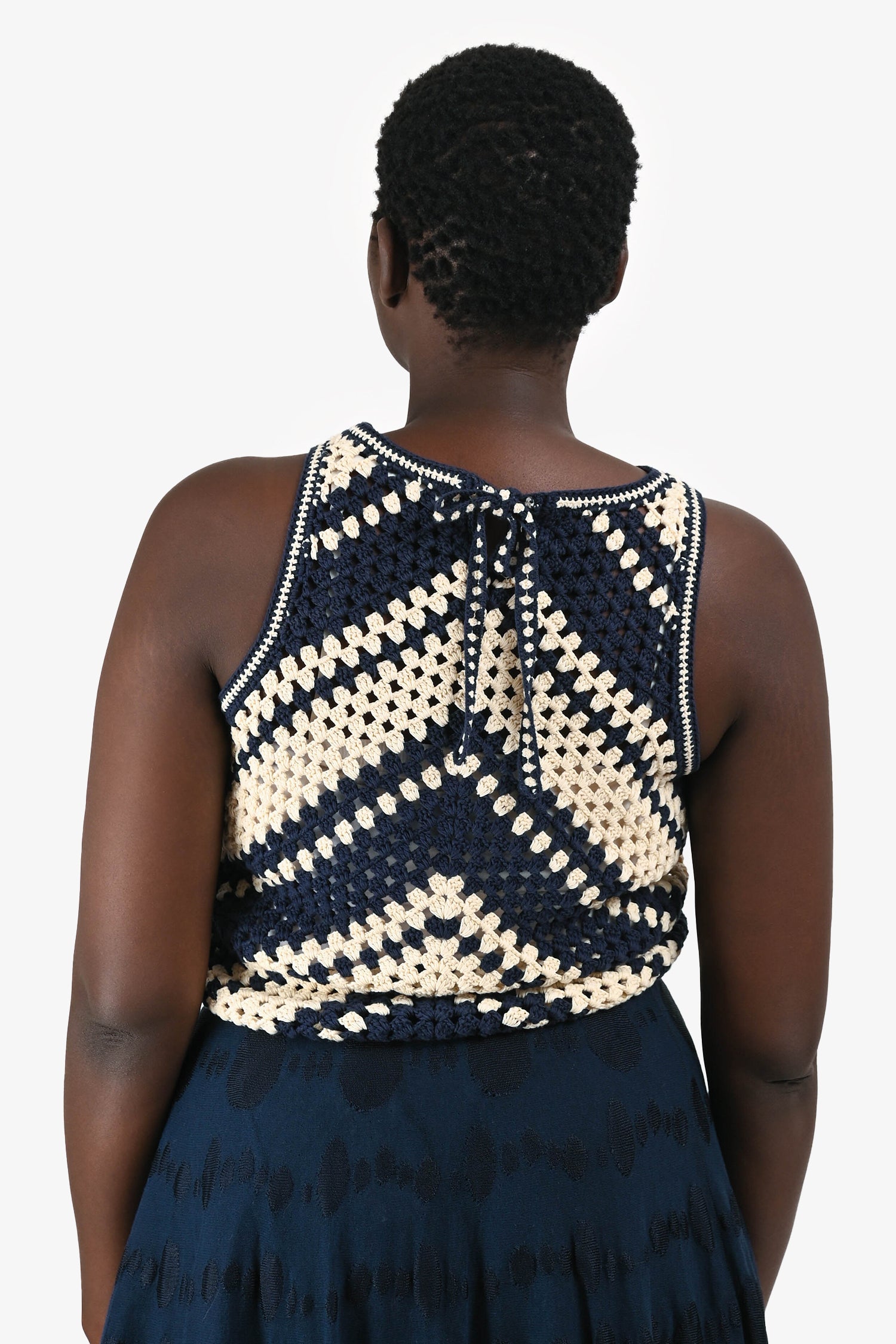 Refresh availabilityZimmerman White/Navy 'Chintz' Hand Crochet Tank Top. Scoop neckline. Sleeveless design. Back tie detail. Pull-on style. Tonal stitching.