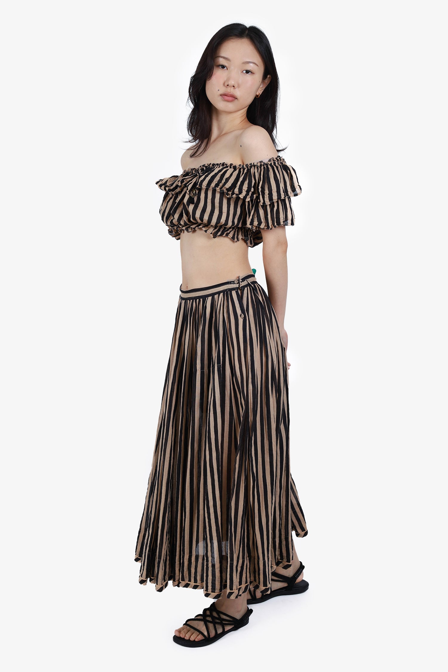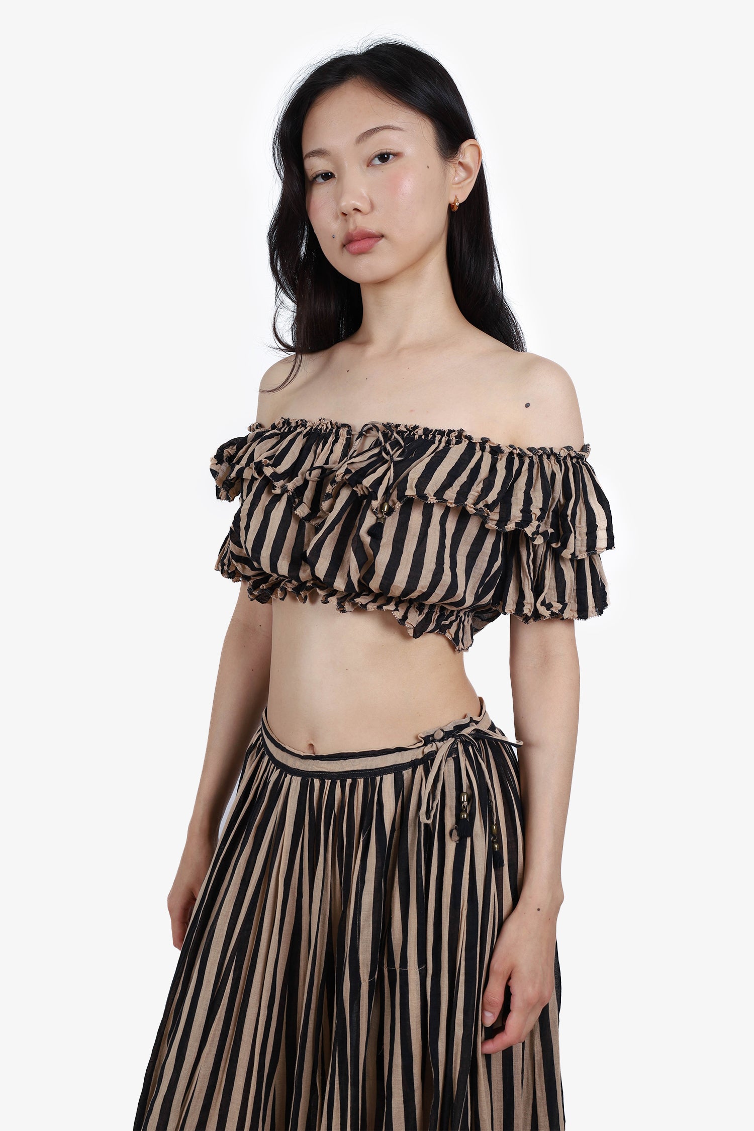 Refresh availabilityZimmermann Beige/Black Striped Off-The-Shoulder Cropped Top with Midi Skirt Set. Unlined. Side button closure. Elasticated hem of top. Tonal stitching.
