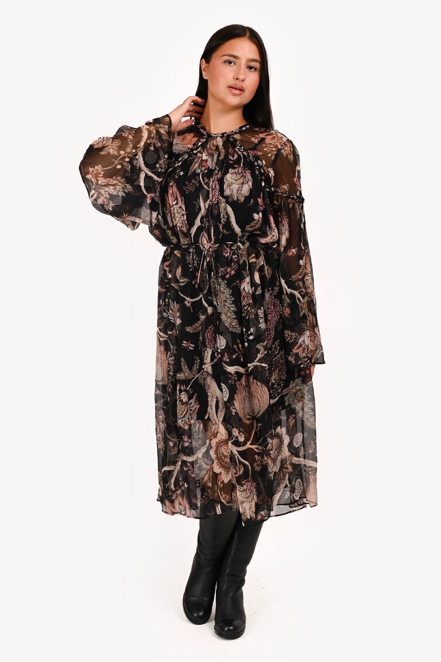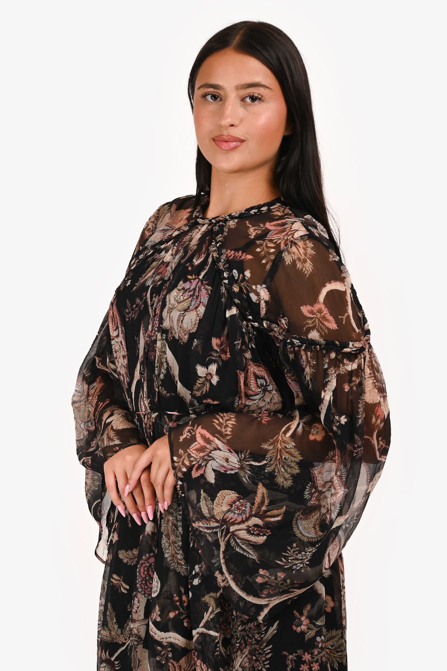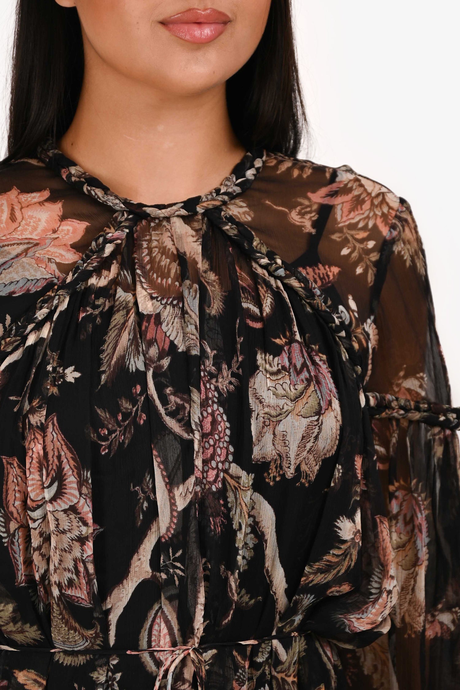 Refresh availabilityZimmermann Black Floral Silk Sheer Midi Dress. Back-of-neck button closure. Flared cuffs. Tie-up waist detail.