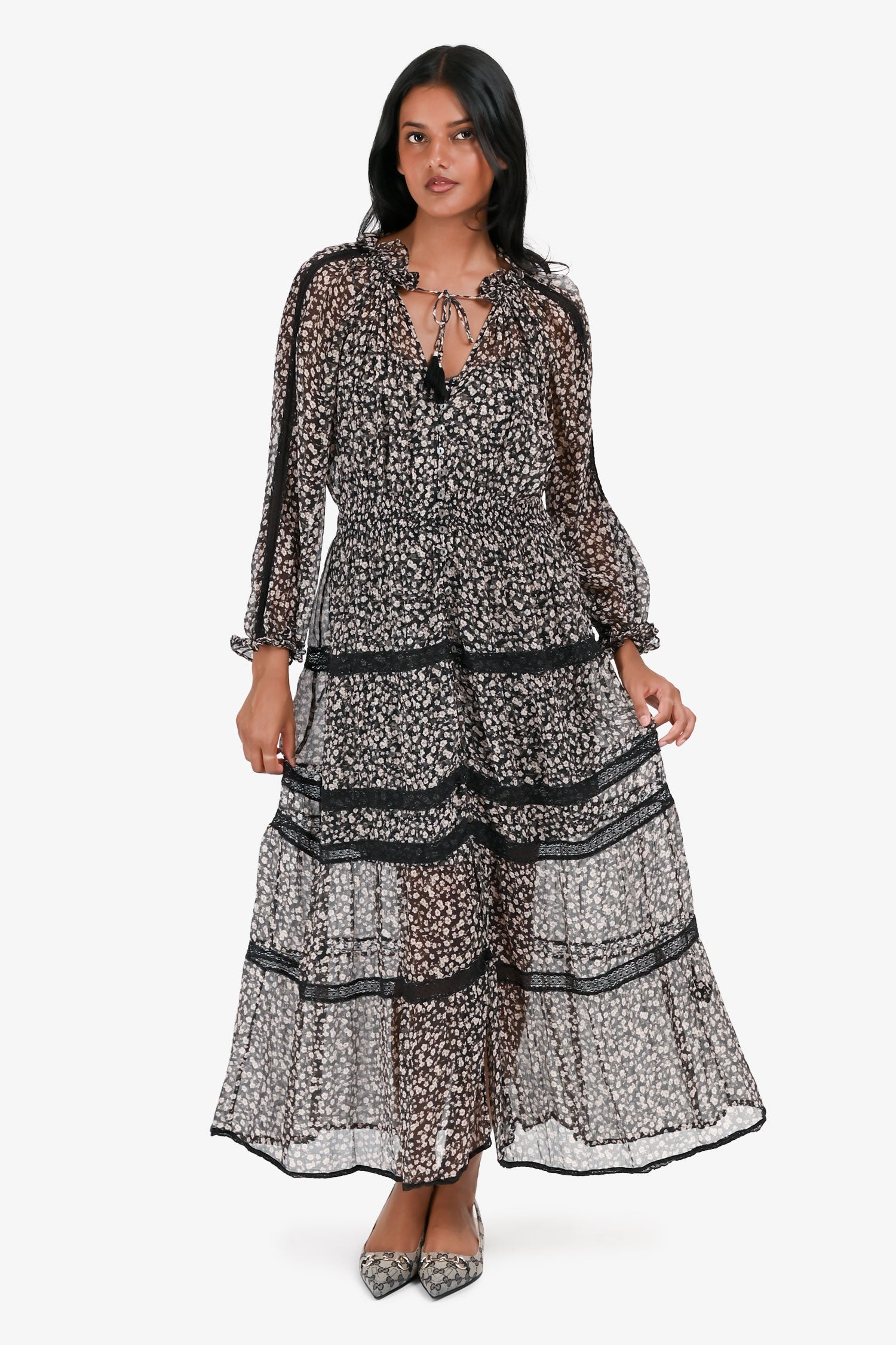 Refresh availabilityZimmermann Black/Pink Floral Long Sleeve Sheer Maxi Dress. Long sheer sleeves with elastic cuffs. Front button and neck tie closure. Tonal stitching. Comes with a matching slip dress.