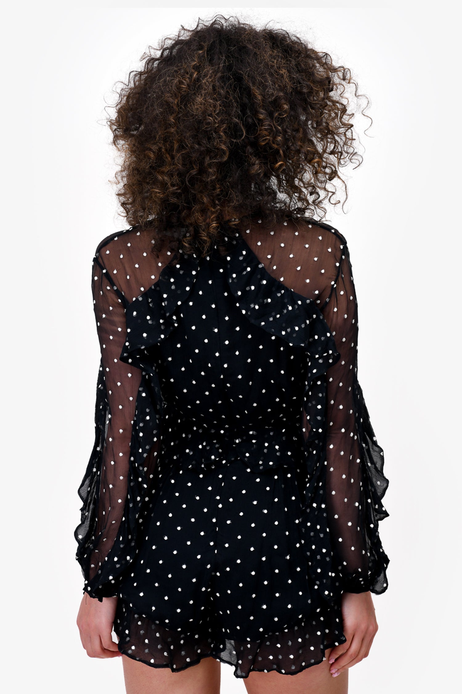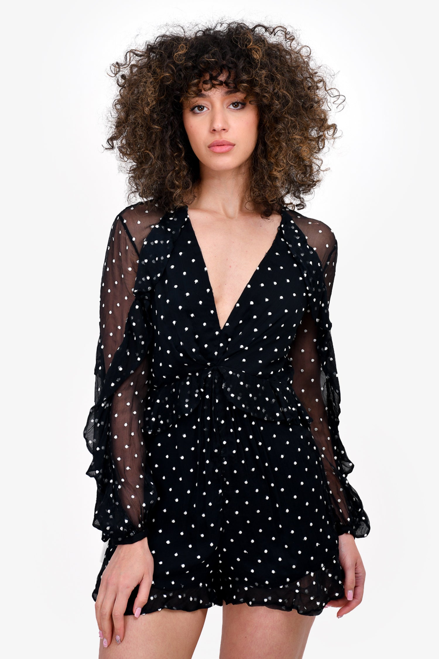 Refresh availabilityZimmermann Black Polkadot Silk Romper. Rear zip and hook closure. Lined. V-neck. Button closure on the cuffs.