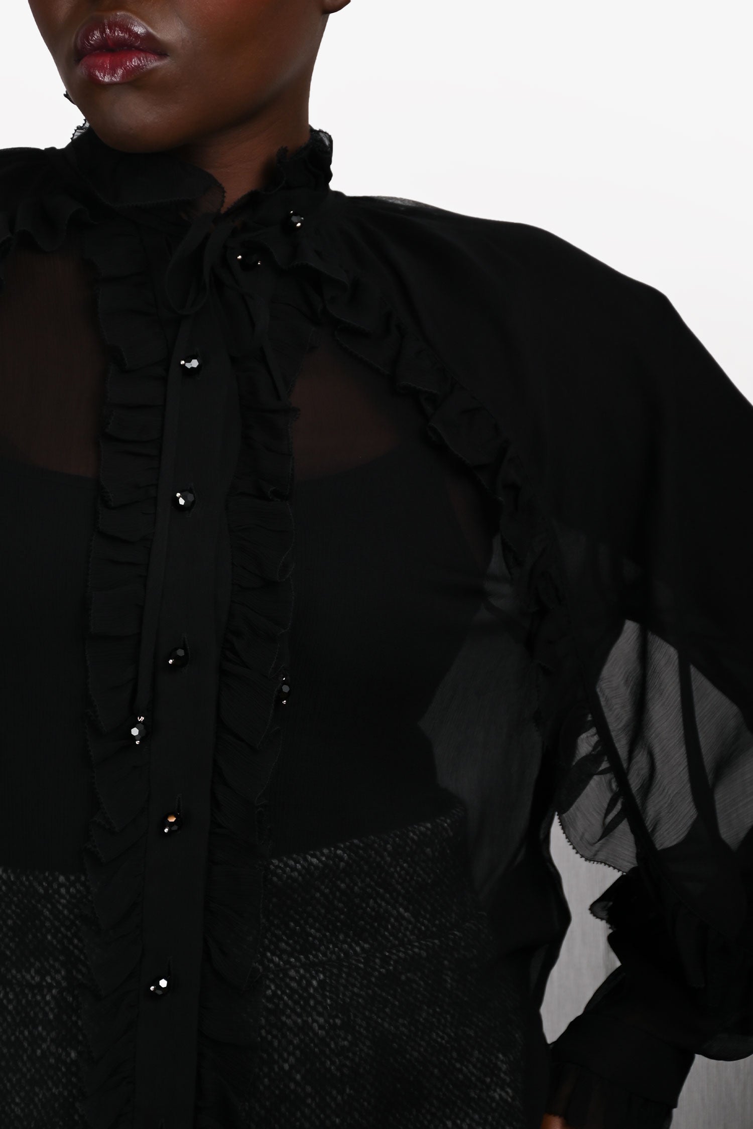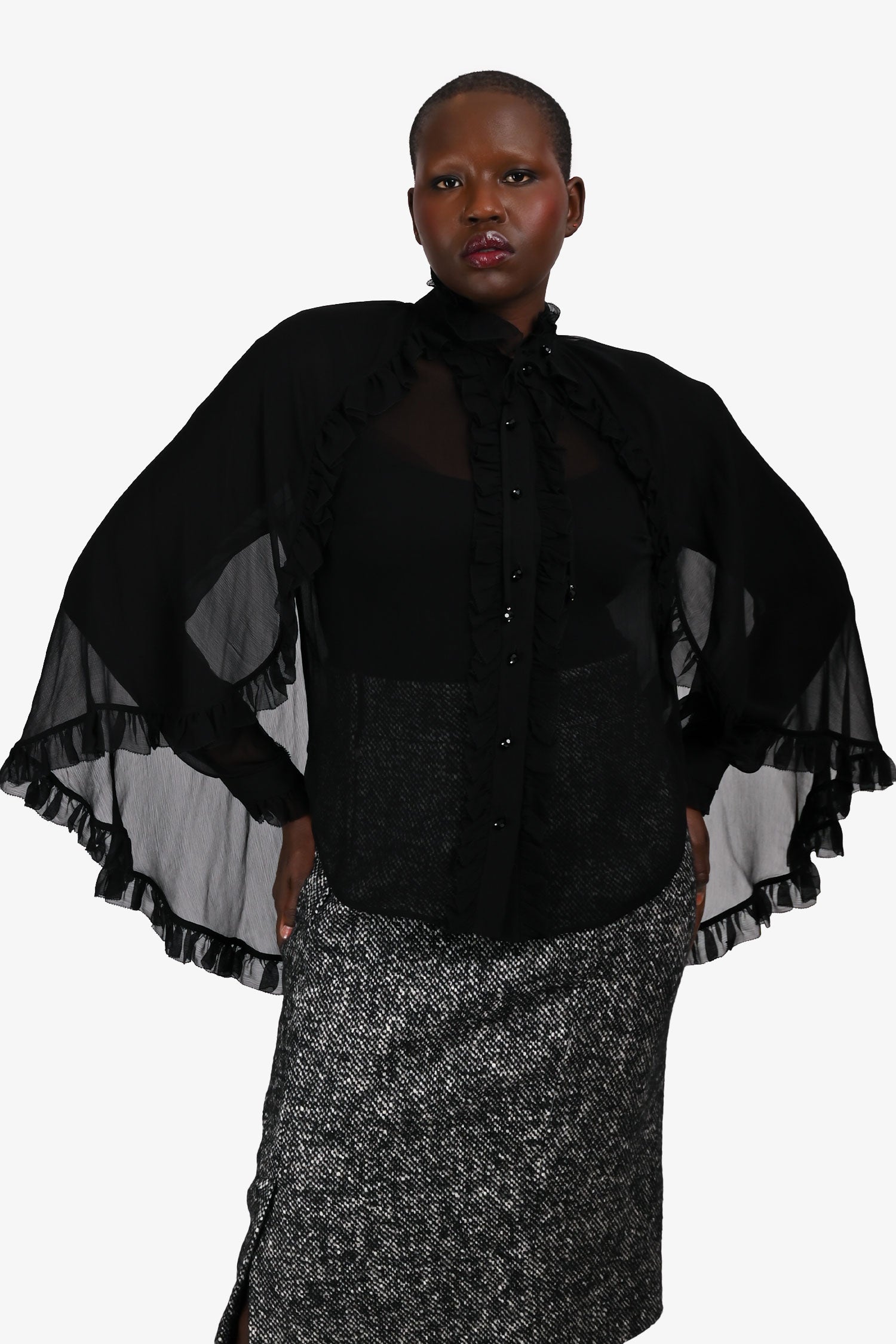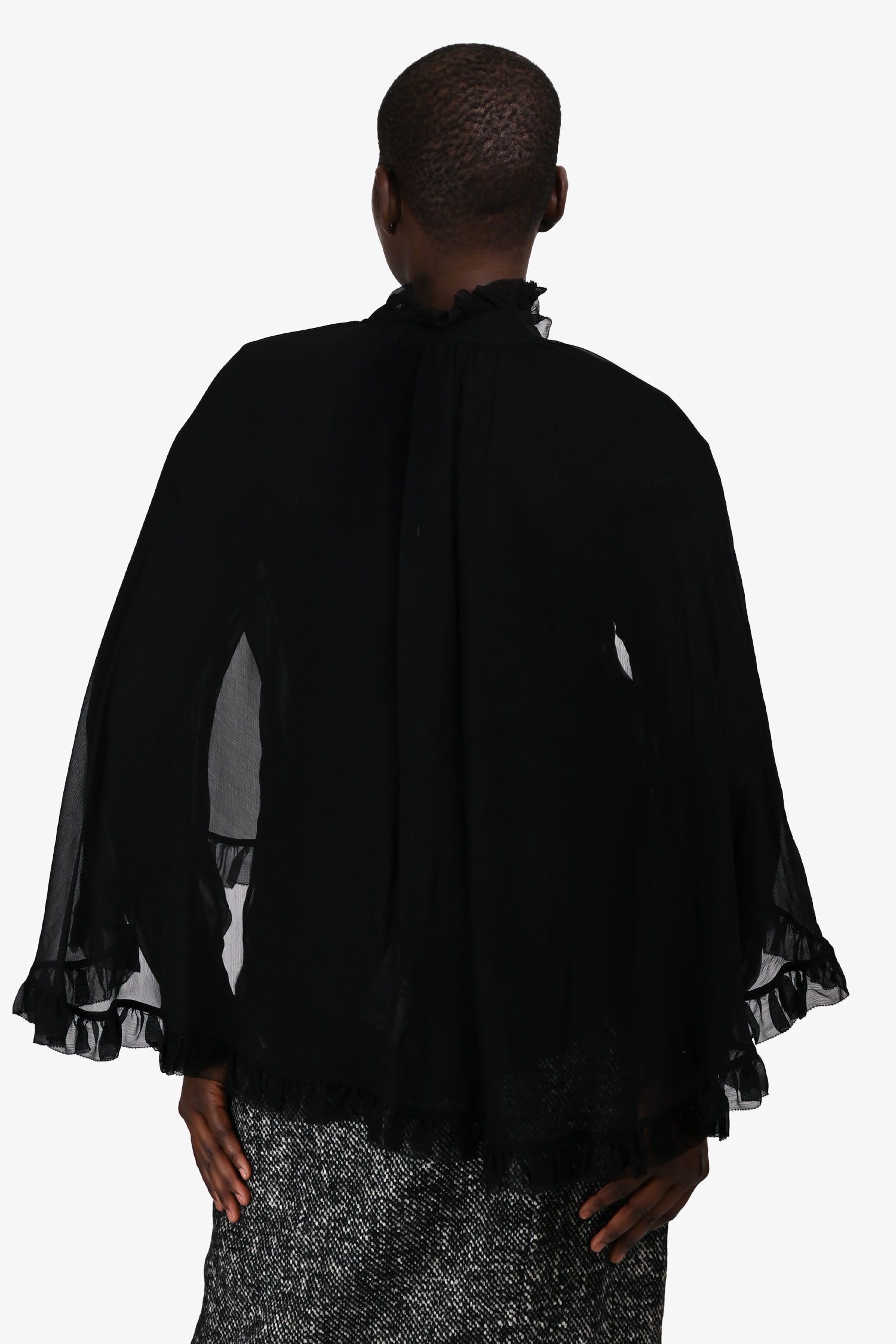 Refresh availabilityZimmermann Black Sheer Ruffle “Illuminate” Cape Blouse. Slip-on. High stand collar with ruffle trim. Front button-up closure. Cape overlay with self-tie at the neck. Cuffs with button-up closure. Gold-tone hardware. Tonal stitching.