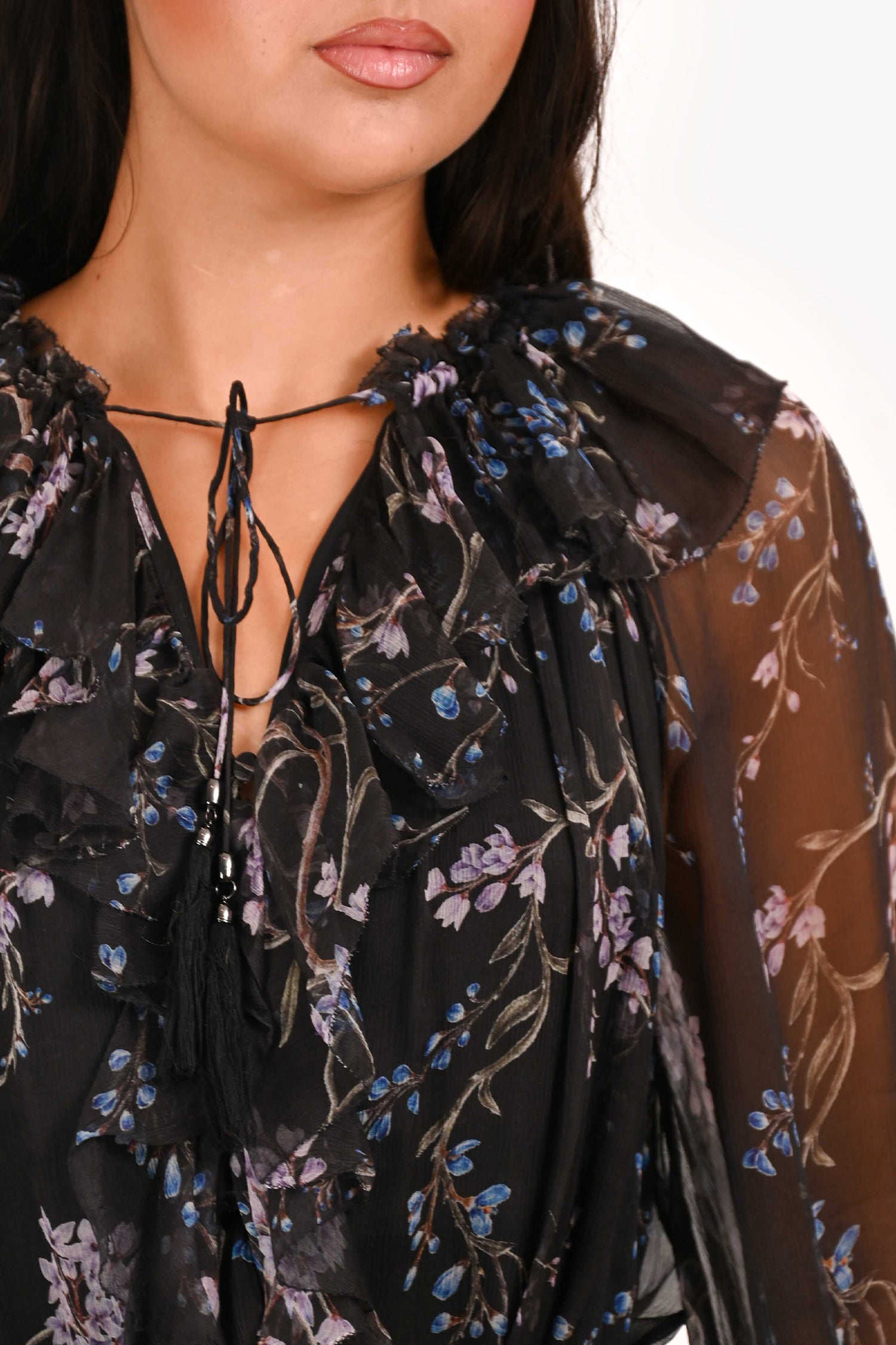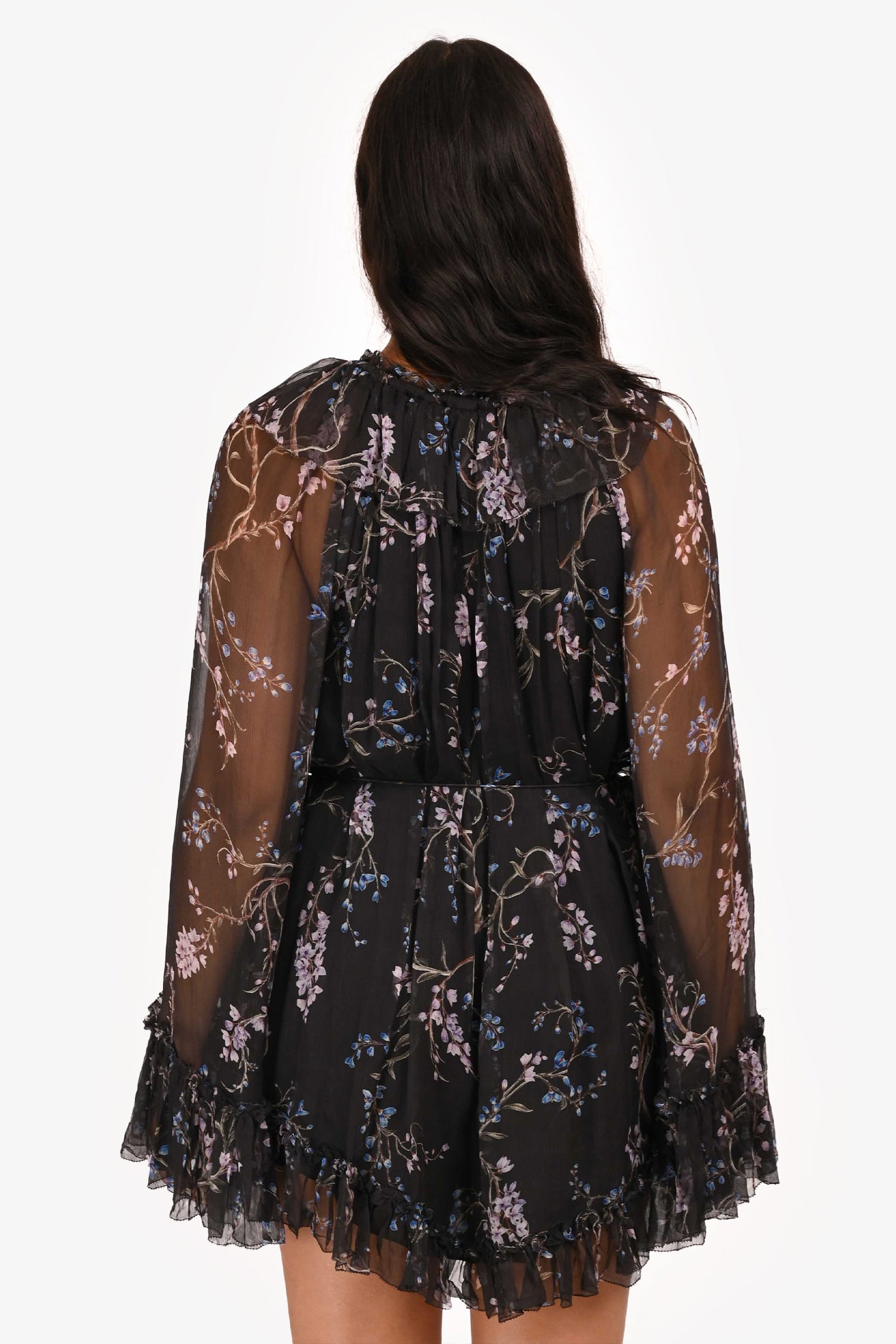 Refresh availabilityZimmermann Black/Pink Silk Floral Belted Mini Dress. V-neckline with button closure and adjustable tie. Adjustable tie at the waistband. Lined bodice. Ruffle detailing throughout. Dark silver-tone hardware. Tonal stitching.