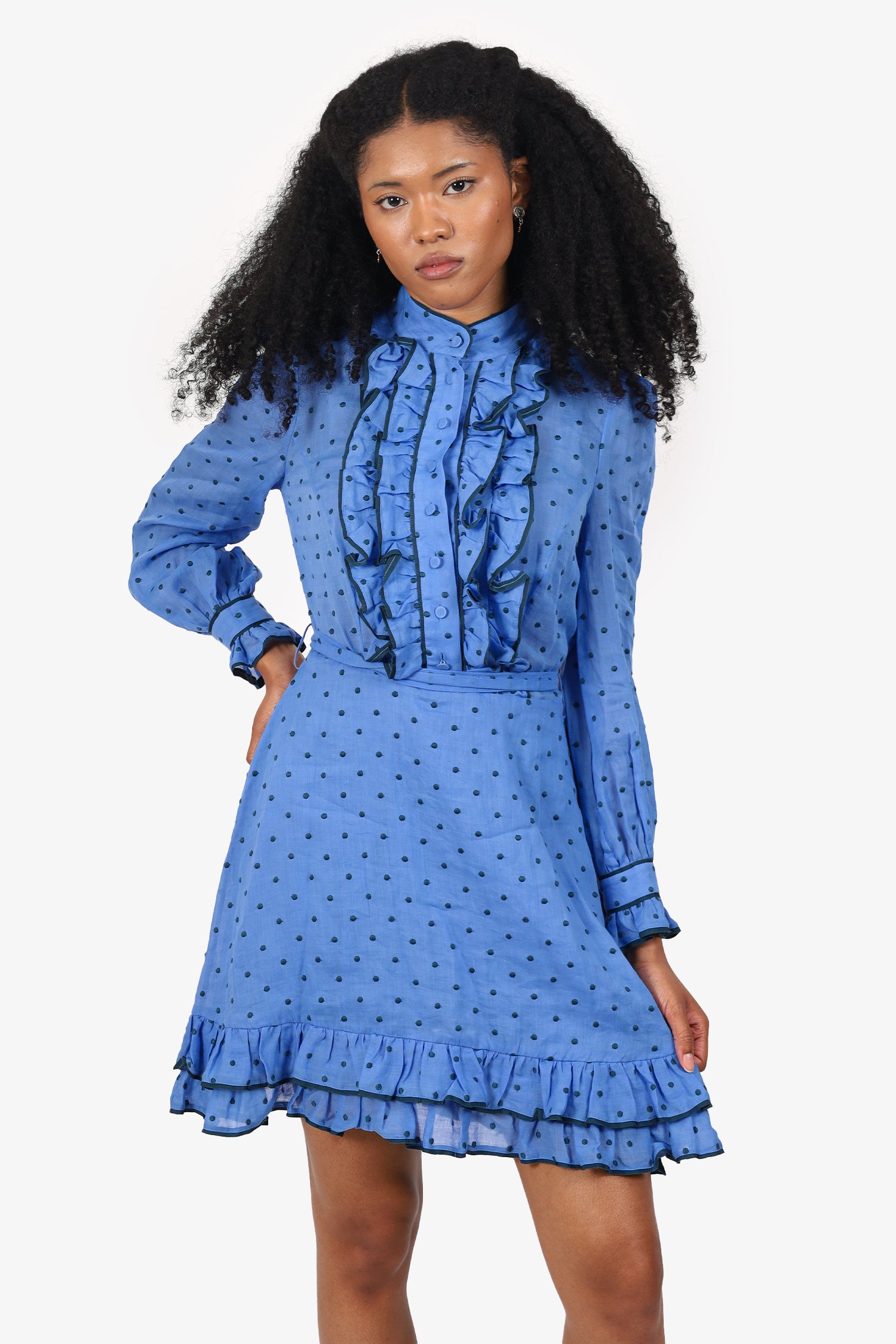 Refresh availabilityZimmermann Blue Embroidered Polka-Dot Long Sleeve Dress. Slip-on. Mock neckline. Front button-up closure. Rear zip closure. Sleeve cuffs with button-up closure. Belt with tie-up closure. Attached interior lining. Tonal stitching.