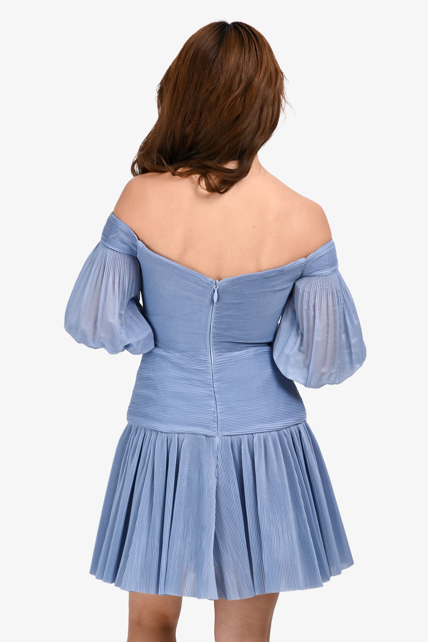 Refresh availabilityZimmermann Blue Pleated Chiffon Mini Dress. Sweetheart neckline. Off-shoulder design. Zipper with a hook-and-eye closure in the back. Lined. Tonal hardware. Tonal stitching.