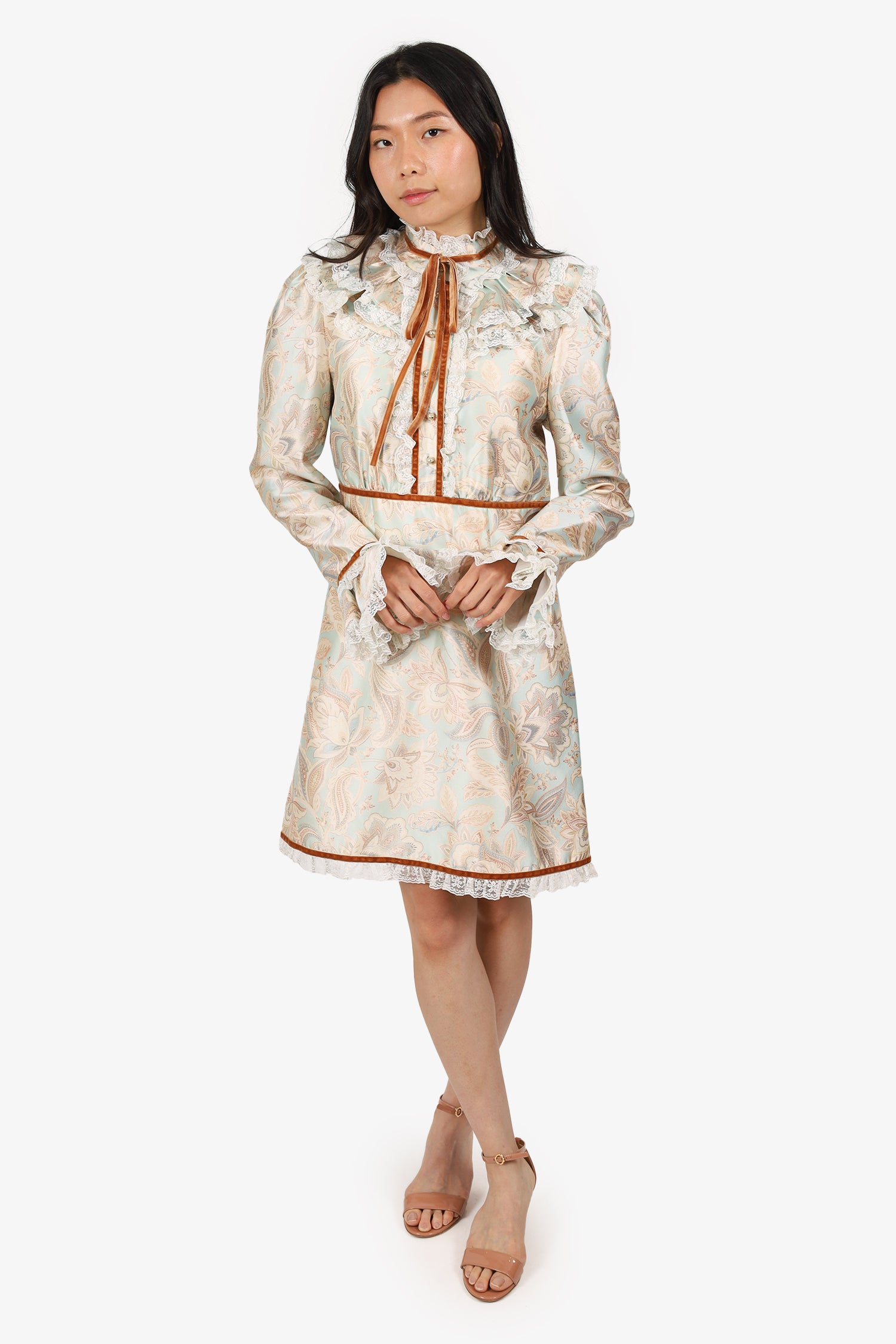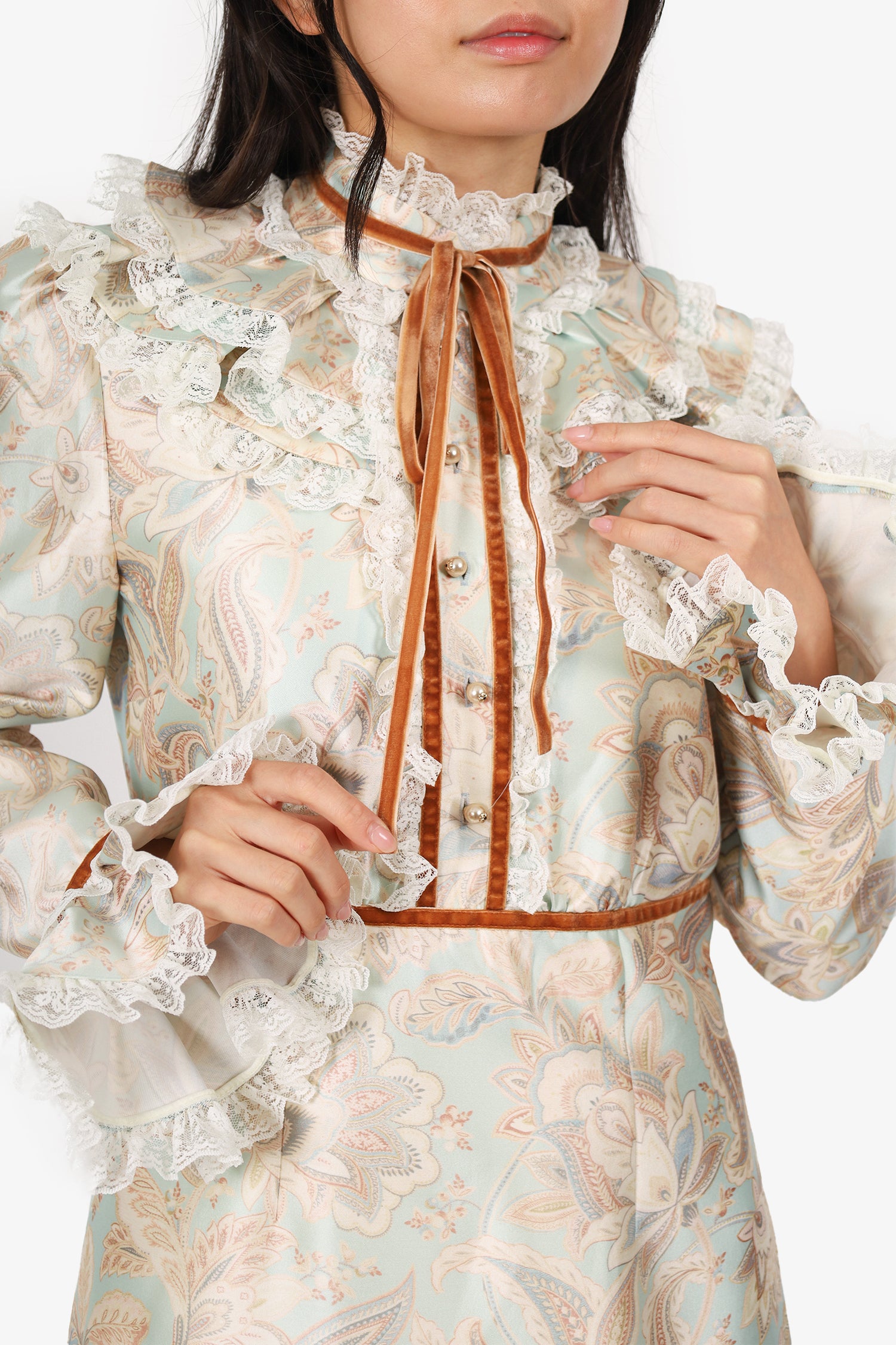 Refresh availabilityZimmermann Blue Wool/Silk Paisley Print Ruffle Dress. Slip-on. Mock-neckline with front tie-up closure. Rear zip closure. Front button-up closure. Lace trimmed. Lined interior. Tonal stitching.