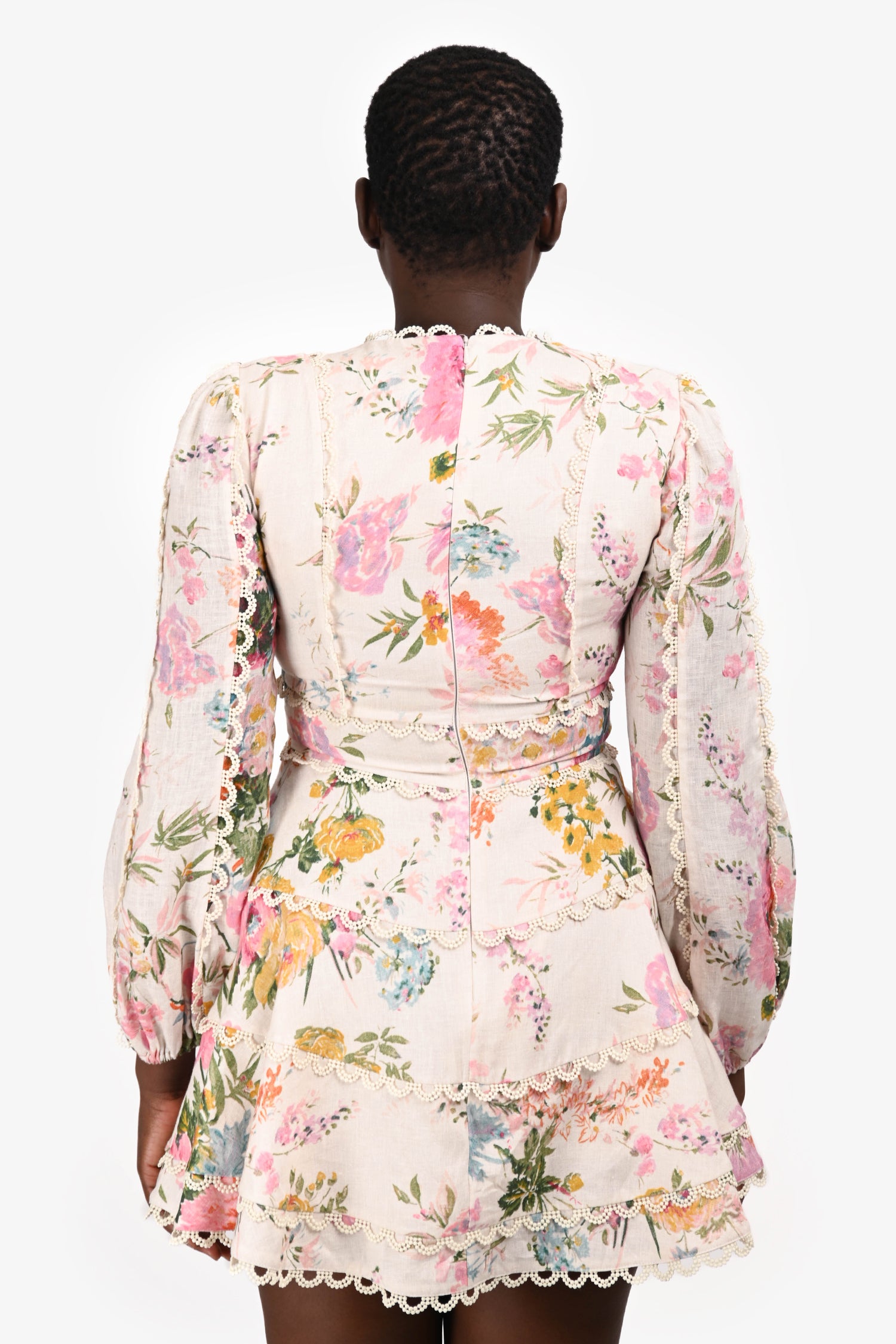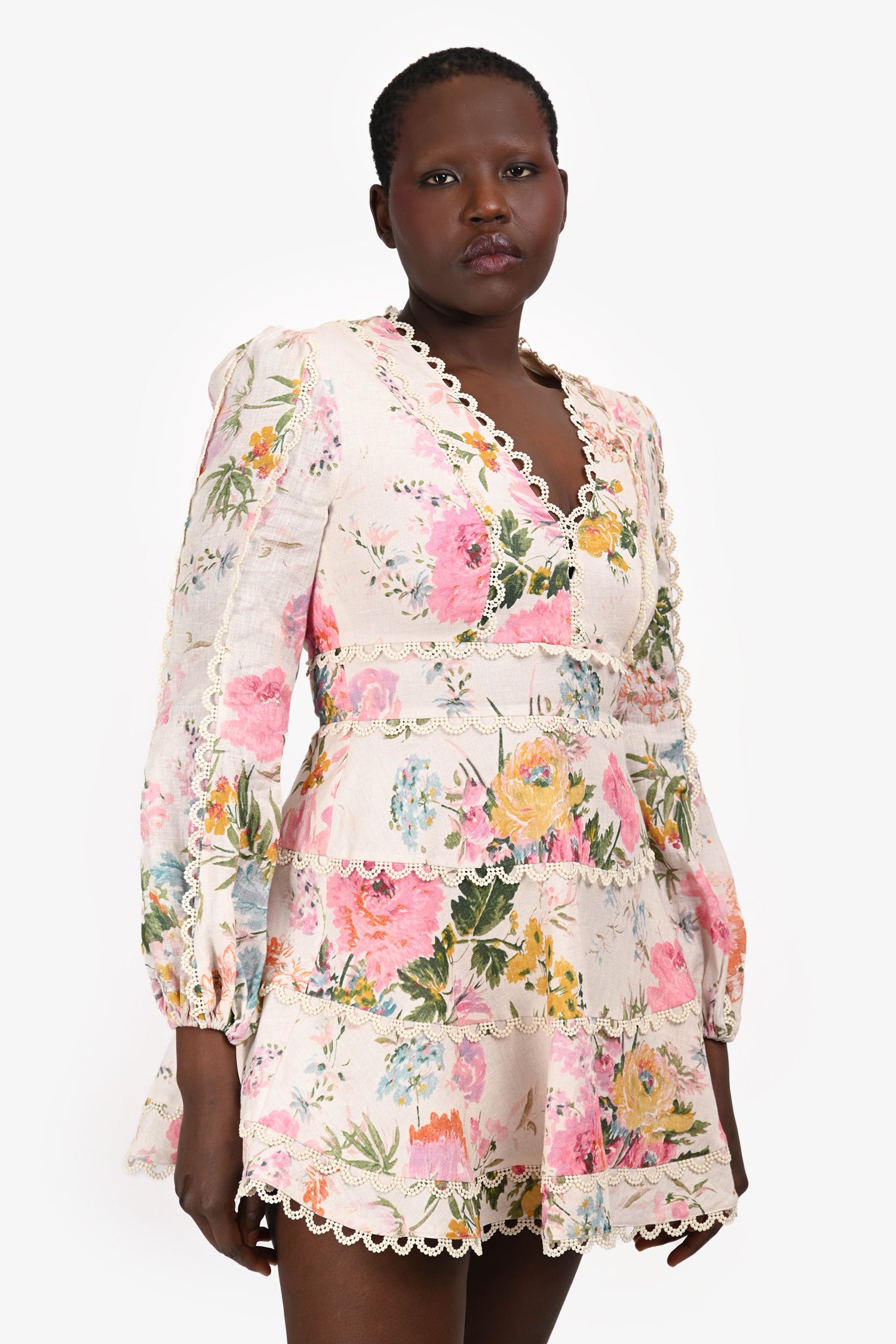 Refresh availabilityZimmermann Blush Floral Linen Crochet Trim V-Neck Mini Dress. Slip-on. Rear zip closure. Elasticized cuffs. Lined interior. Tonal stitching.