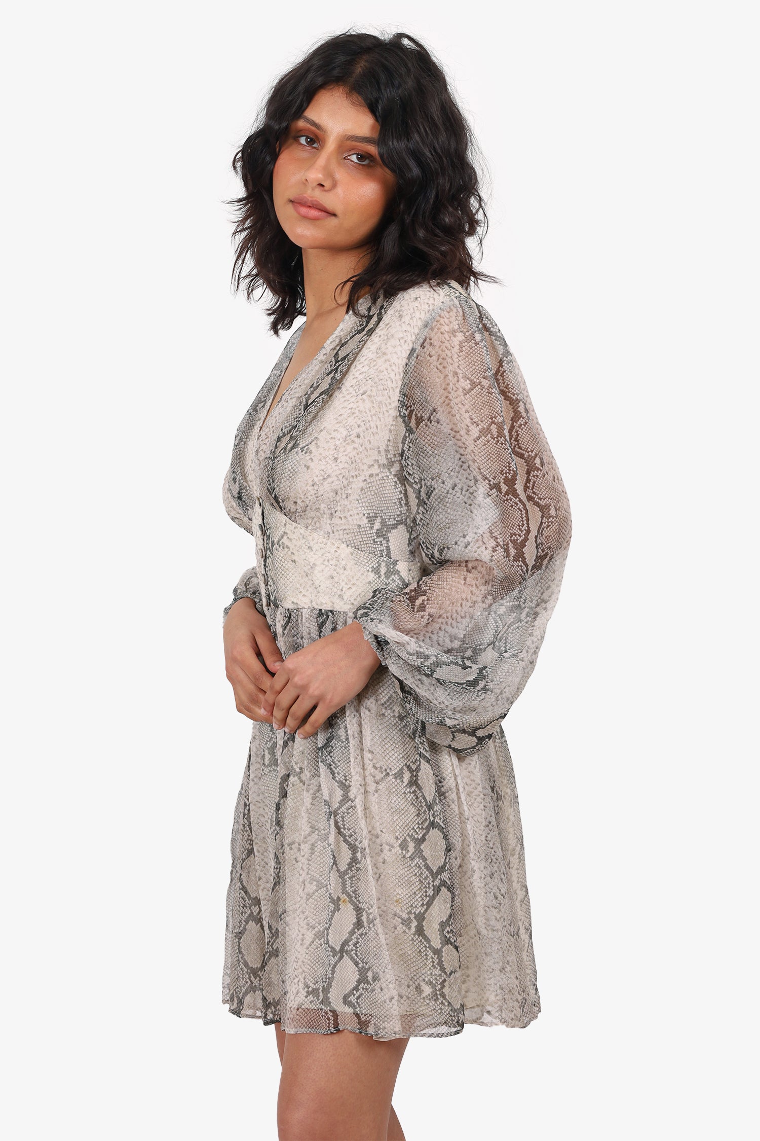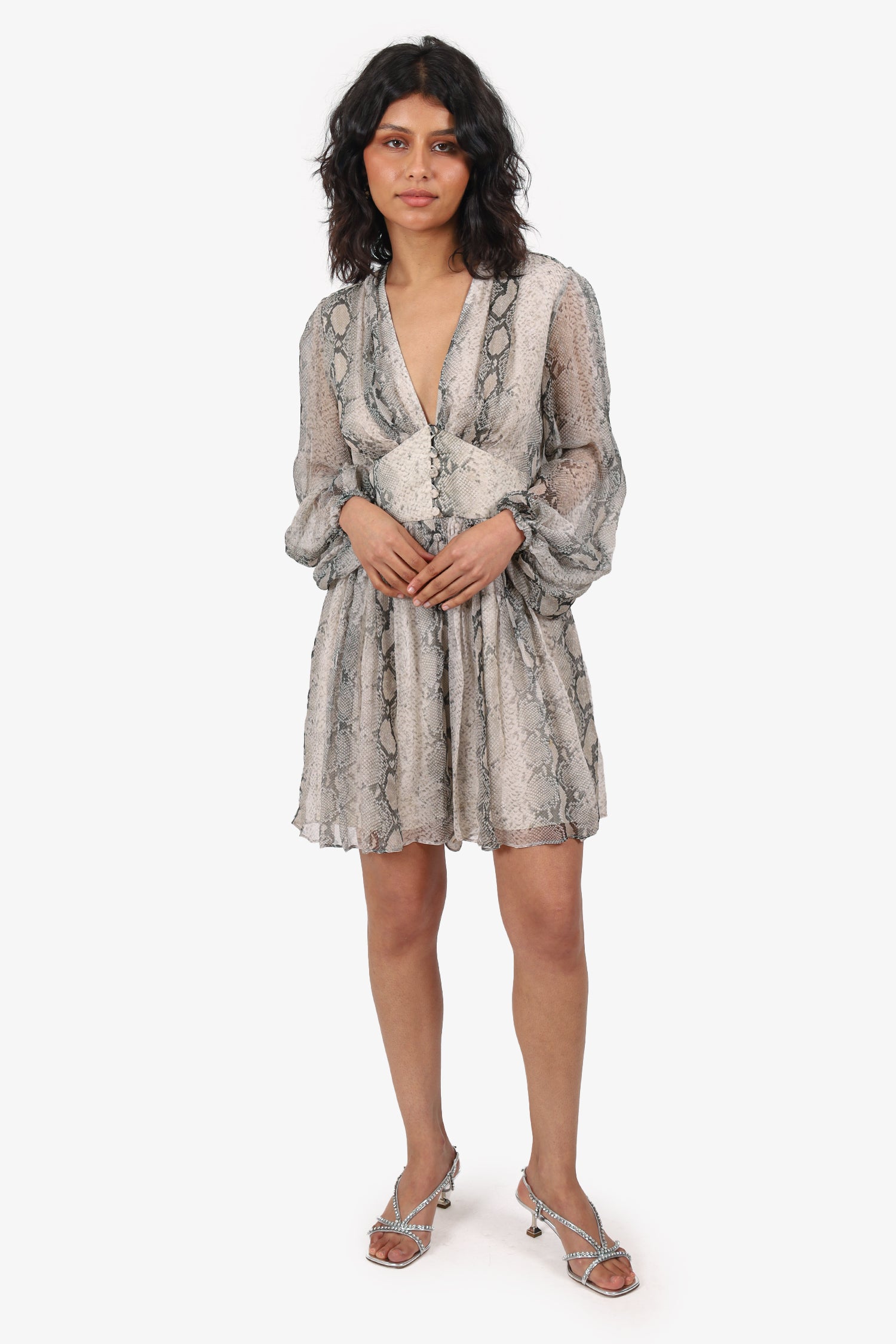 Refresh availabilityZimmermann Brown/Grey Silk Snake Print Long Sleeve V-Neck Mini Dress. Slip-on. V-neckline. Front button-up closure. Elasticated sleeve cuffs. Attached interior lining. Tonal stitching.