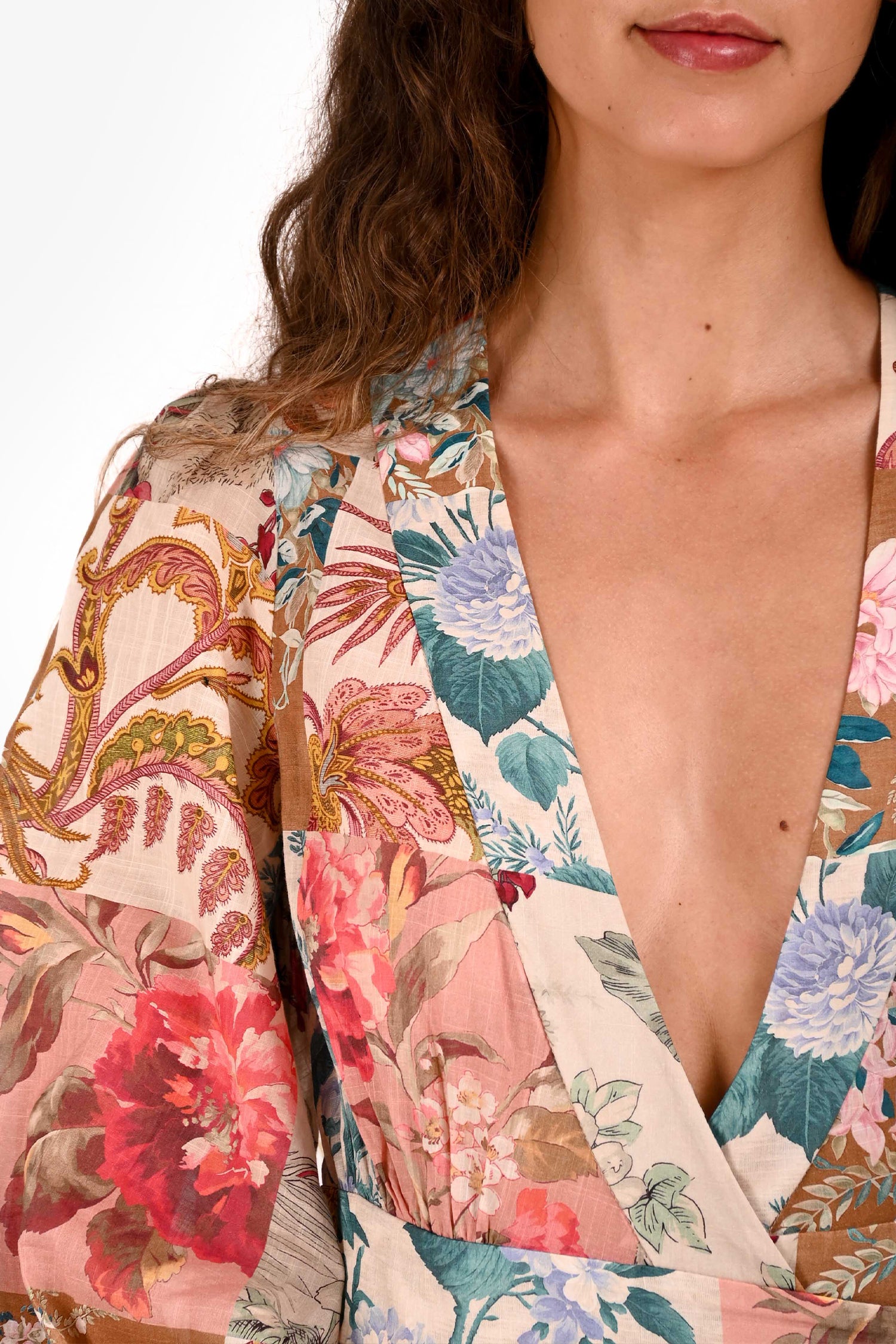 Refresh availabilityZimmermann Brown/Pink Linen Floral Wrap Maxi Dress. V-neckline. Long sleeves with elasticized cuffs. Wrap silhouette with waist tie. Tonal stitching.