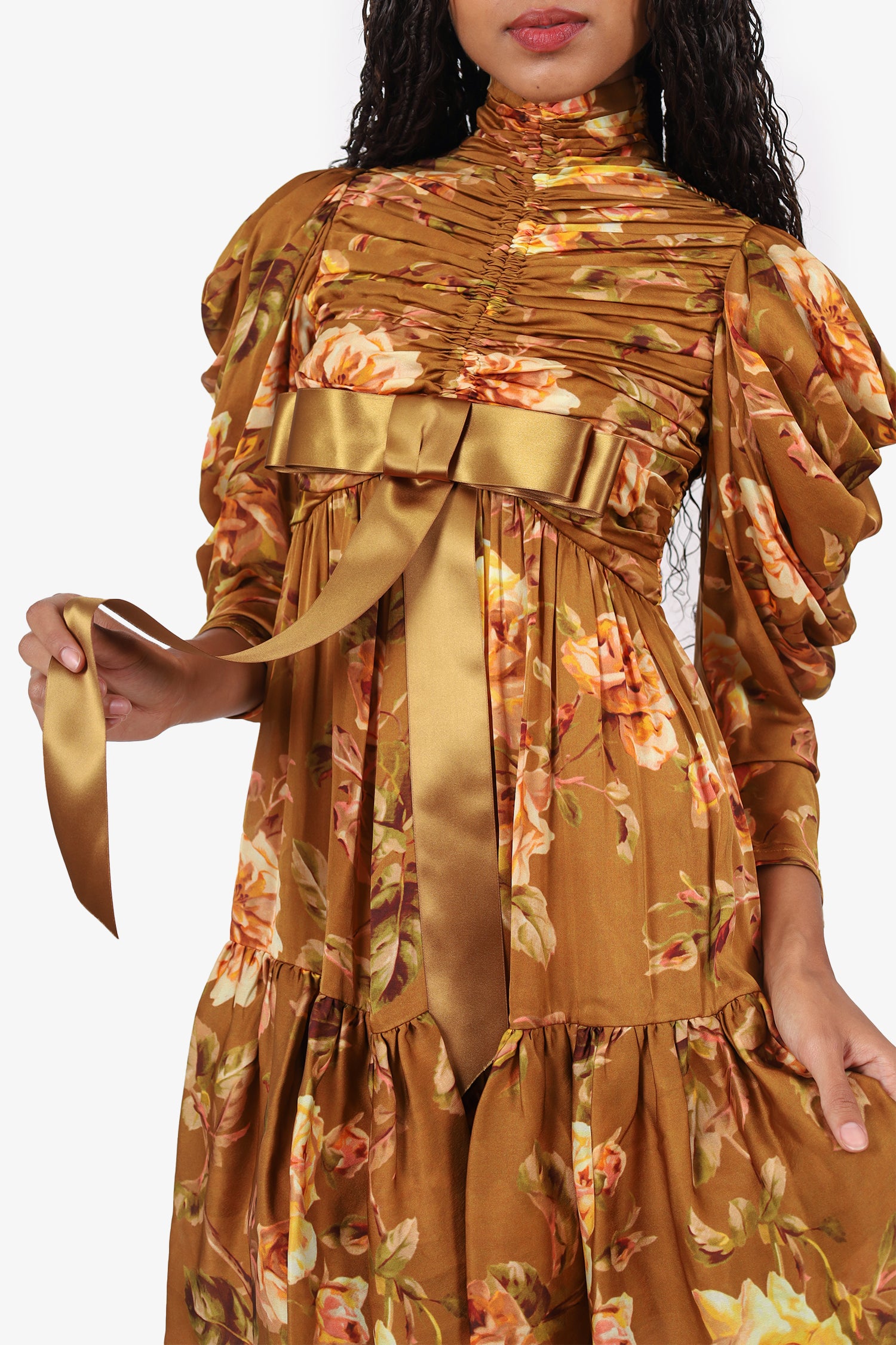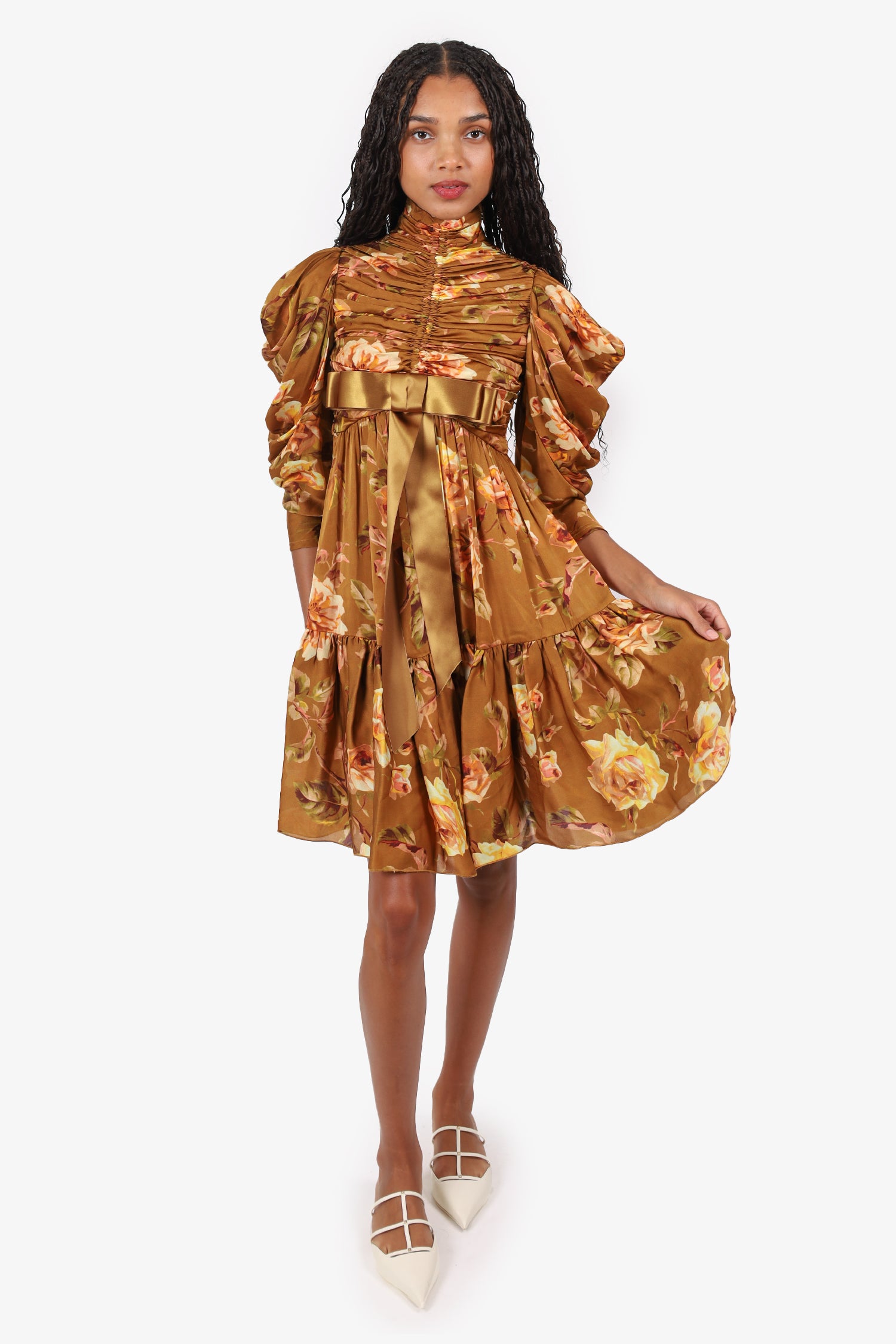 Refresh availabilityZimmermann Brown Silk-satin Floral-print Bow-detailed Ruched Mini Dress. Slip-on. Mock-neckline. Rear zip closure. Lined interior. Tonal stitching.