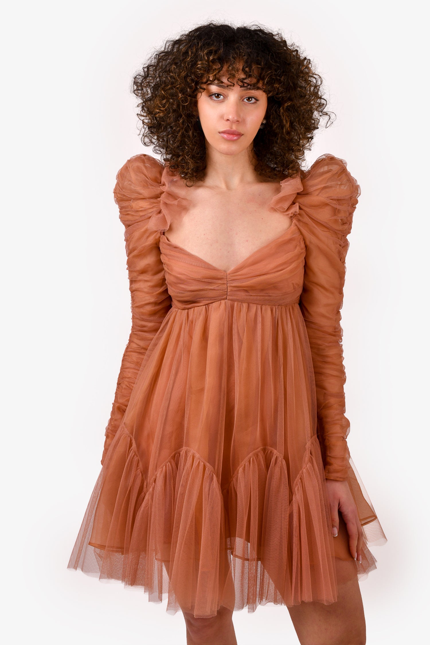 Refresh availabilityZimmermann Brown Tulle Ruched Mini Dress. Rear zip and hook closure. Lined. Tonal stitching.