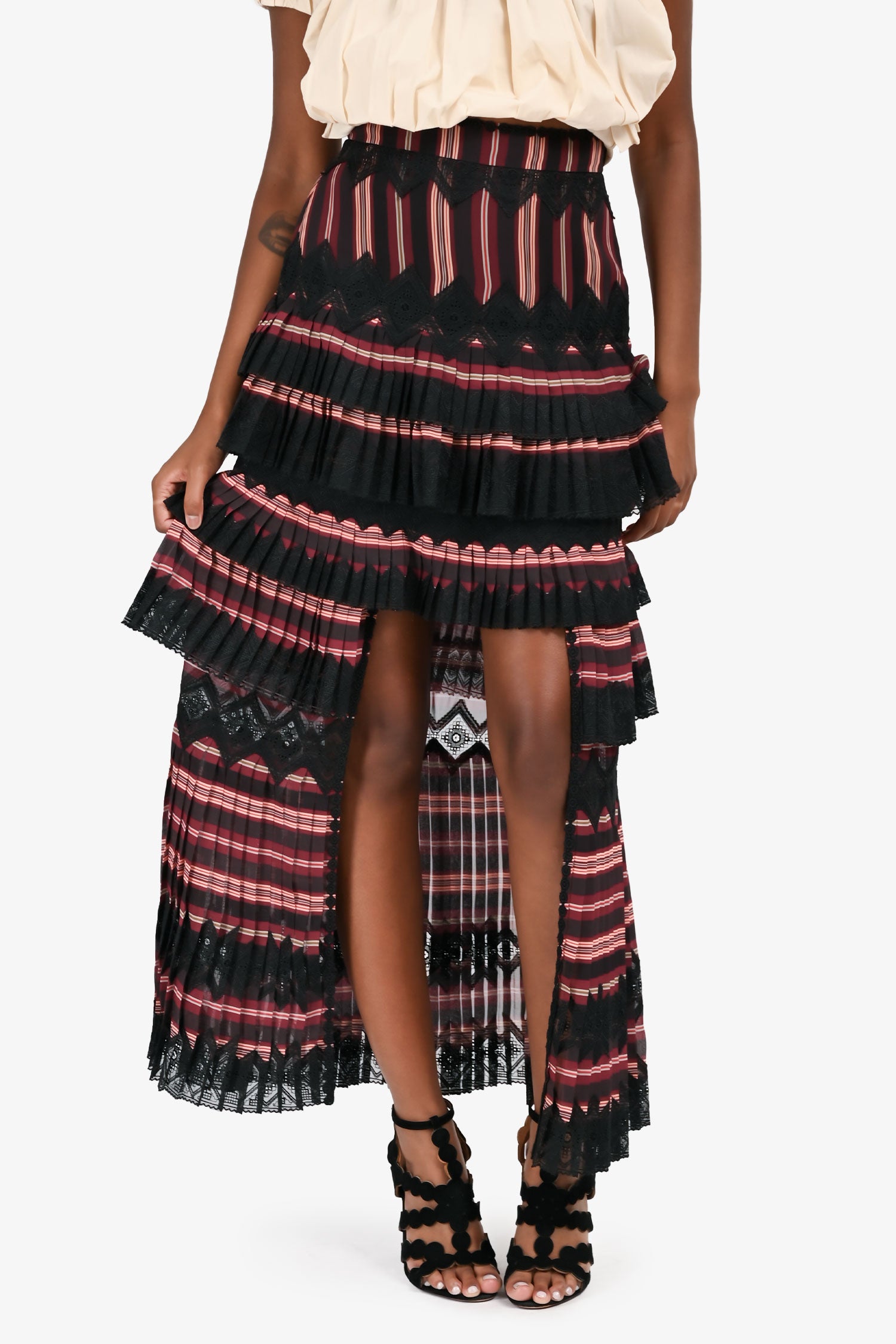 Refresh availabilityZimmermann Burgundy Black Lace Layered Open Front Skirt. Hidden side zip. Partially lined. Tonal stitching.