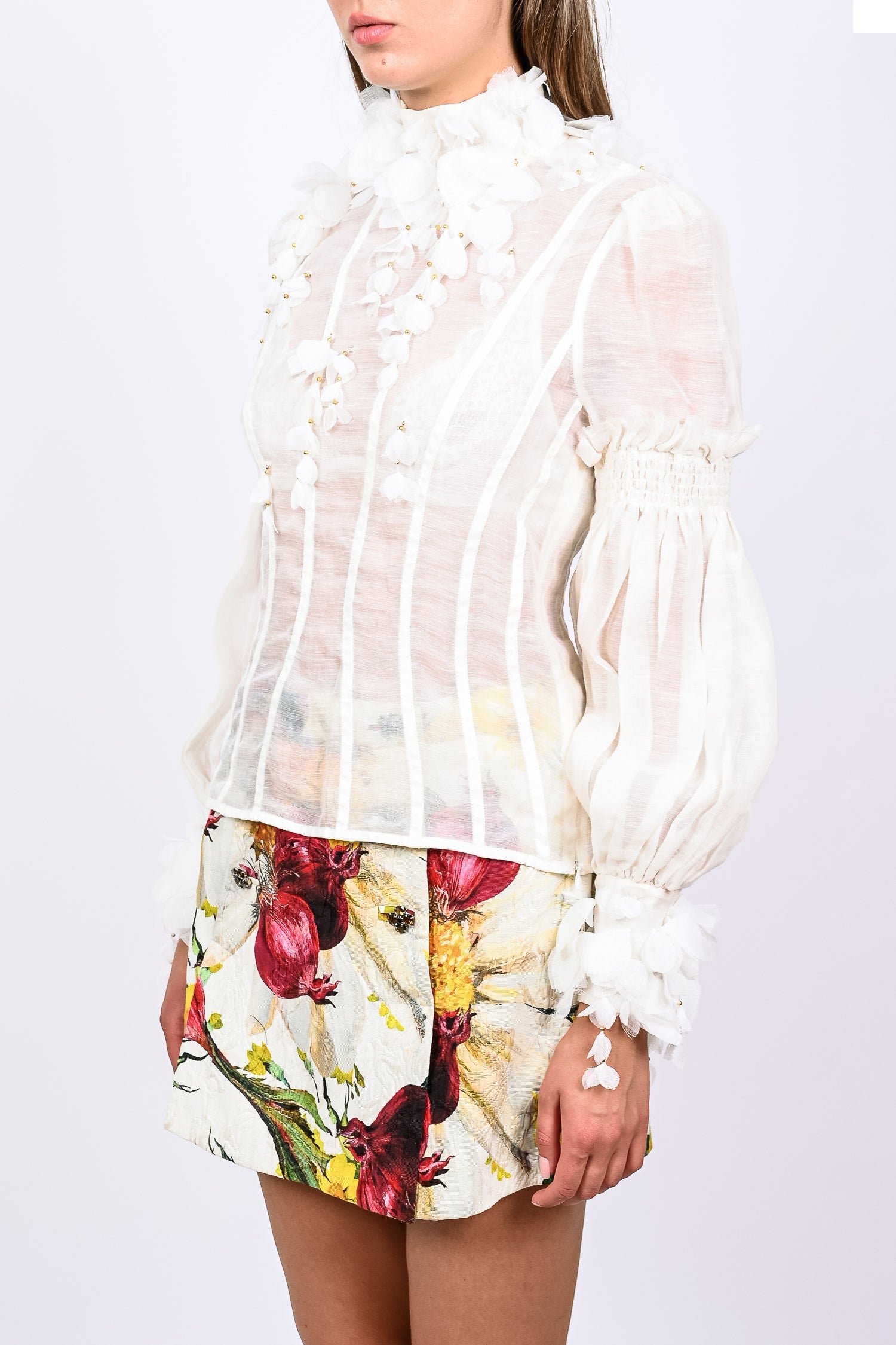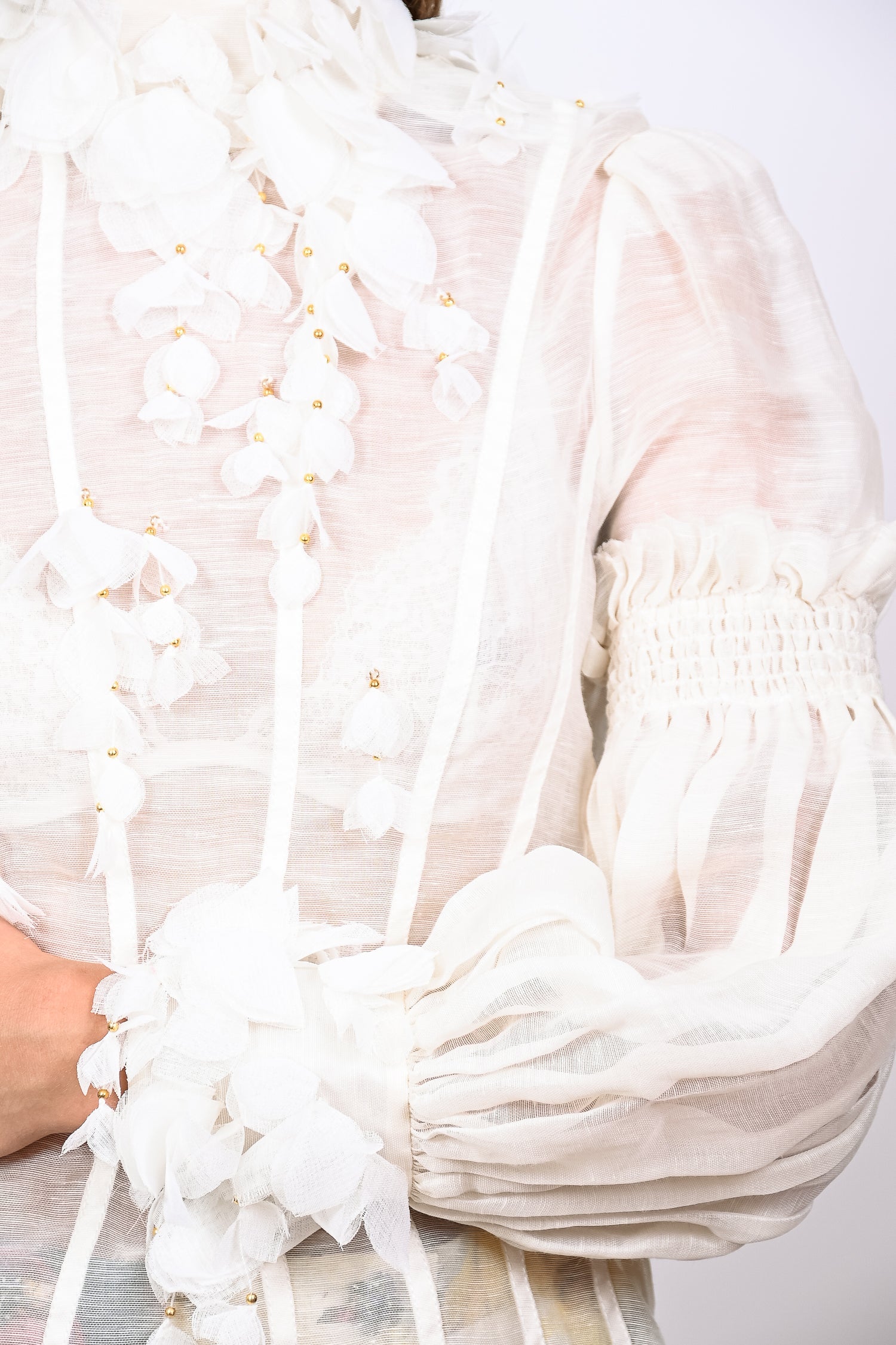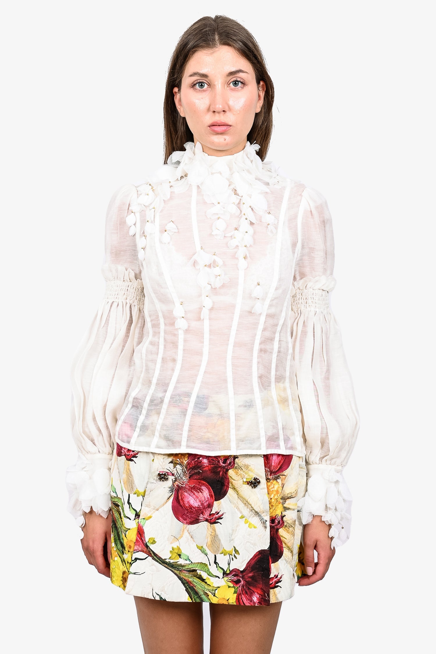 Refresh availabilityZimmermann Cream Linen/Silk Floral Detail 'Botanica' High Neck Blouse. Gold-toned bead detailing throughout. Back zip closure. Sheer. Unlined. Zipped cuffs. Tonal stitching.