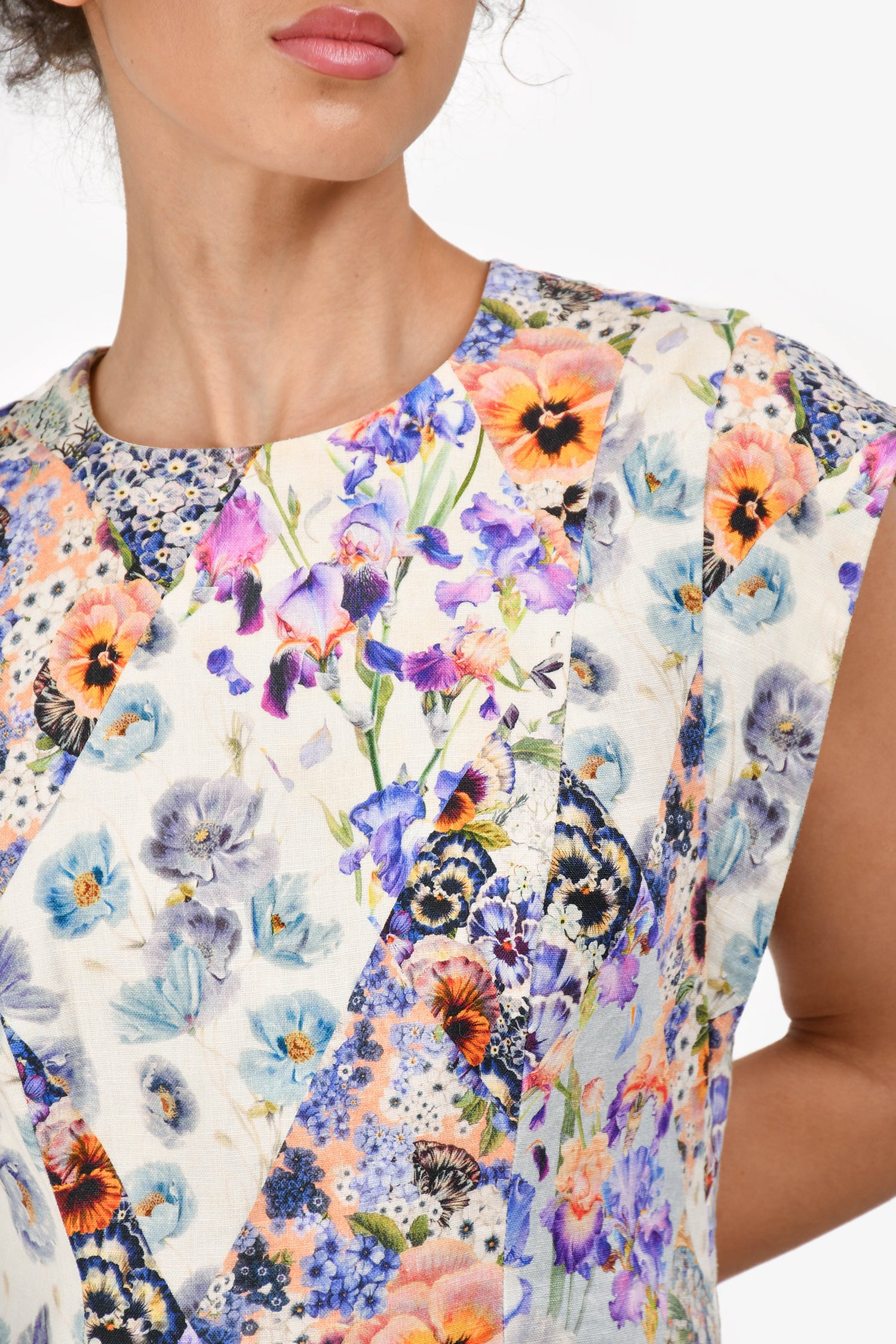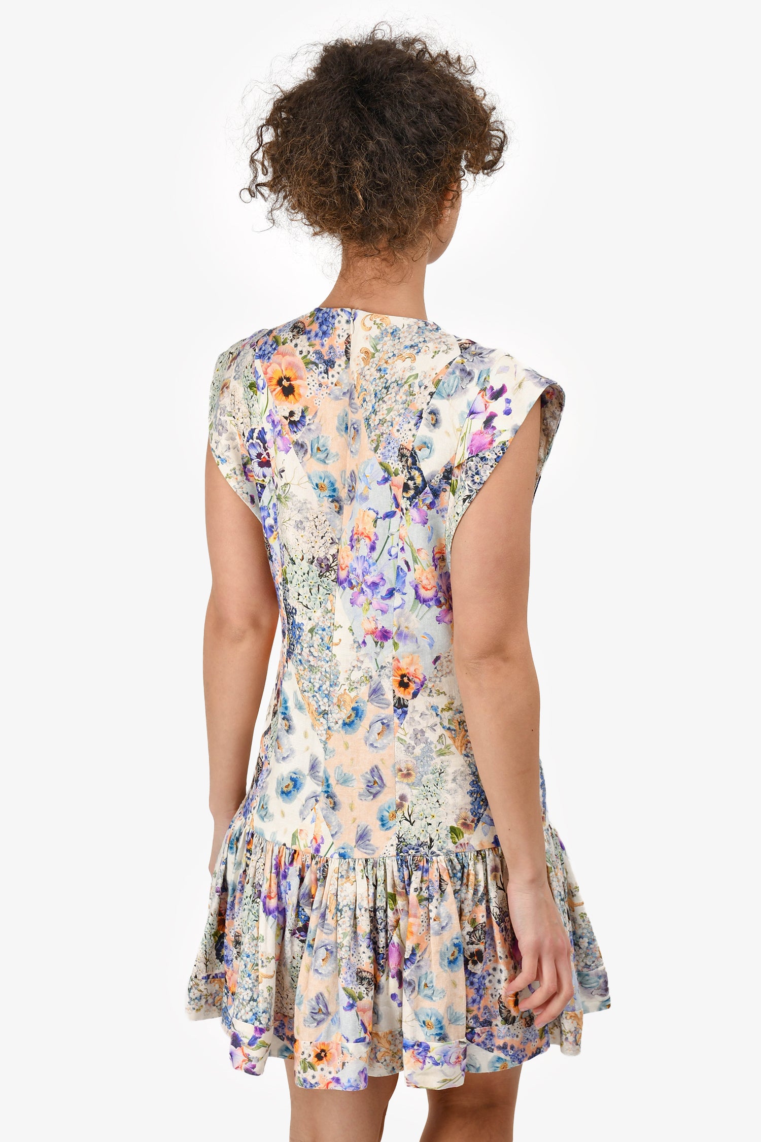 Refresh availabilityZimmermann Cream/Purple Multicolour Printed Ruffled Hem Mini Dress. Rear zip closure. Ruffled hemline. Lined. Tonal stitching.