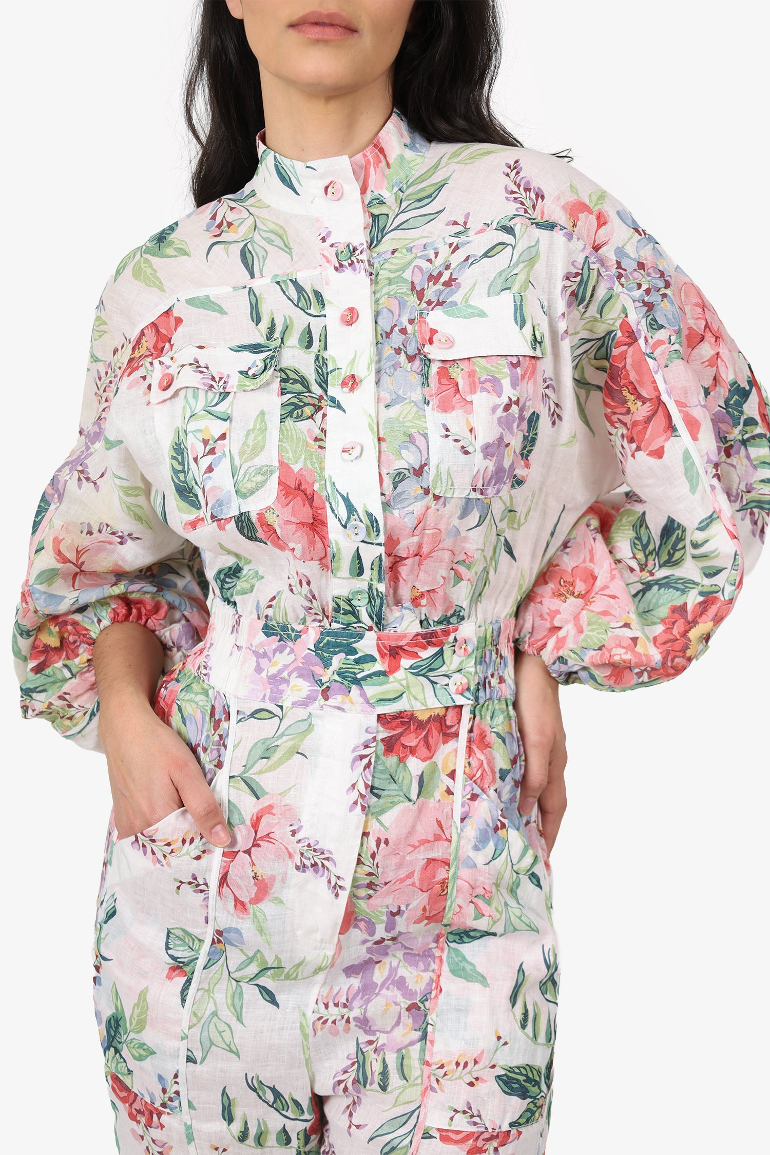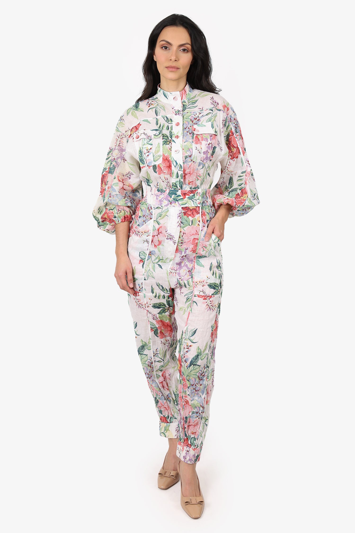 Refresh availabilityZimmermann Cream/Pink Linen Floral Print Jumpsuit. Pull-on. Collared neckline. Front button-up and zip up closure. Button-up waistband. 4 exterior pockets: 2 front fold-over flap with button-up closure and 2 side slip pockets. Elasticized sleeve cuffs and ankle cuffs. Gold-tone hardware. Tonal stitching.