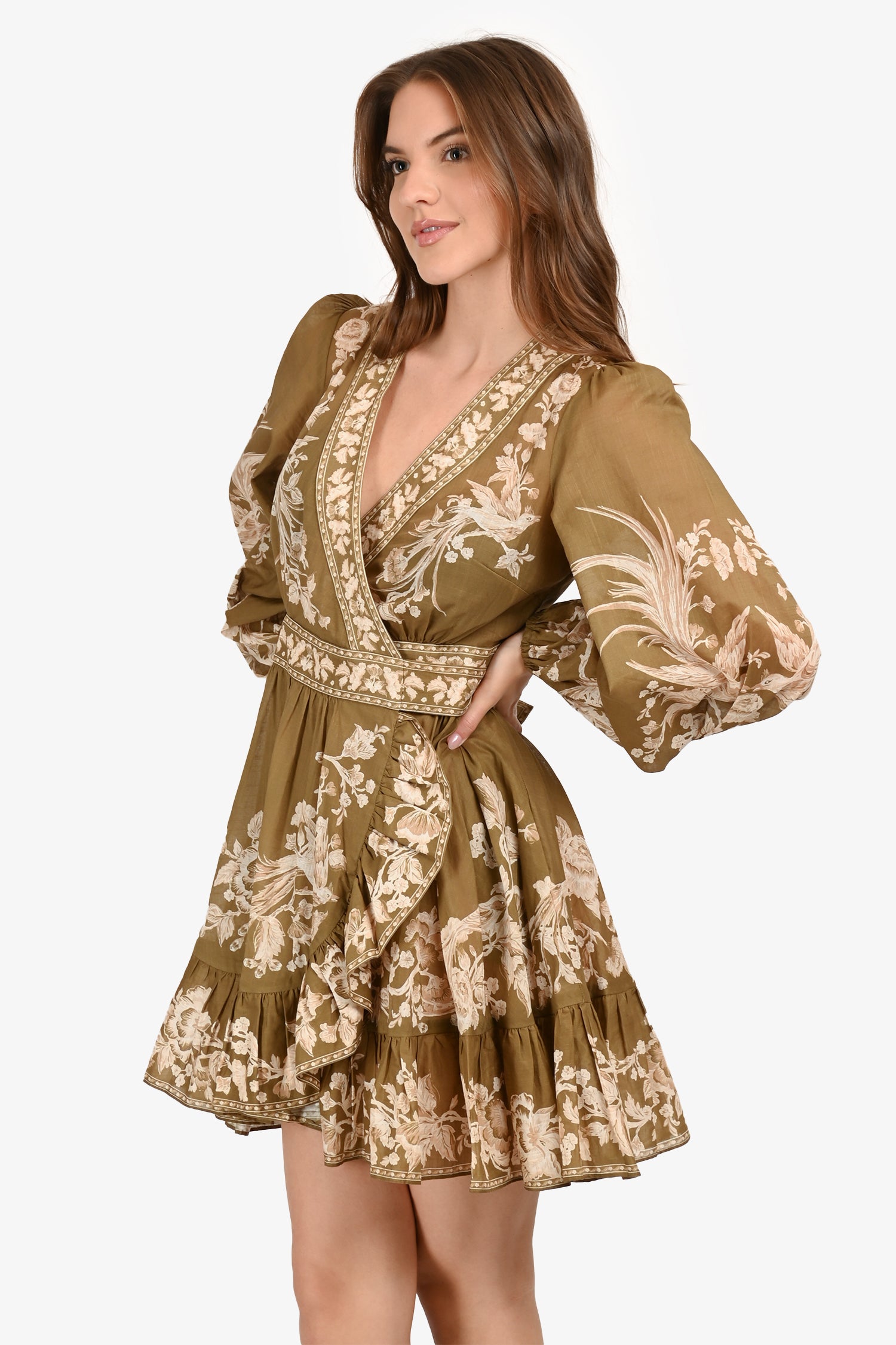 Refresh availabilityZimmermann Green Cotton Floral Printed Mini Wrap Dress. Slip-on. V-neckline. Wrap-style front with self-tie waist closure. 2 side seam pockets. Gathered shoulders with elasticized cuffs. Unlined. Tonal stitching.