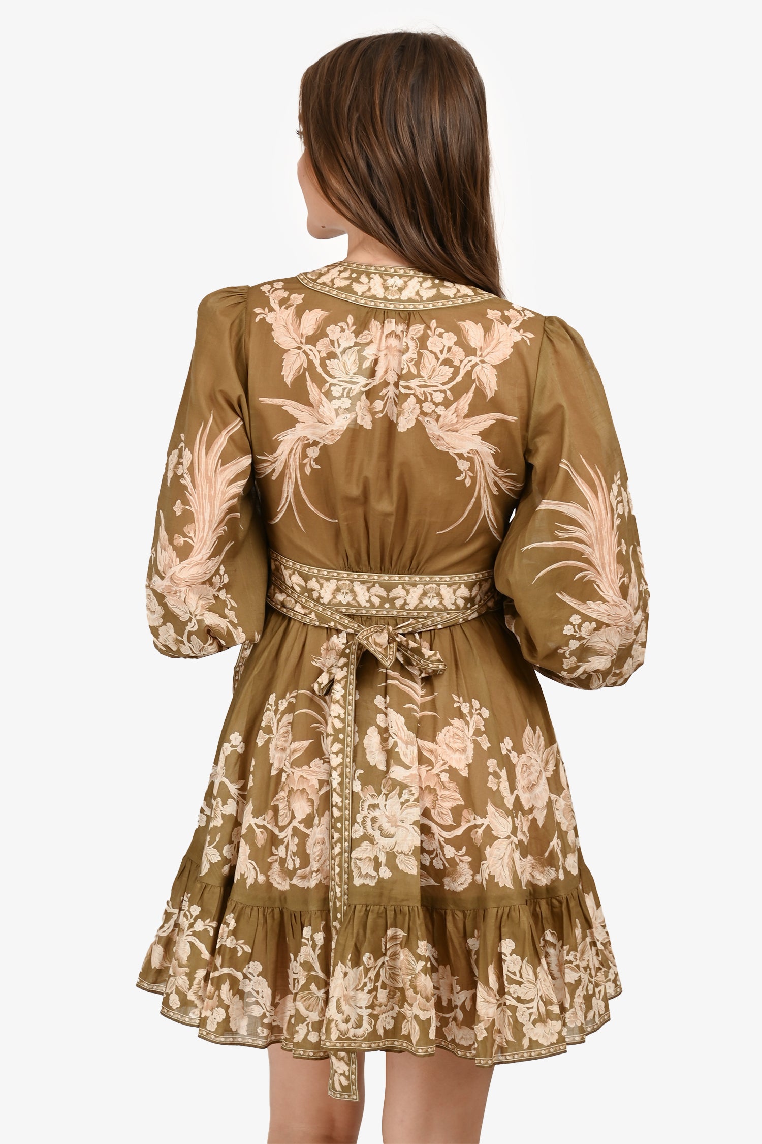 Zimmermann Green Cotton Floral Printed Long Sleeve Mini Wrap Dress Size 0