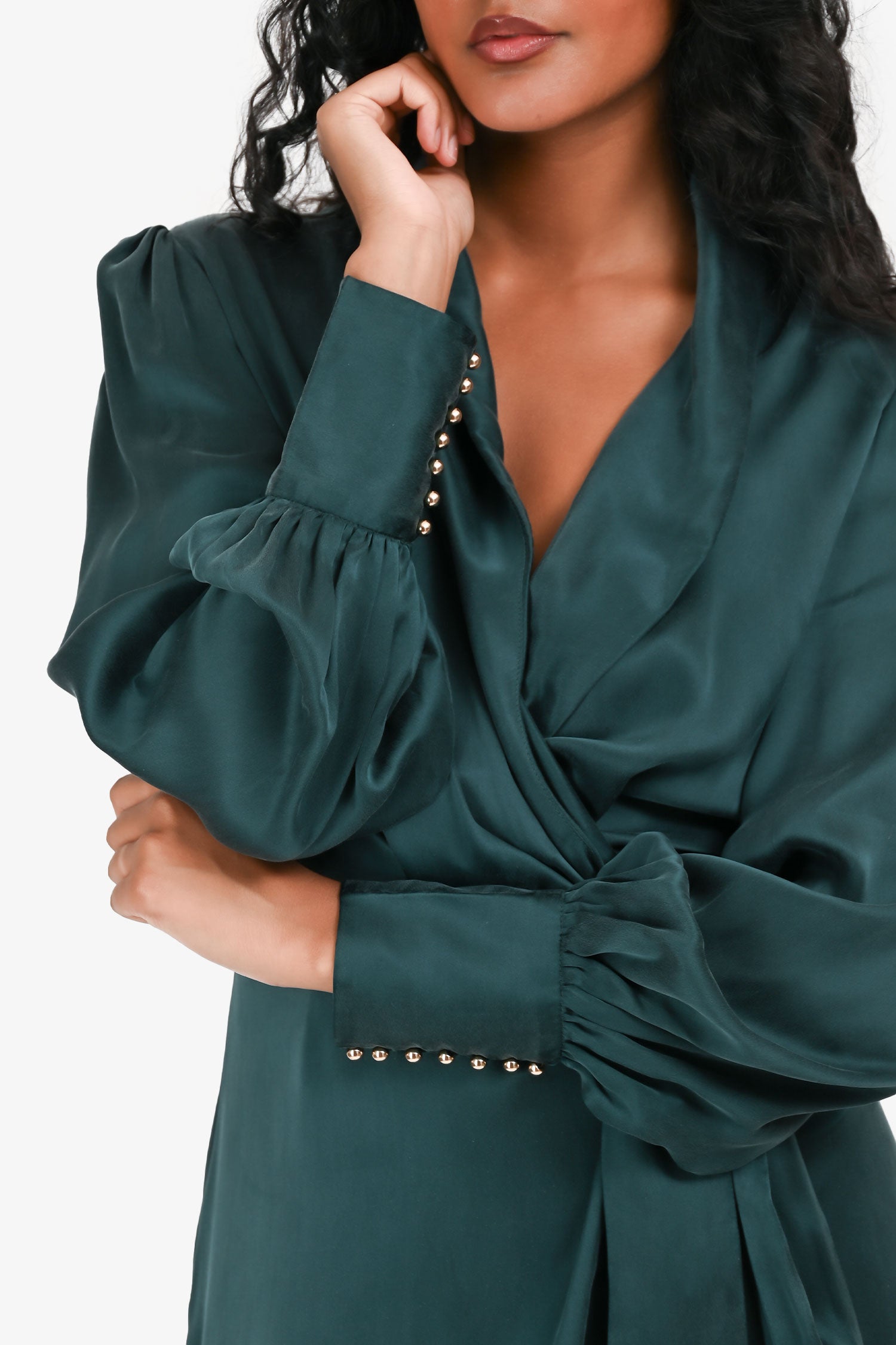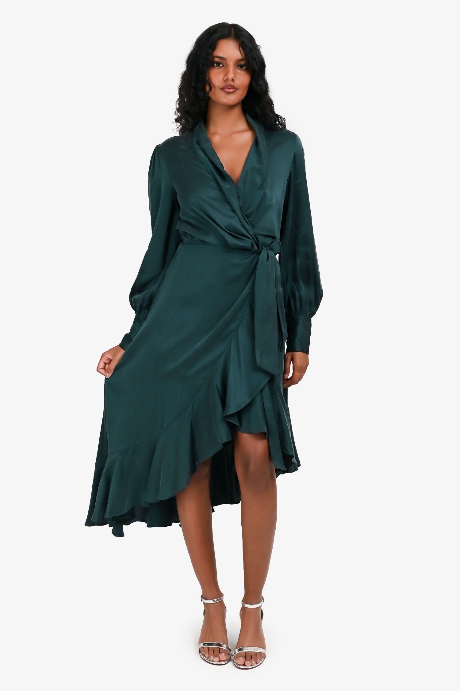 Refresh availabilityZimmermann Green Ruffled Long Sleeves Wrap Dress. V-neckline. Wrap silhouette with adjustable waist tie. Long sleeves with buttoned cuffs. Ruffle detailing along hem and neckline. Tonal stitching.