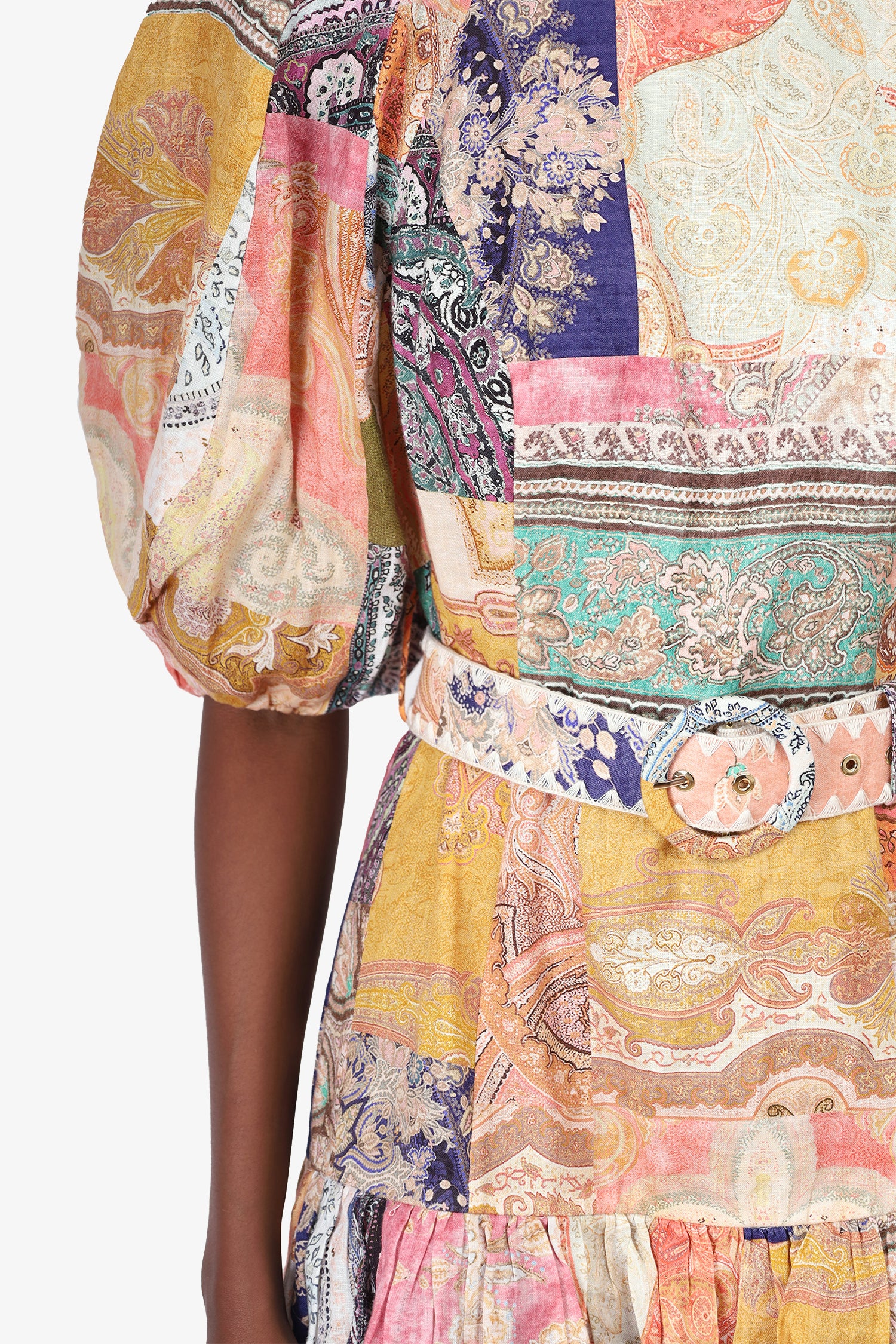 Refresh availabilityZimmermann Multicolour Paisley Patchwork 'Anneke' Ruffle Hem Mini Dress With Belt. Round neckline. Back zip closure. Removable / adjustable belt. Partially lined. Tonal stitching.