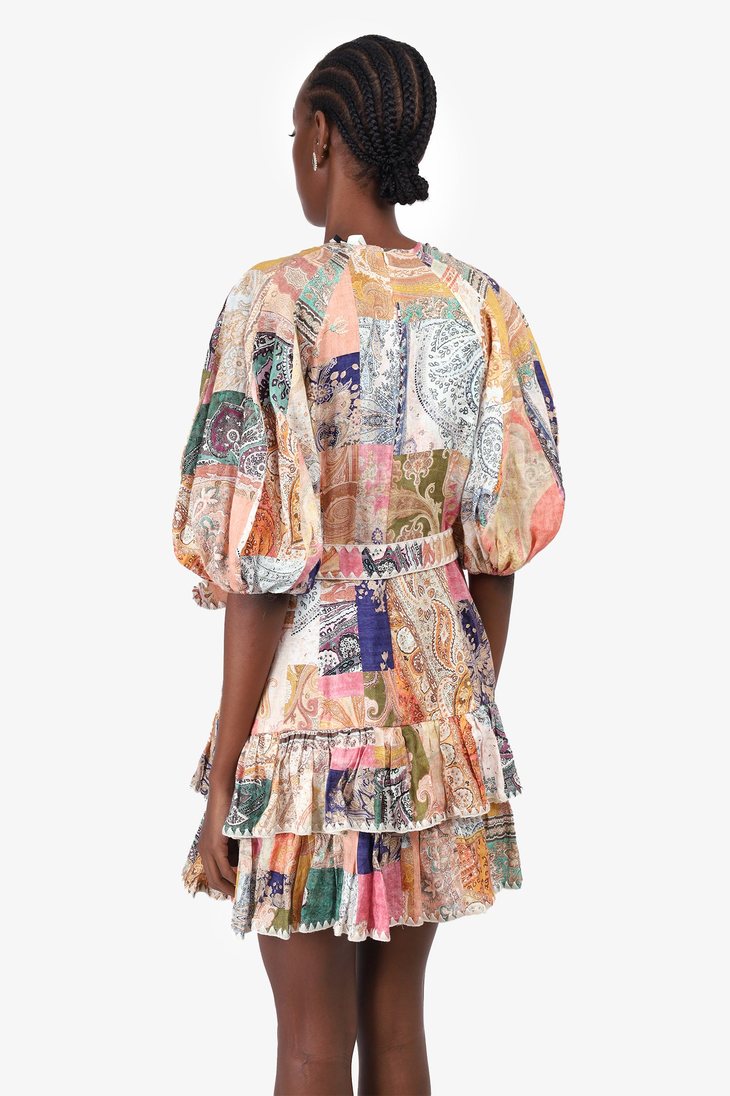 Zimmermann Multicolour Paisley Patchwork 'Anneke' Ruffle Hem Mini Dress With Belt Size 2