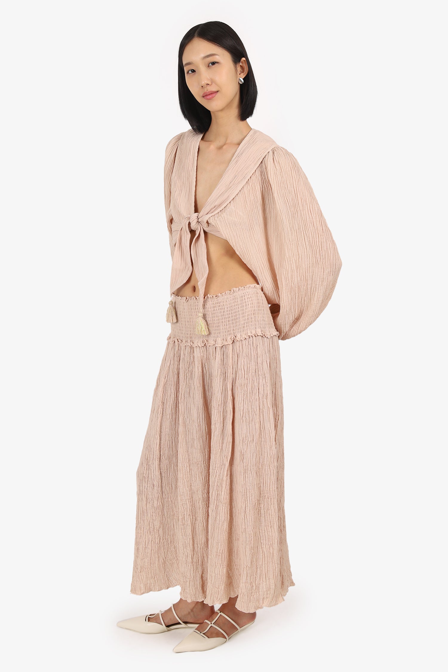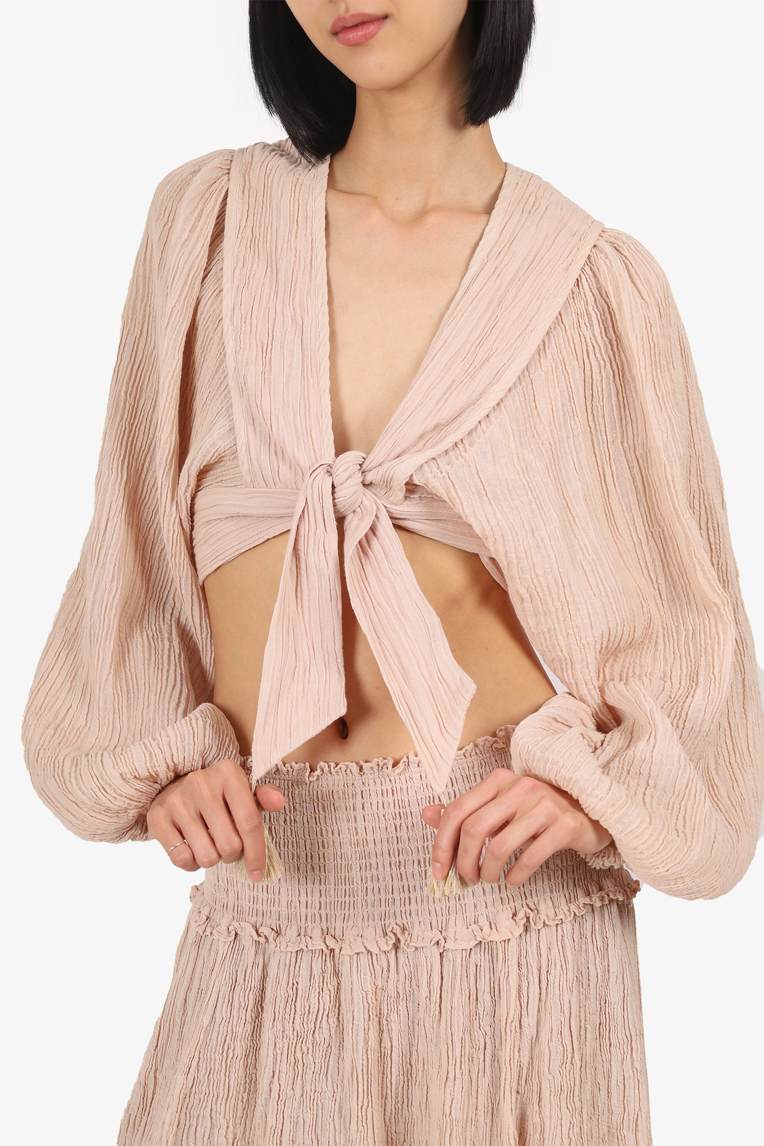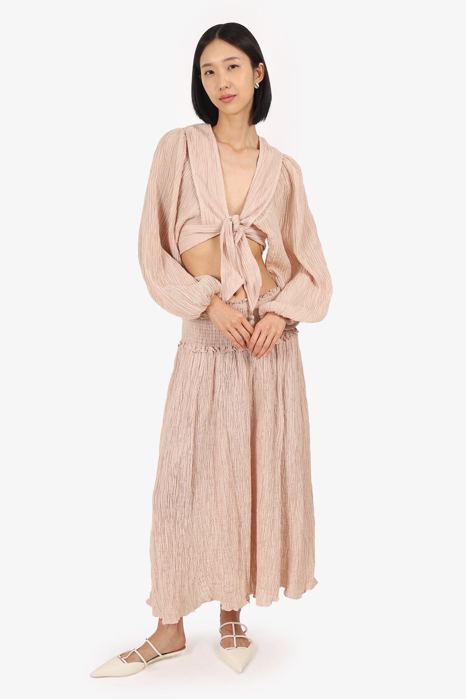 Refresh availabilityZimmermann Nude Bayou Tie Front Top With Midi Skirt Set. Top: Pull-on. Tie-up closure on front. Elasticated sleeve cuffs; Skirt: Slip-on. Elasticated and smocked waistband. Tonal stitching.