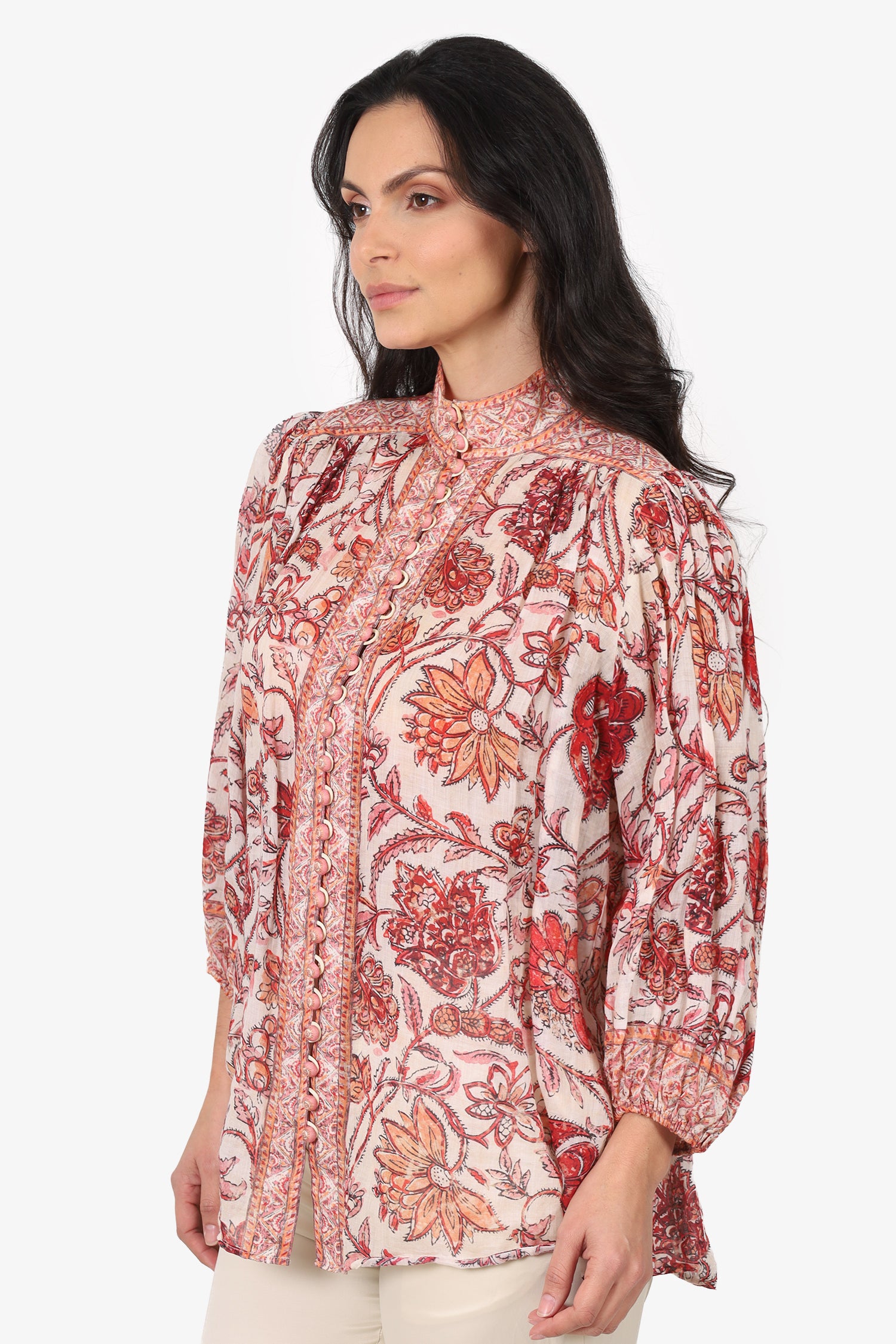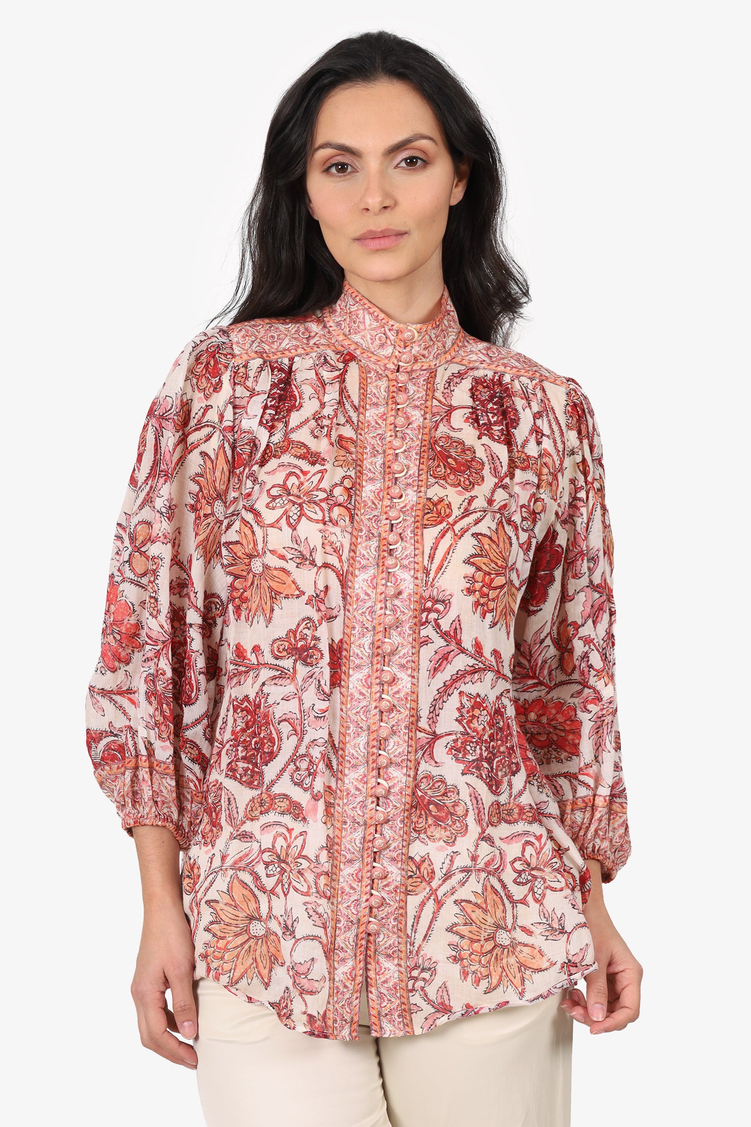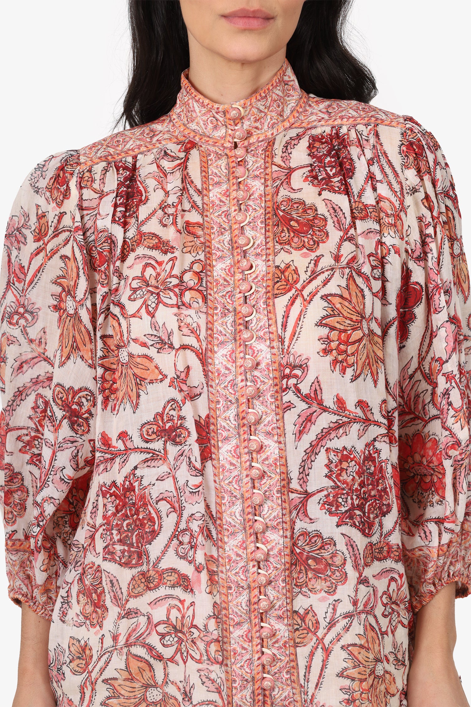 Refresh availabilityZimmermann Red/White Vitali Floral Ramie Blouse. Pull-on. High neckline. Front button-up closure. Elasticated sleeve cuffs. Gold-tone hardware. Tonal stitching.