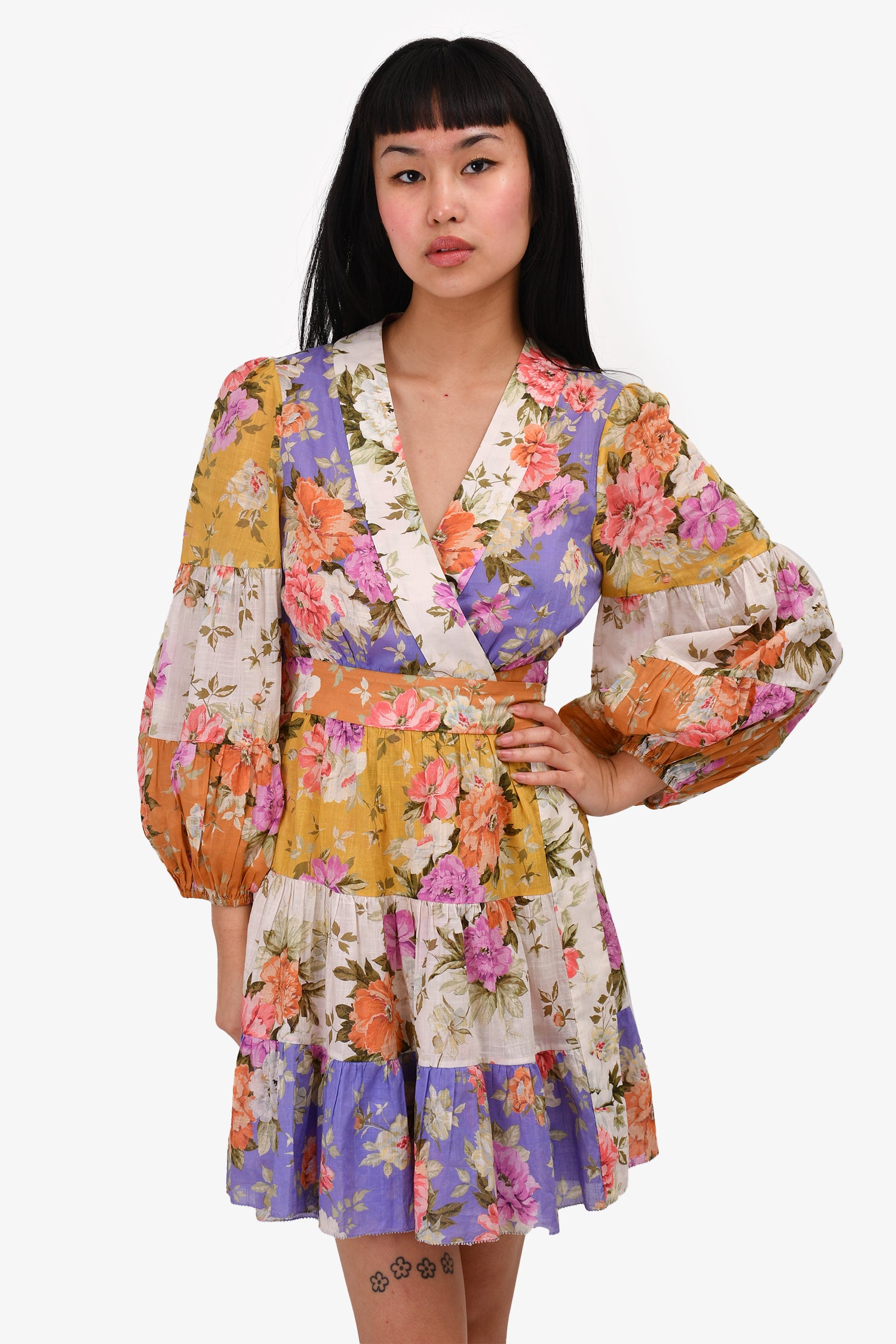 Refresh availabilityZimmermann Purple/Yellow Floral Cotton 'Pattie' Wrap Mini Dress. V-neck. Pull-on. Elasticized cuffs. Wrap closure. Unlined.