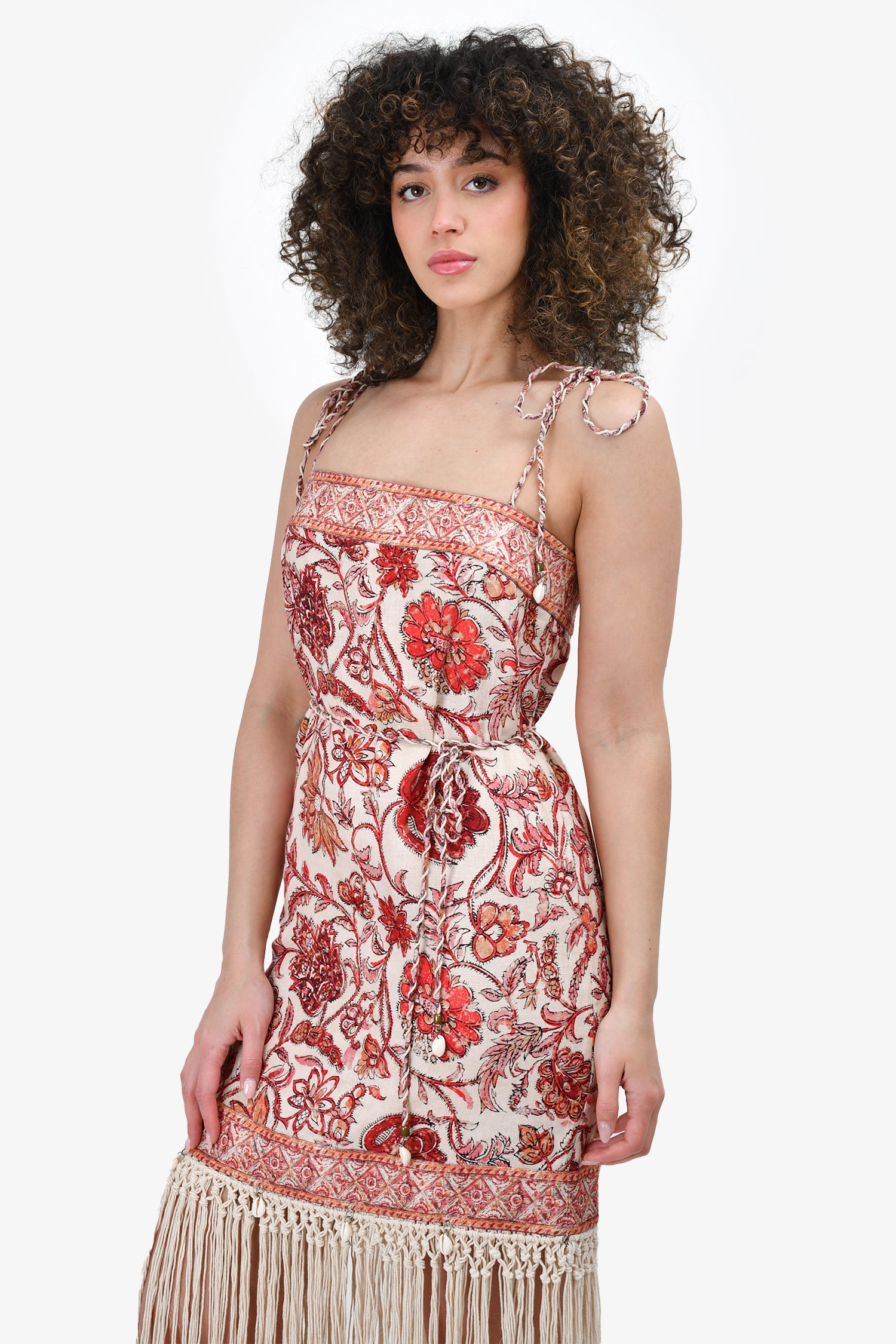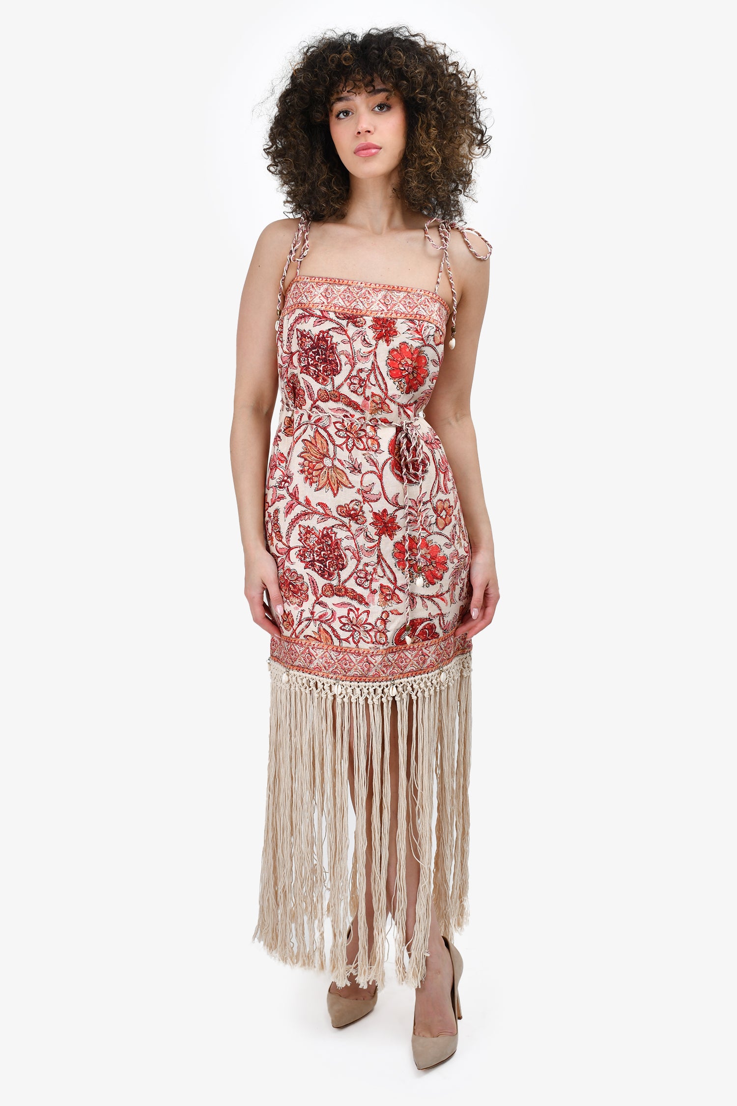 Refresh availabilityZimmermann Red/Beige Floral Printed Fringe Hemmed Dress. Rear zip closure. Lined. Tie-up straps.