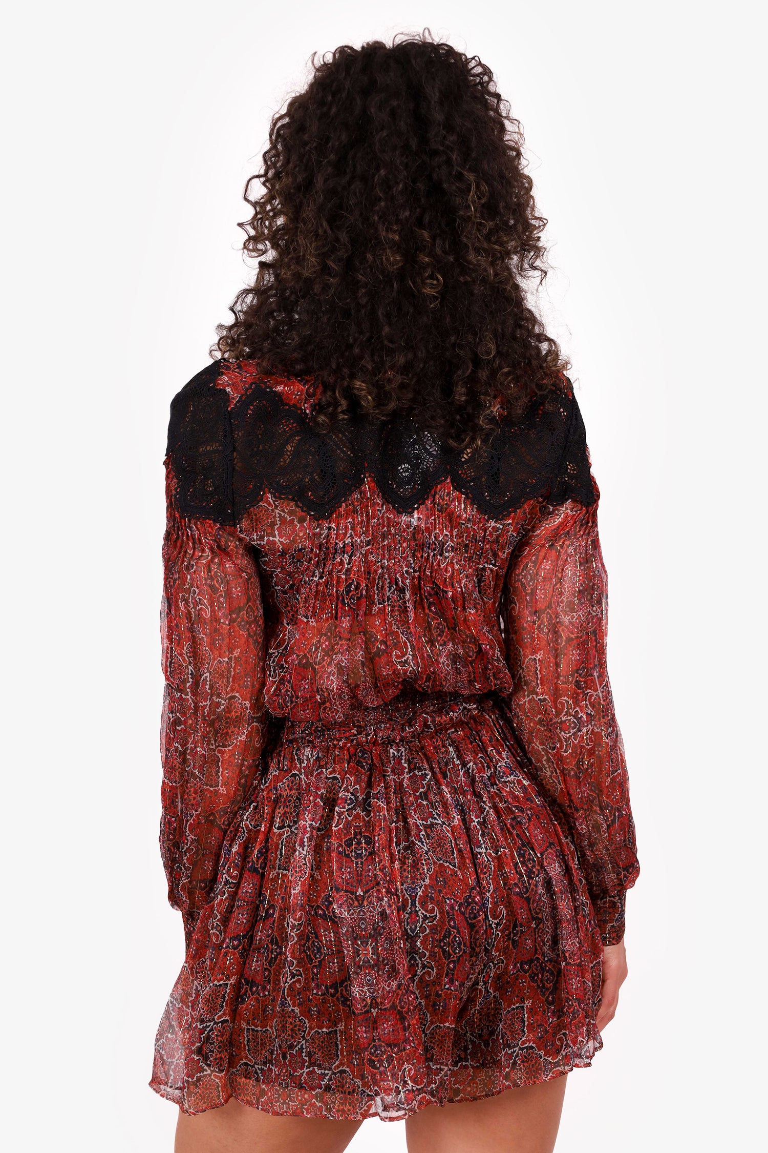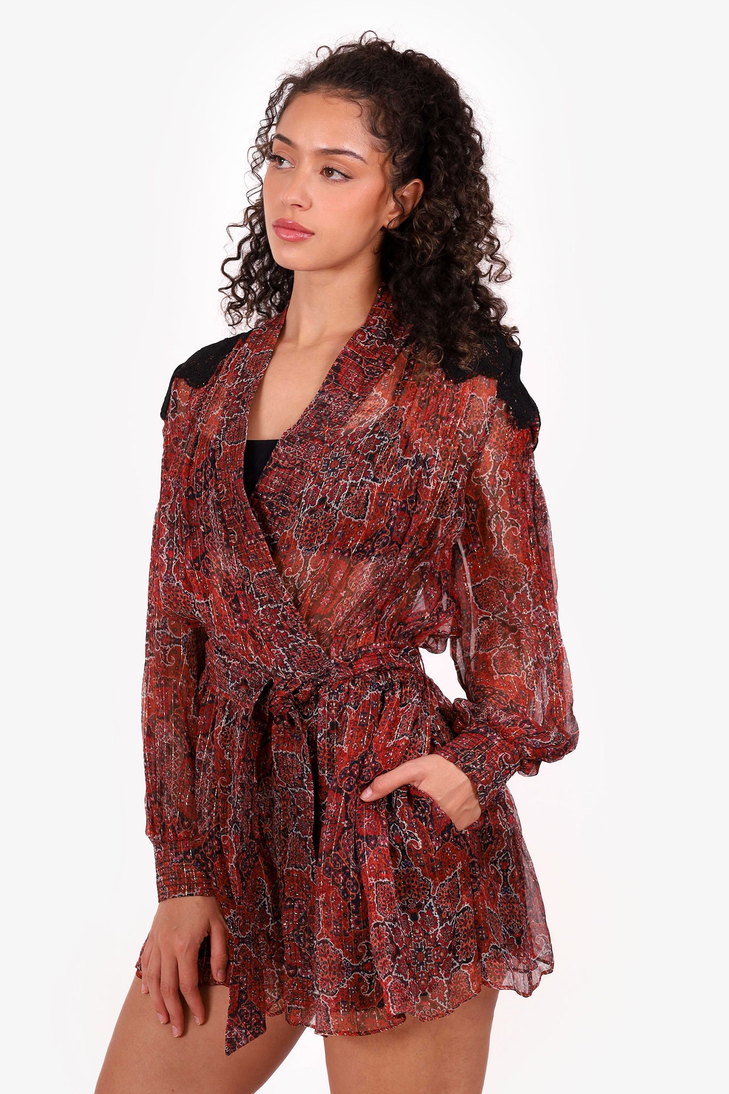 Refresh availabilityZimmermann Red/Black Empire Filigree Romper. Slip-on. V-neckline. Elasticated waistband. Removable belt with tie-up closure at waistband. Sleeve cuffs with button-up closure. Bronze-tone hard.ware. Tonal stitching.