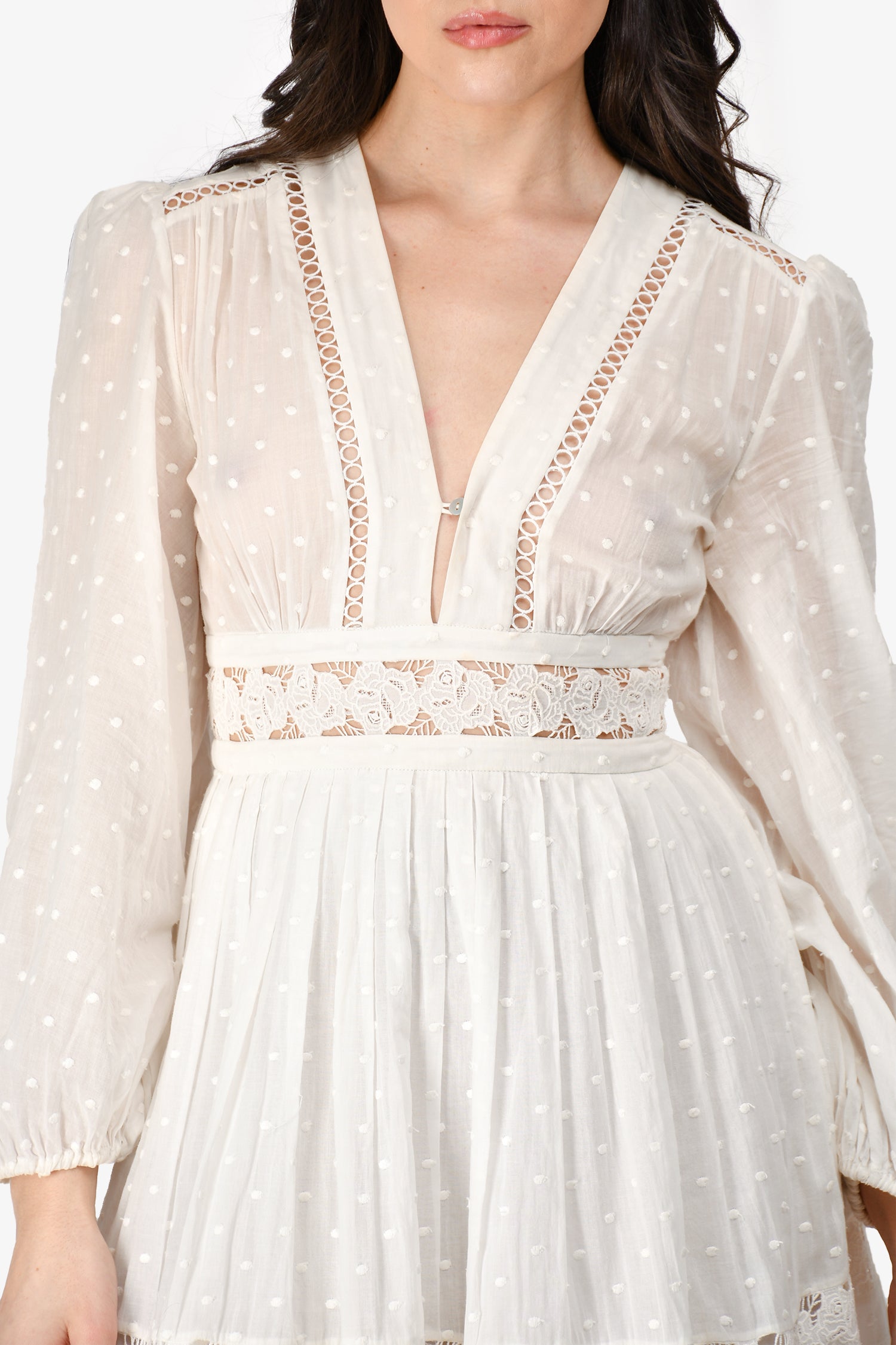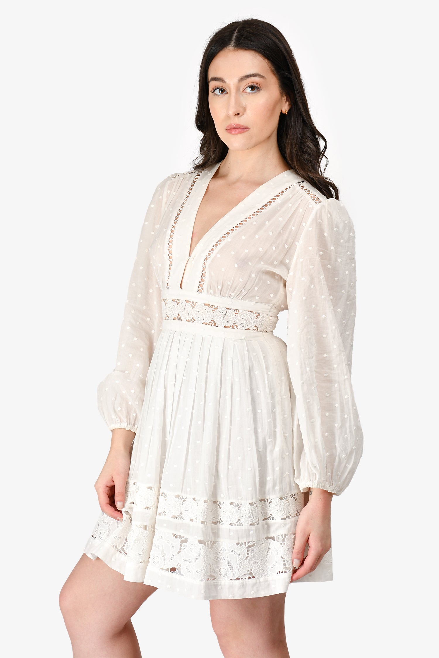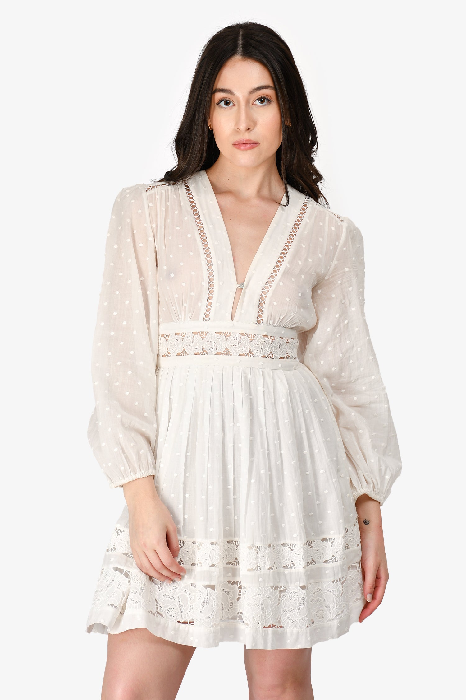 Zimmermann White Cotton Dotted Crochet Detailed V-Neck Long Sleeve Mini Dress Size 1