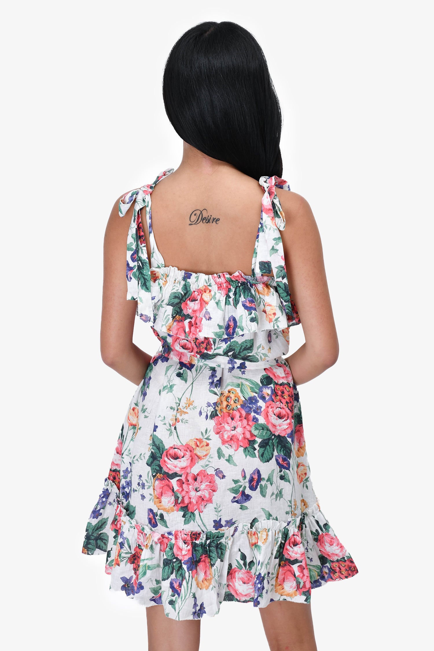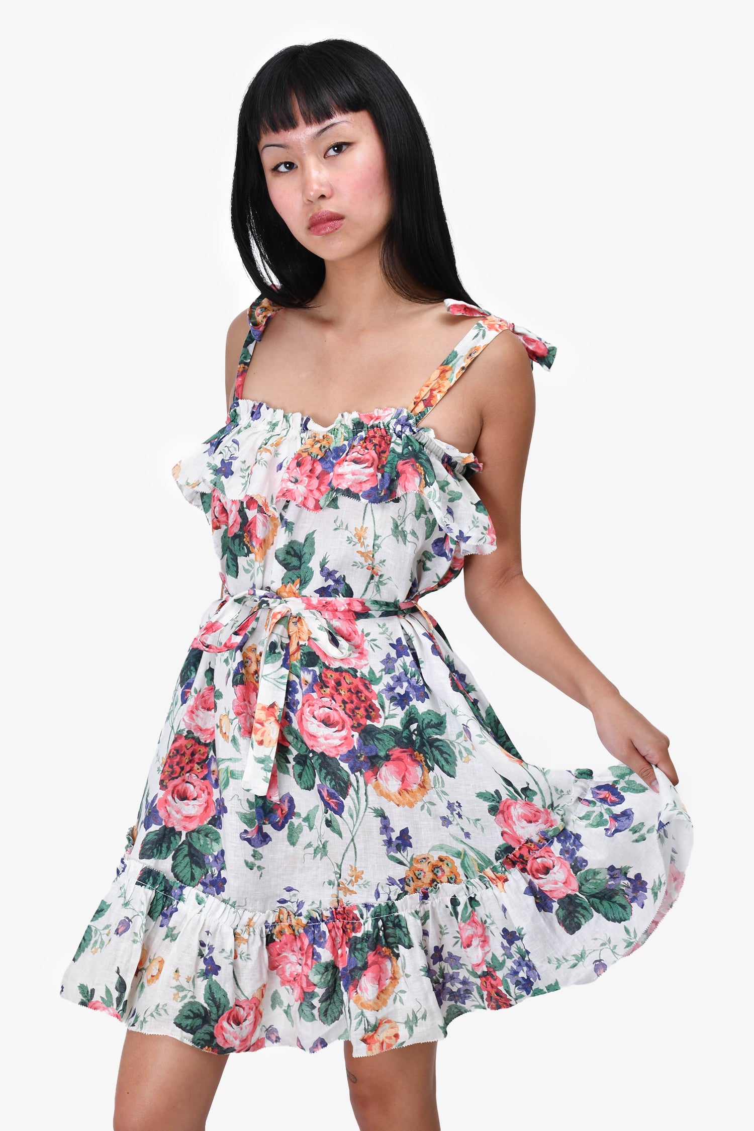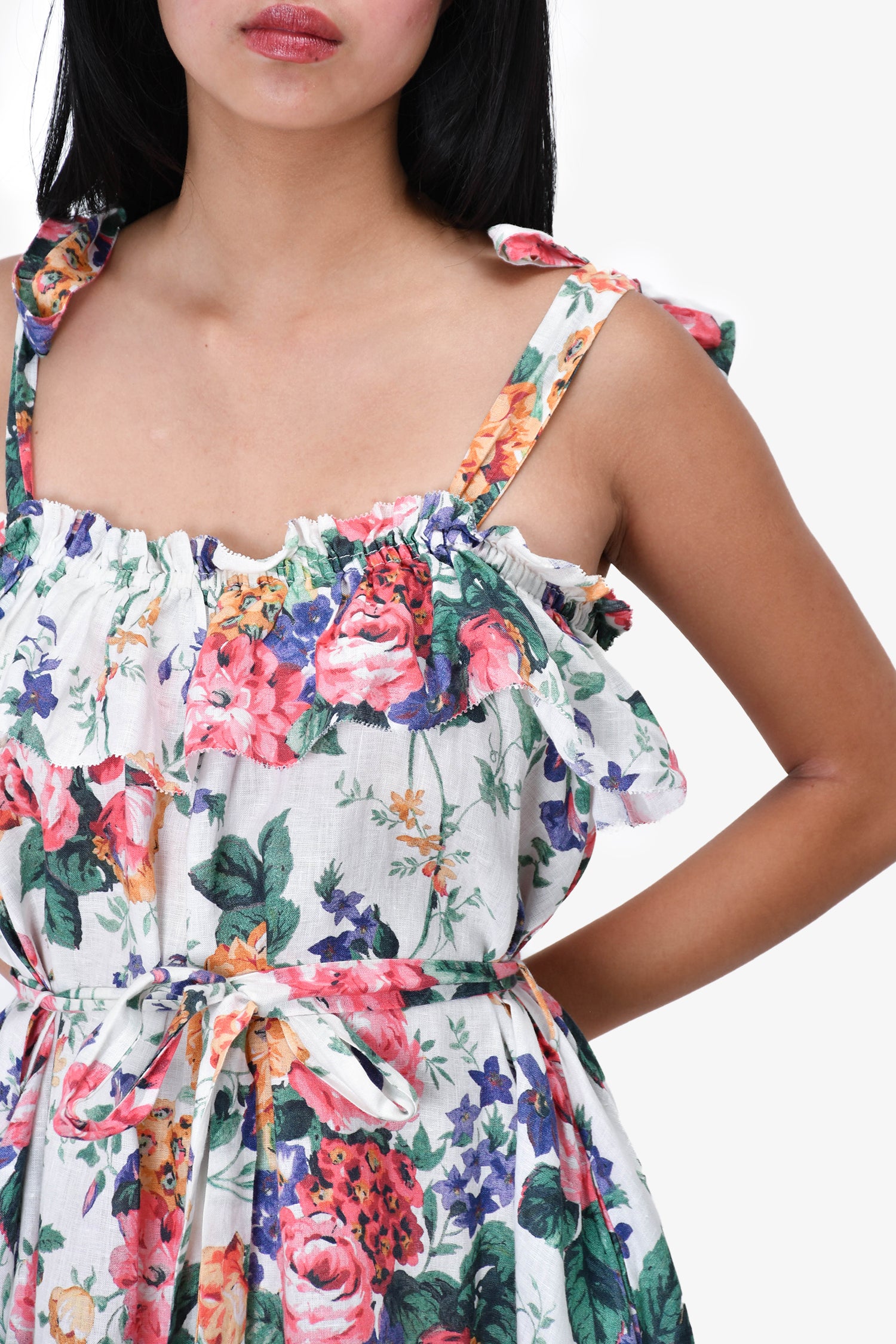 Refresh availabilityZimmermann White Floral Cold Shoulder Dress. Tie-up straps. Ruffled at the neckline. Belt on the waist. Ruffled at the hemline. Tonal stitching.
