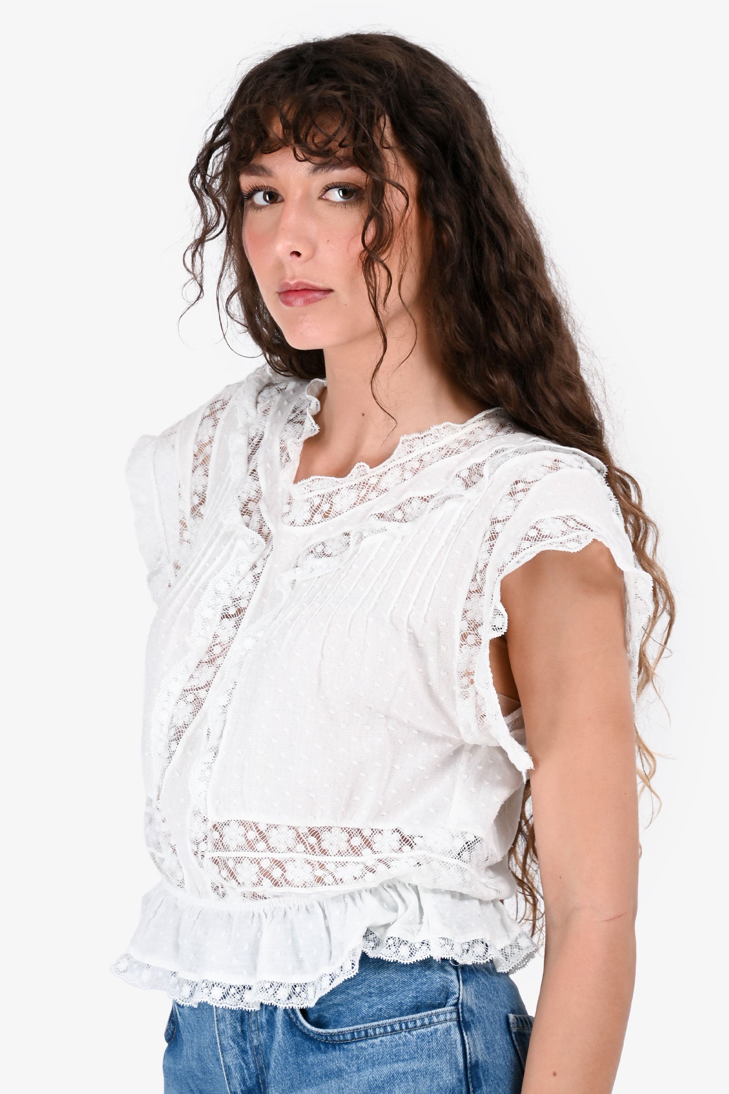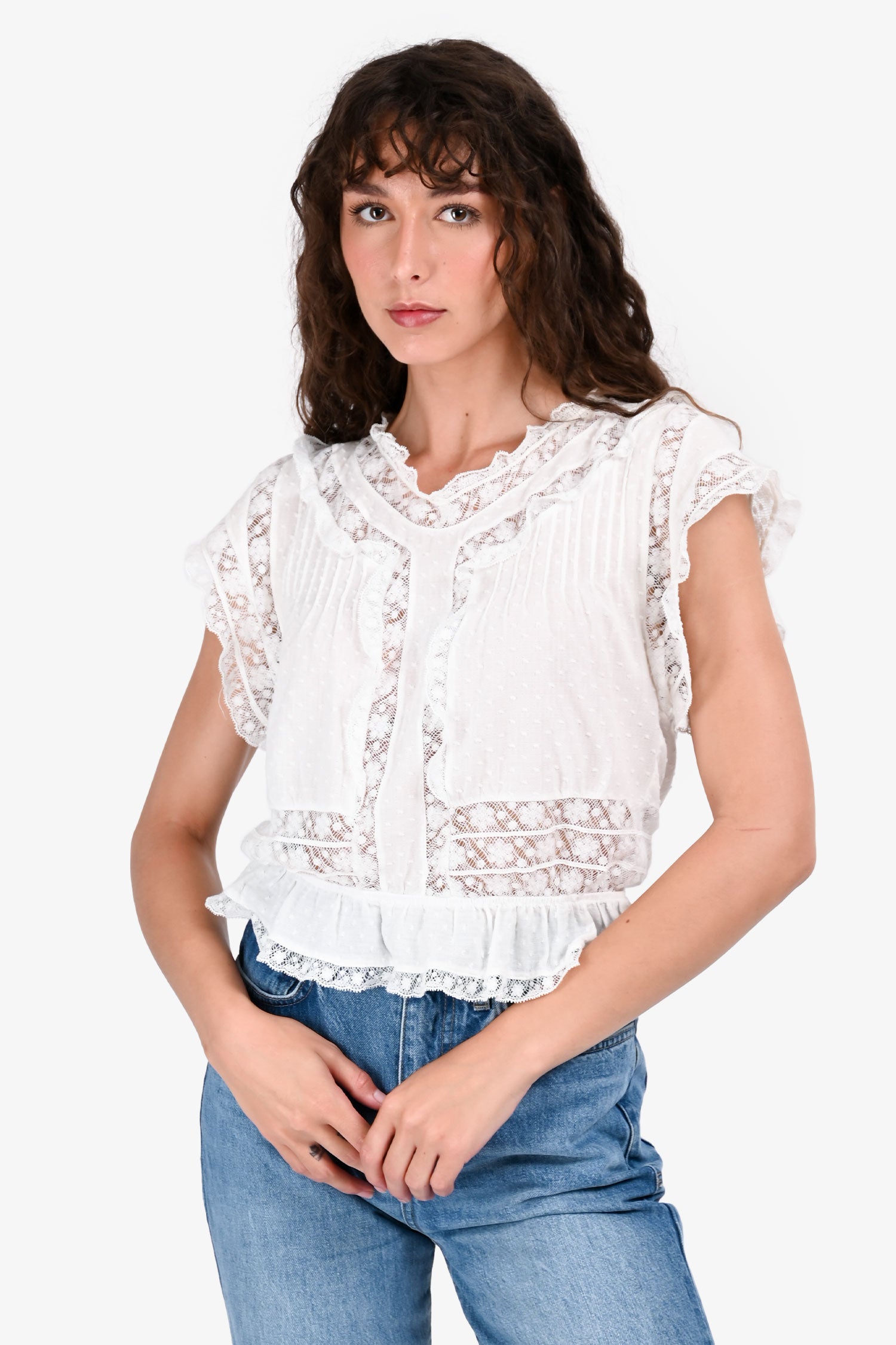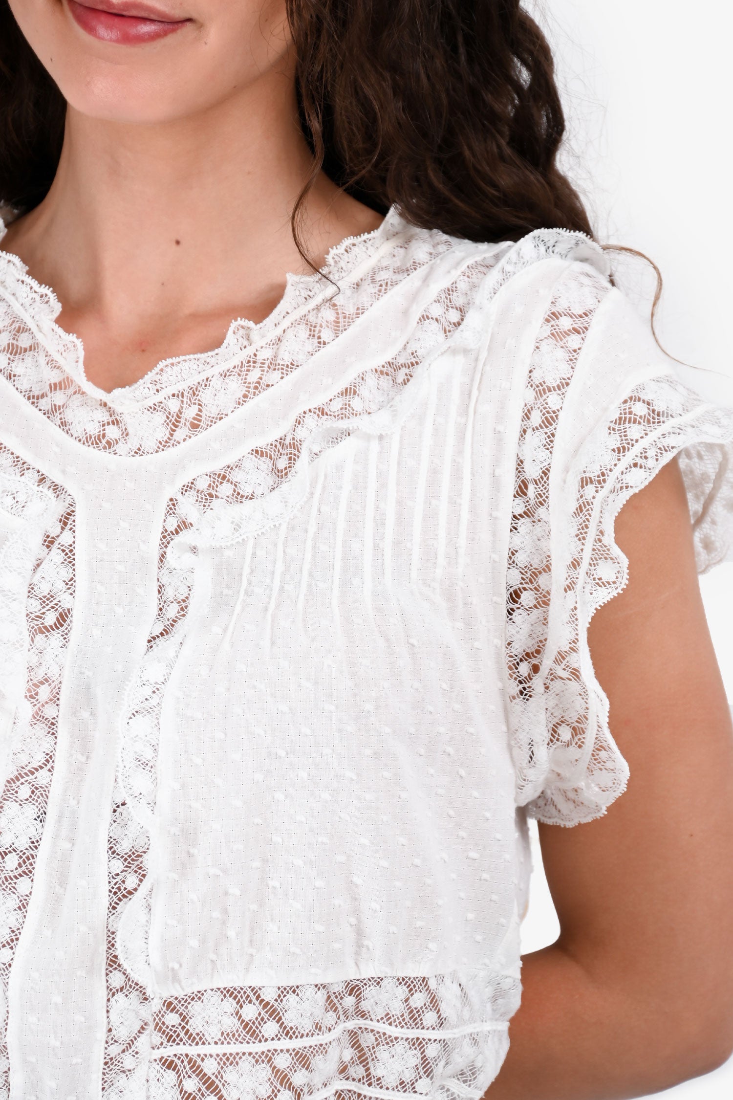 Refresh availabilityZimmermann White Lace Detailed Sccop Neck Ruffled Hem Top. Round neckline with lace trim. Short sleeves. Ruffled hem. Tonal stitching.