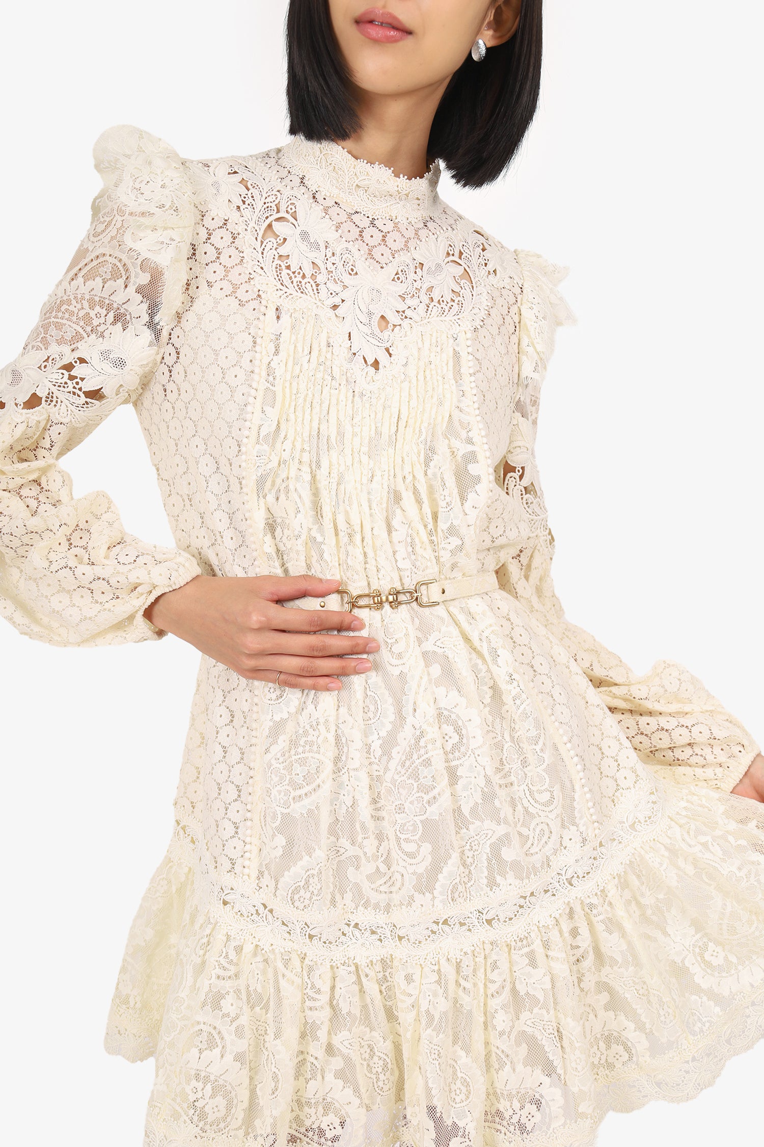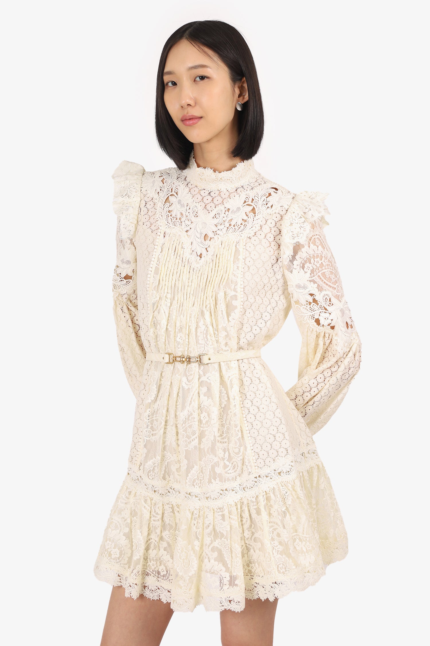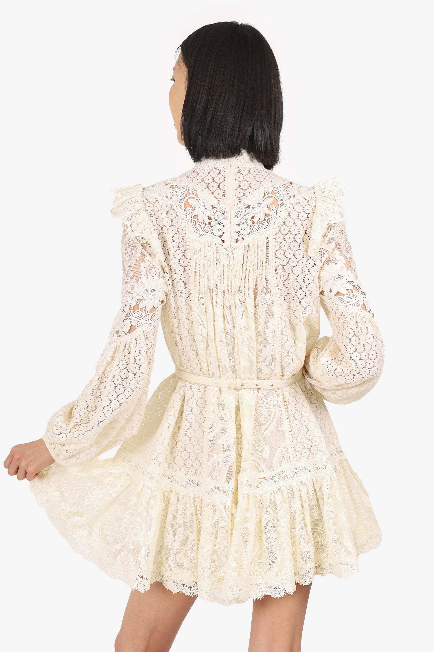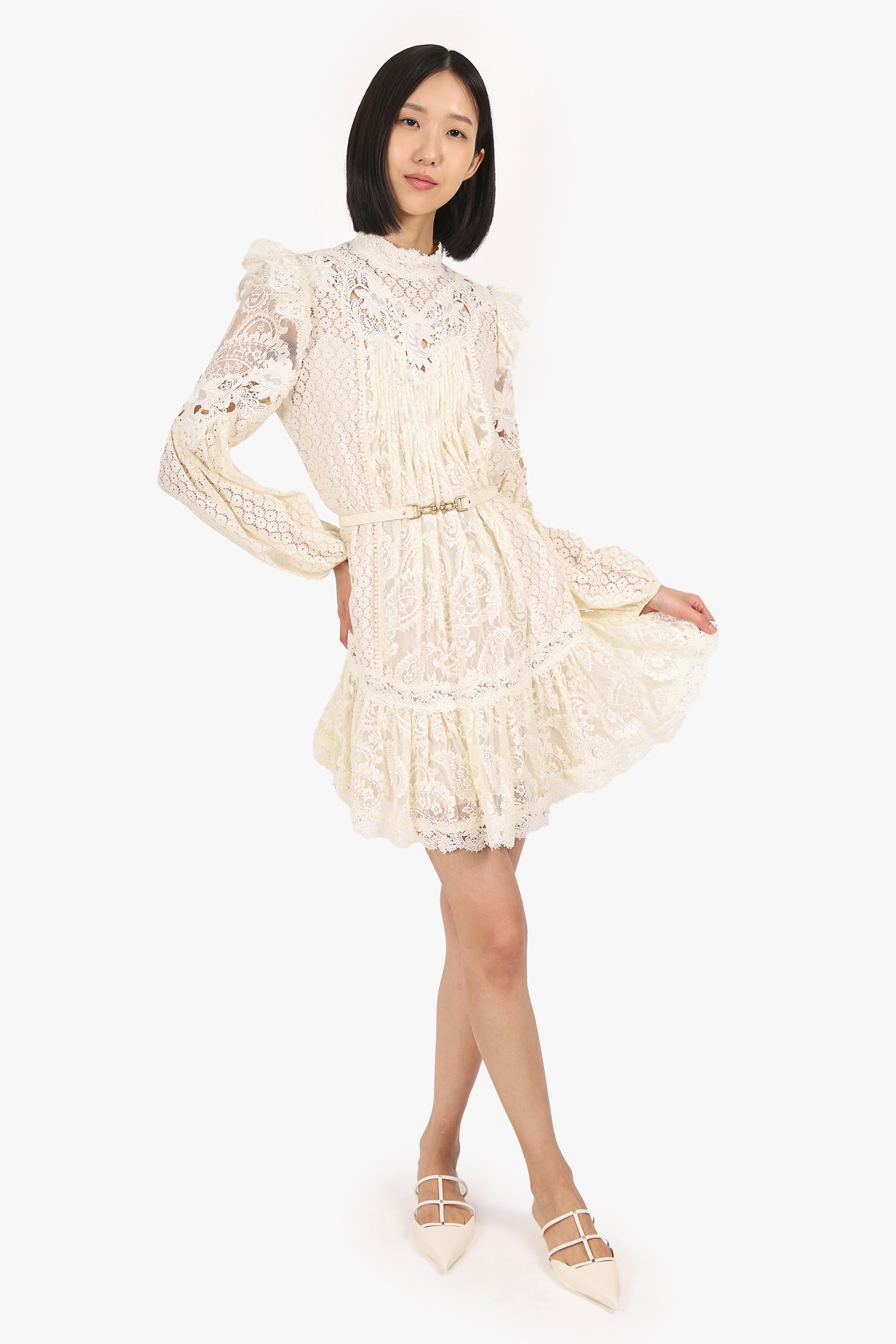 Refresh availabilityZimmermann White Lace Long Sleeve Mock Neck Mini Dress. Slip-on. Round neckline. Rear zip closure. Elasticated sleeve cuffs. Removable belt at waistband with adjustable push-pin closure. Includes slip dress with adjustable buckle closure. Gold-tone hardware. Tonal stitching.