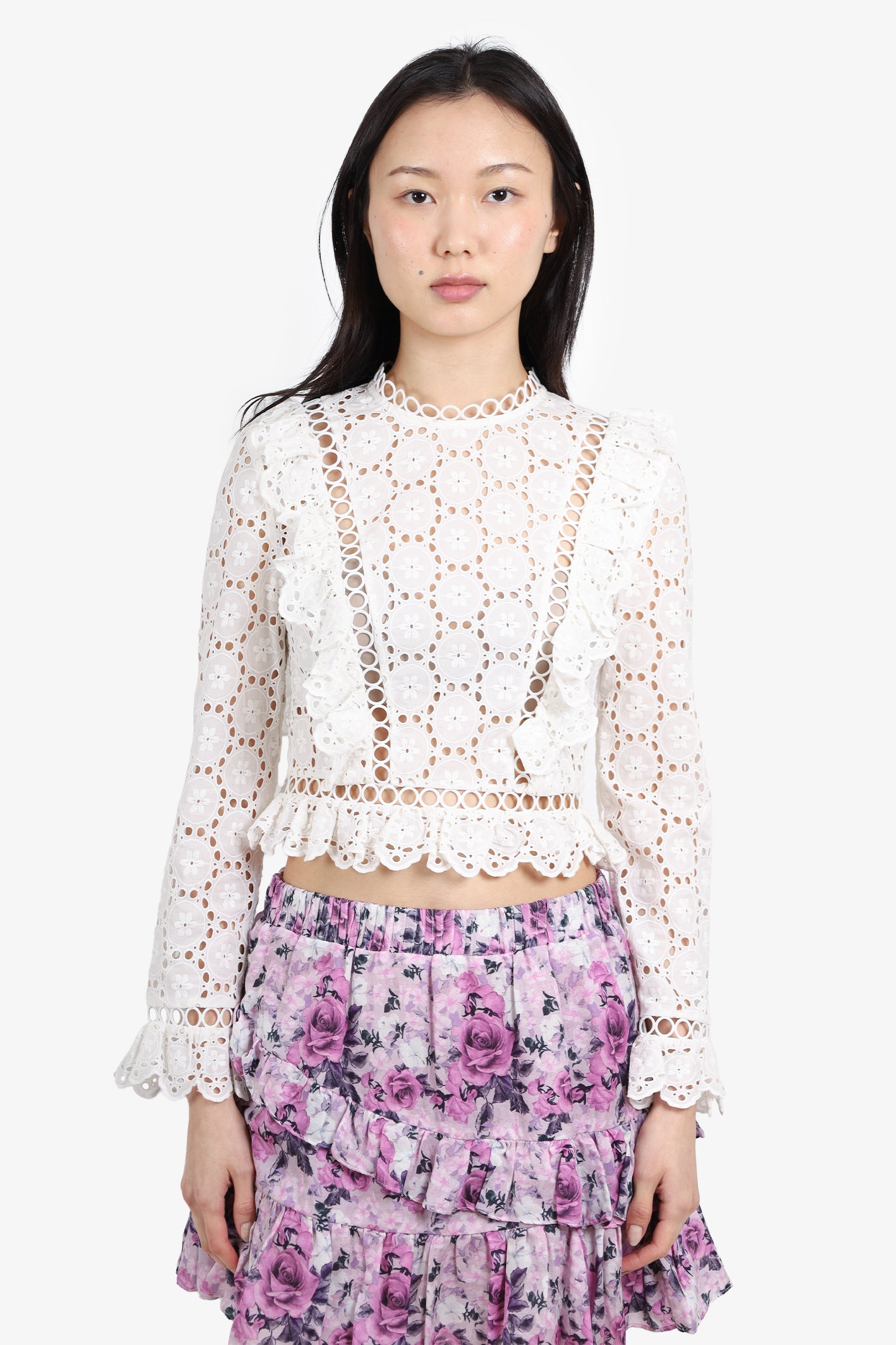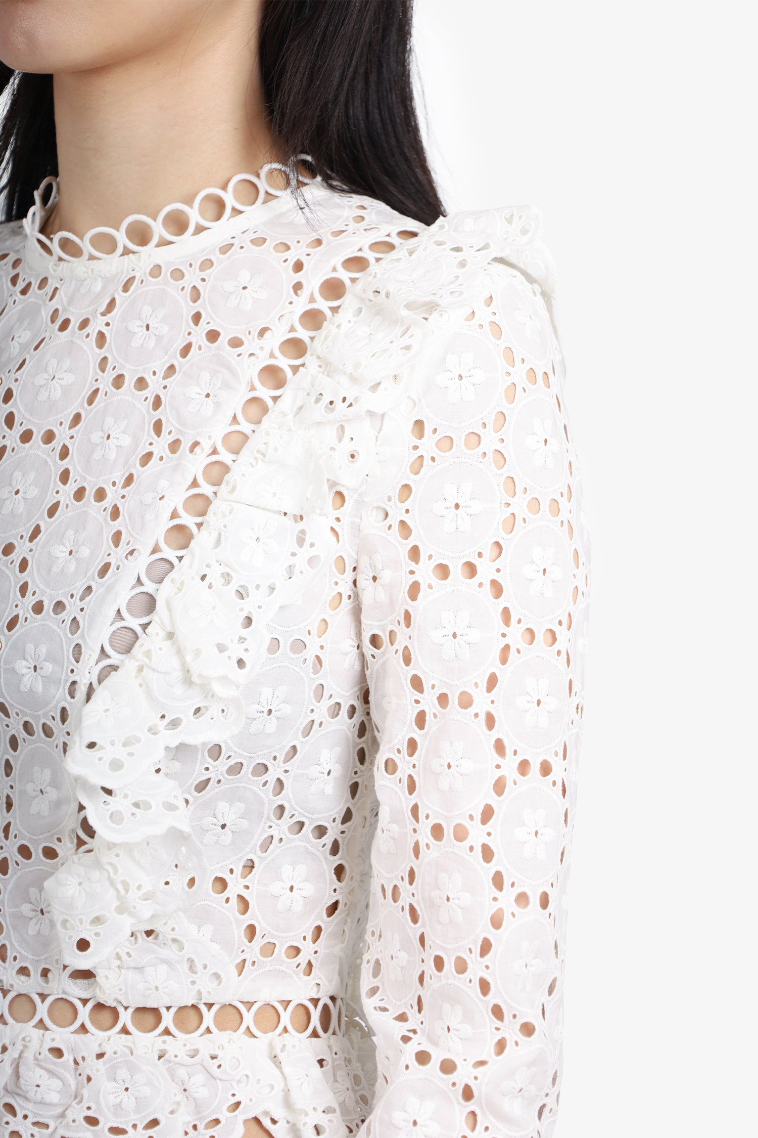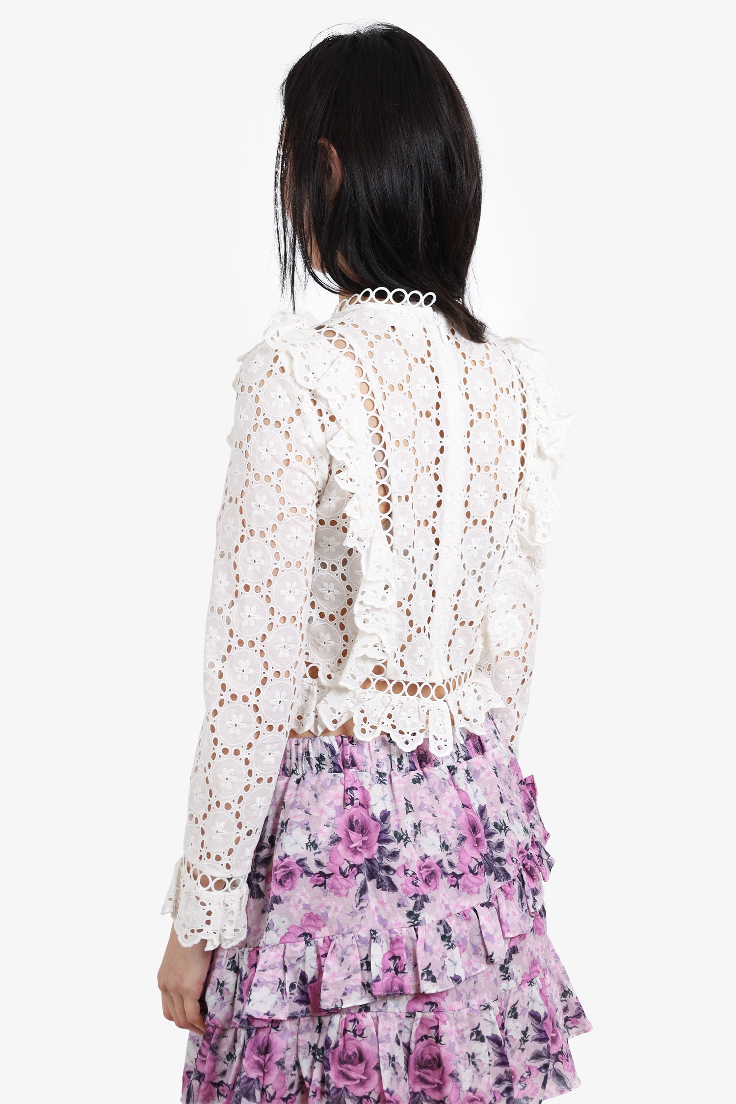 Refresh availabilityZimmermann White Lace Pattern Eyelet Top. Round neckline with laced detailing. Back zip-up closure. Ruffled detailing on cuffs and hem. Tonal stitching.