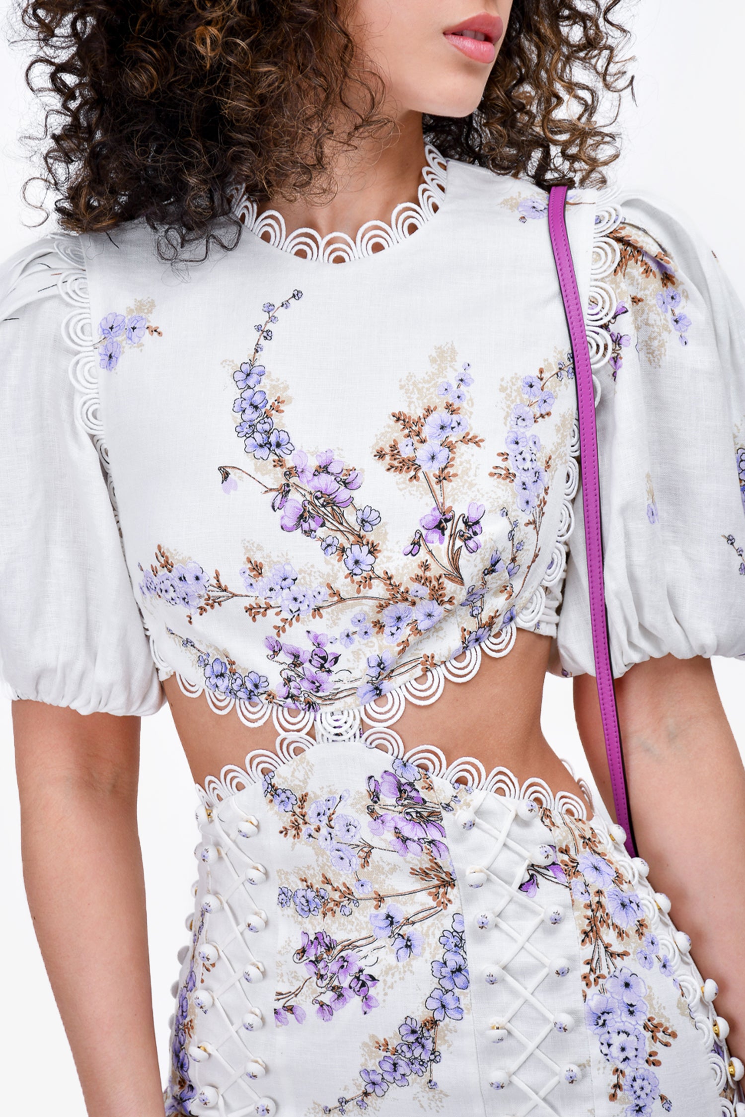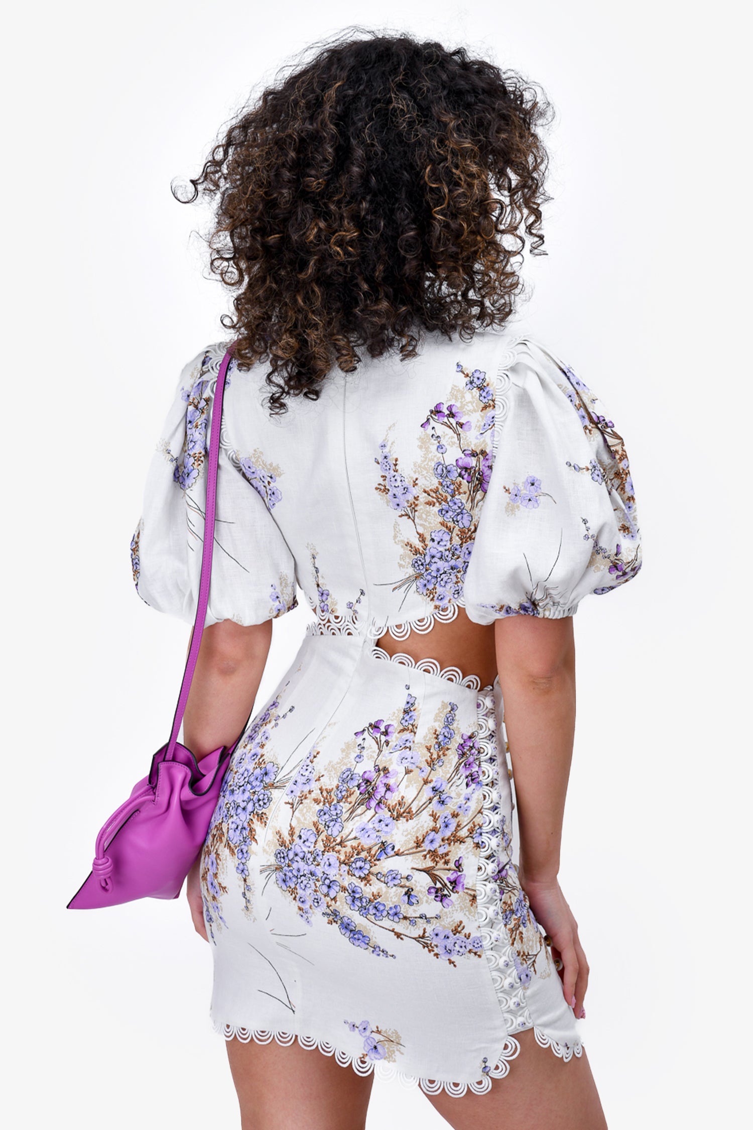 Zimmermann White/Lilac Linen Cut Out Puff Sleeve Dress Size 0