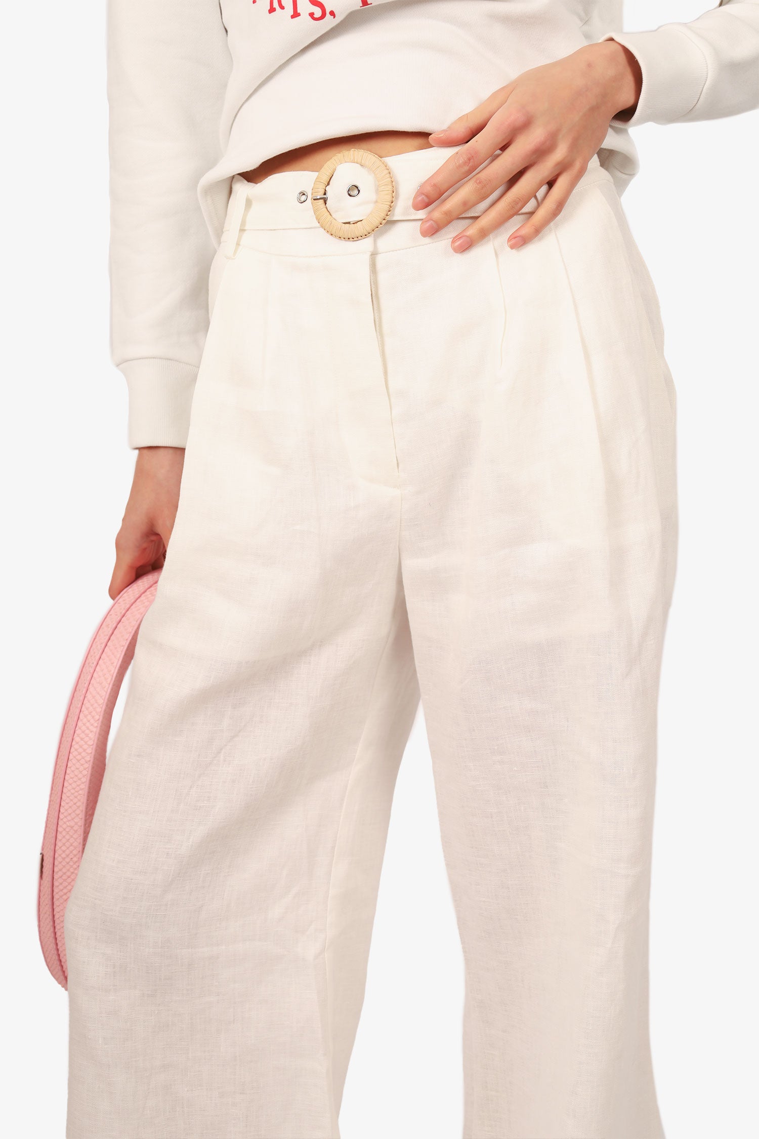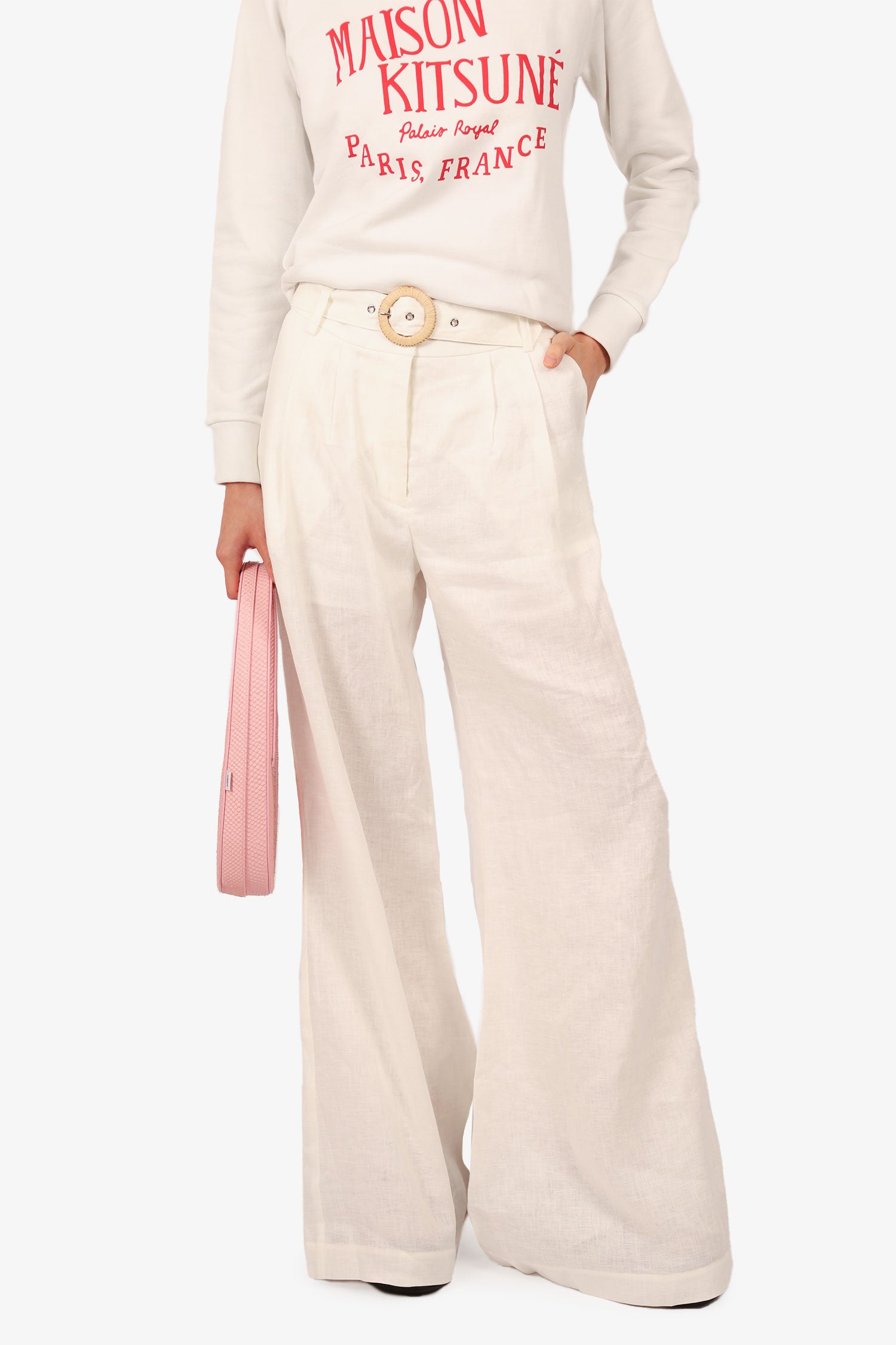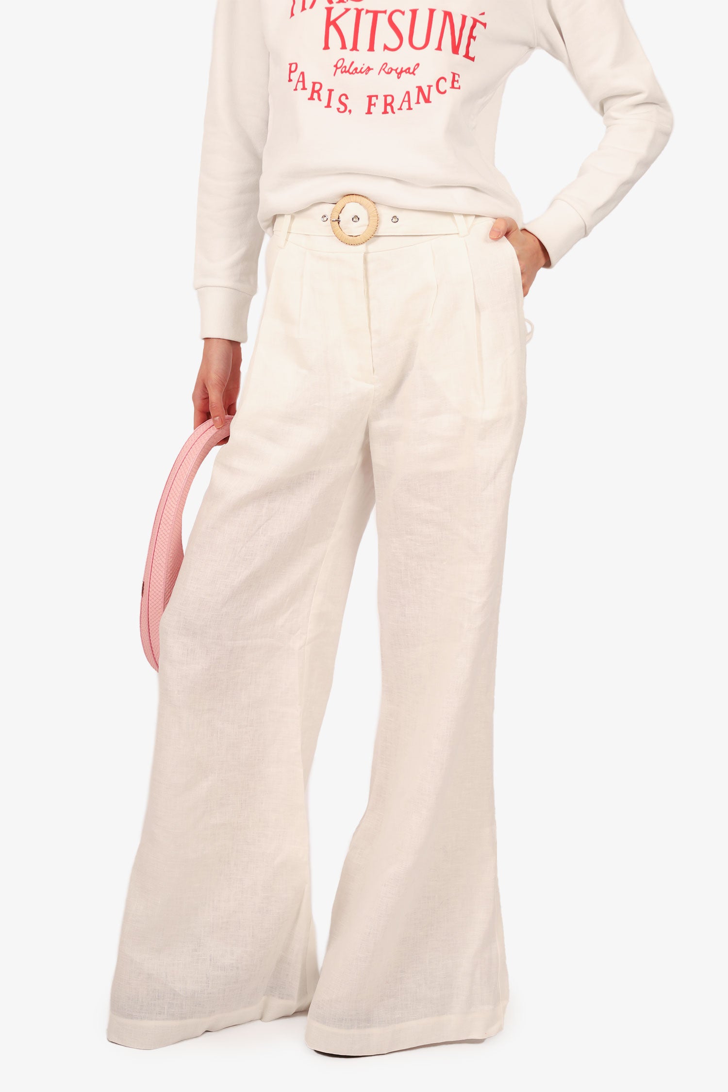 Refresh availabilityZimmermann White Linen Belted Pants. Pull-on. Front zip with double hook closures. Removable and adjustable belt at waistband. Belt loops at waistband. 2 exterior rear slip pockets. Bell bottoms. Silver-tone hardware. Tonal stitching.