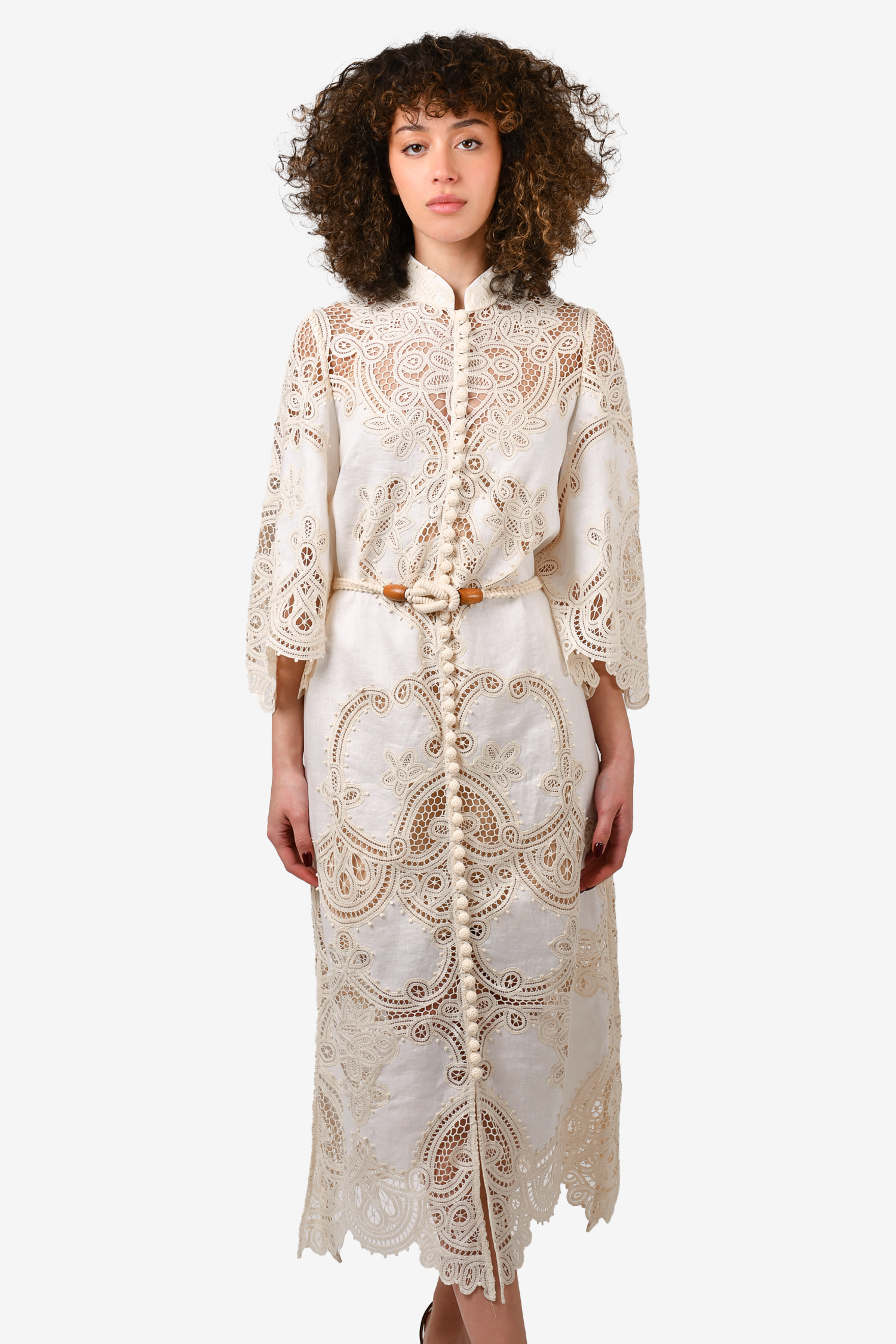 Refresh availabilityZimmermann White Linen Crochet Lace Midi Dress. Rear zip closure. Tonal stitching. No slip included.