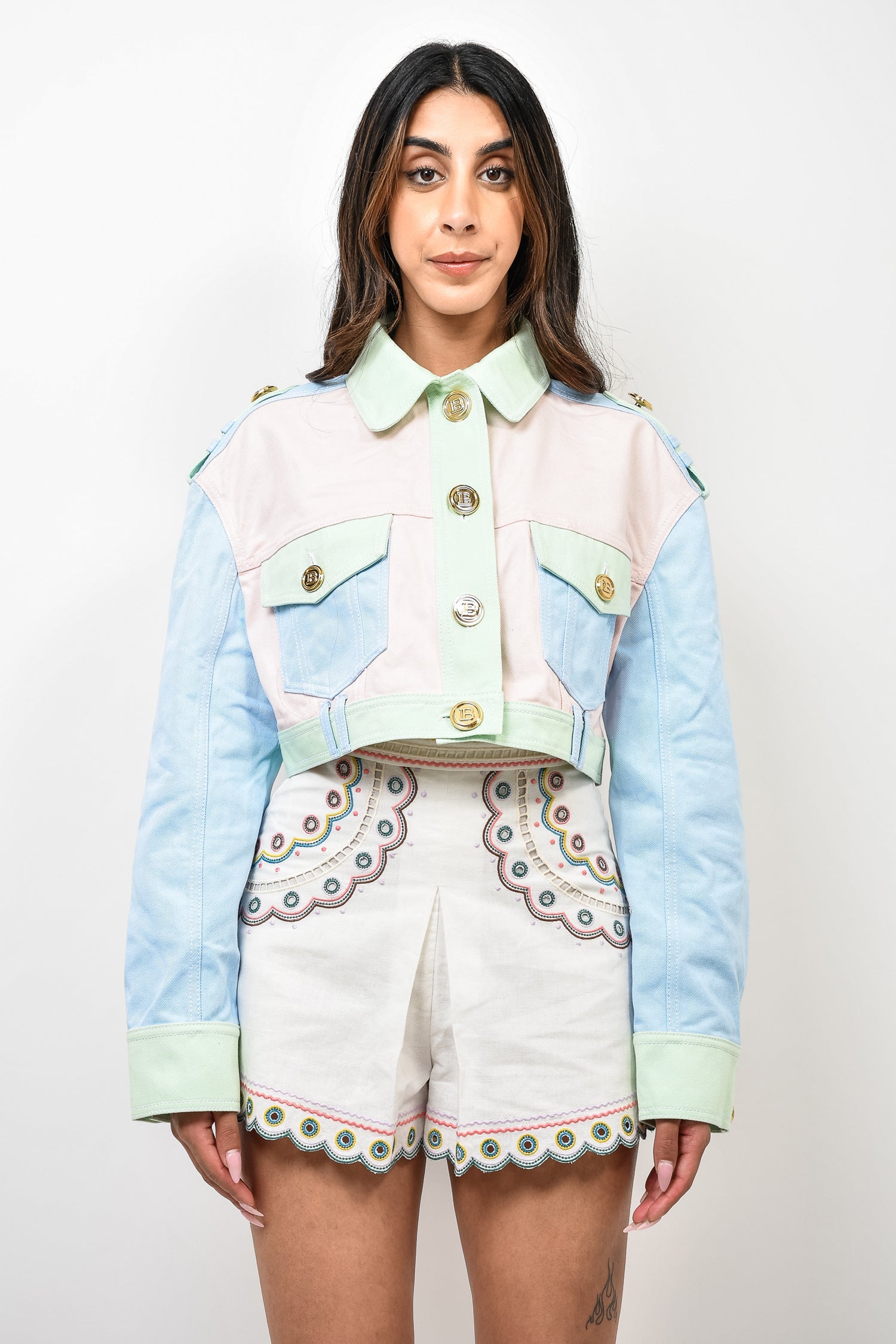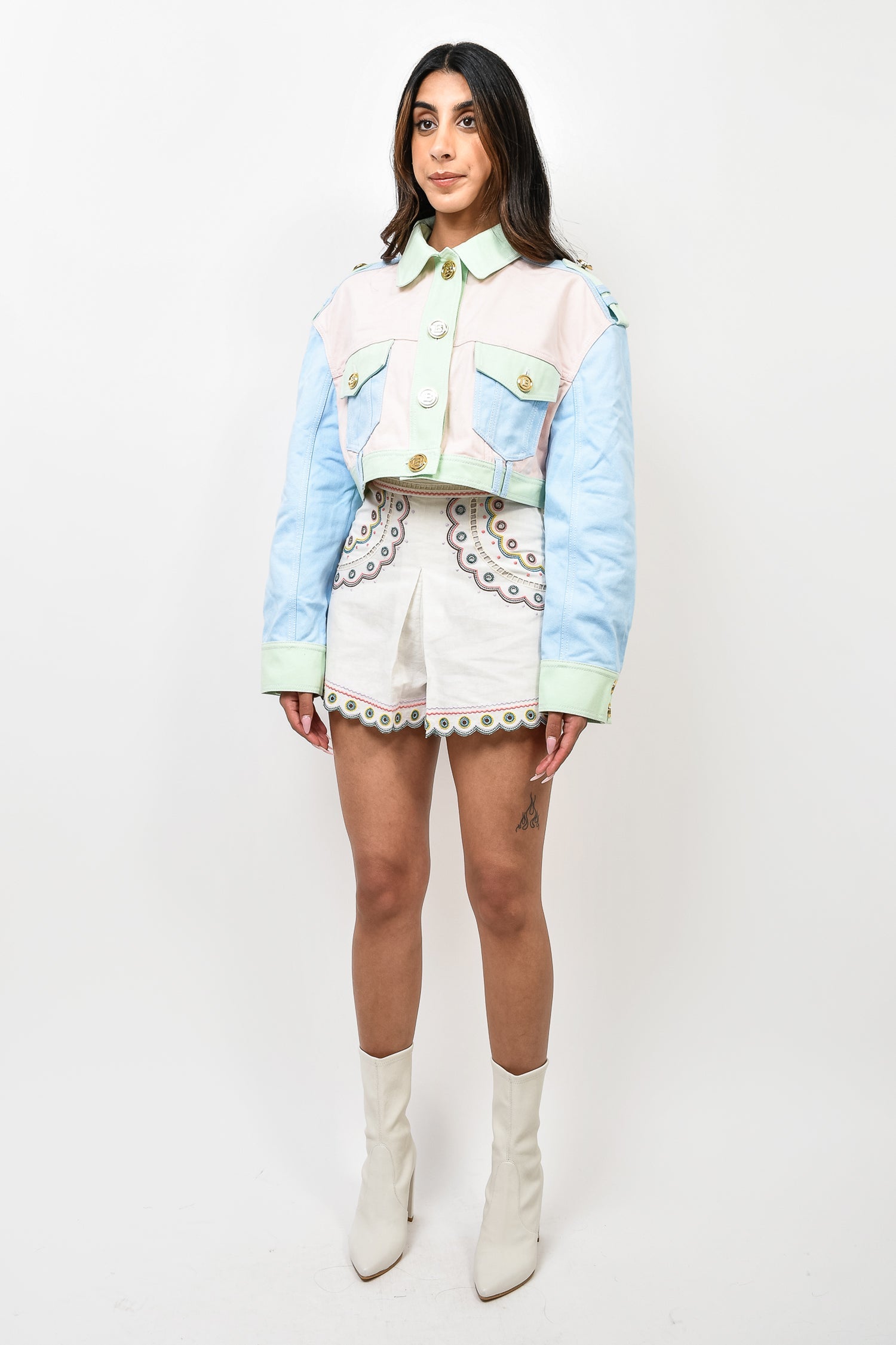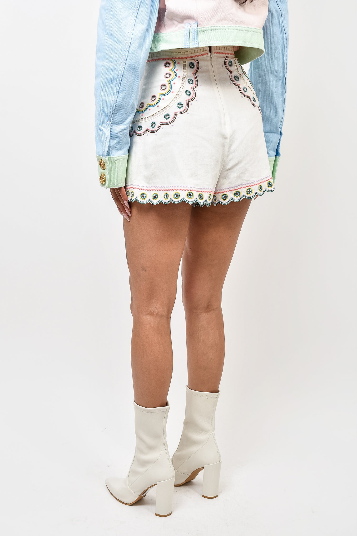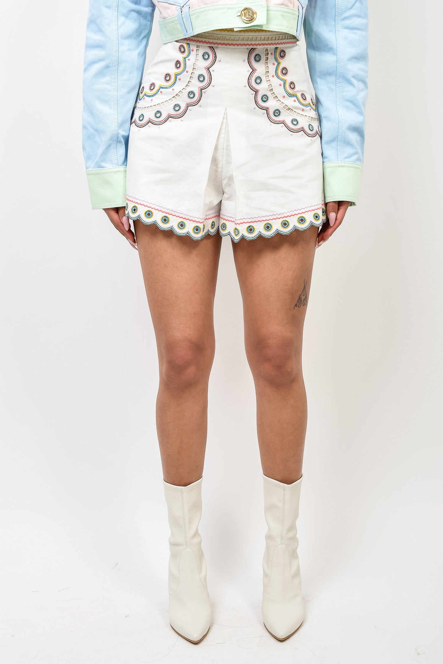Zimmermann White/Multicolour Linen/Cotton Embroidered Scalloped Edge Shorts sz 0