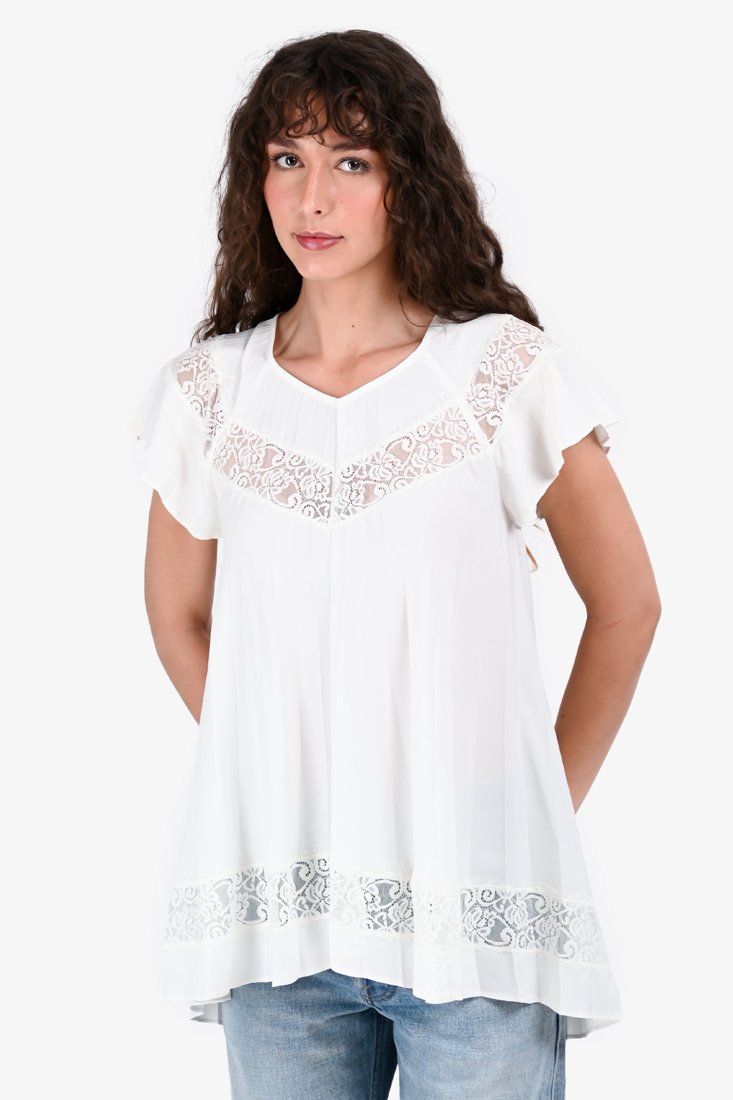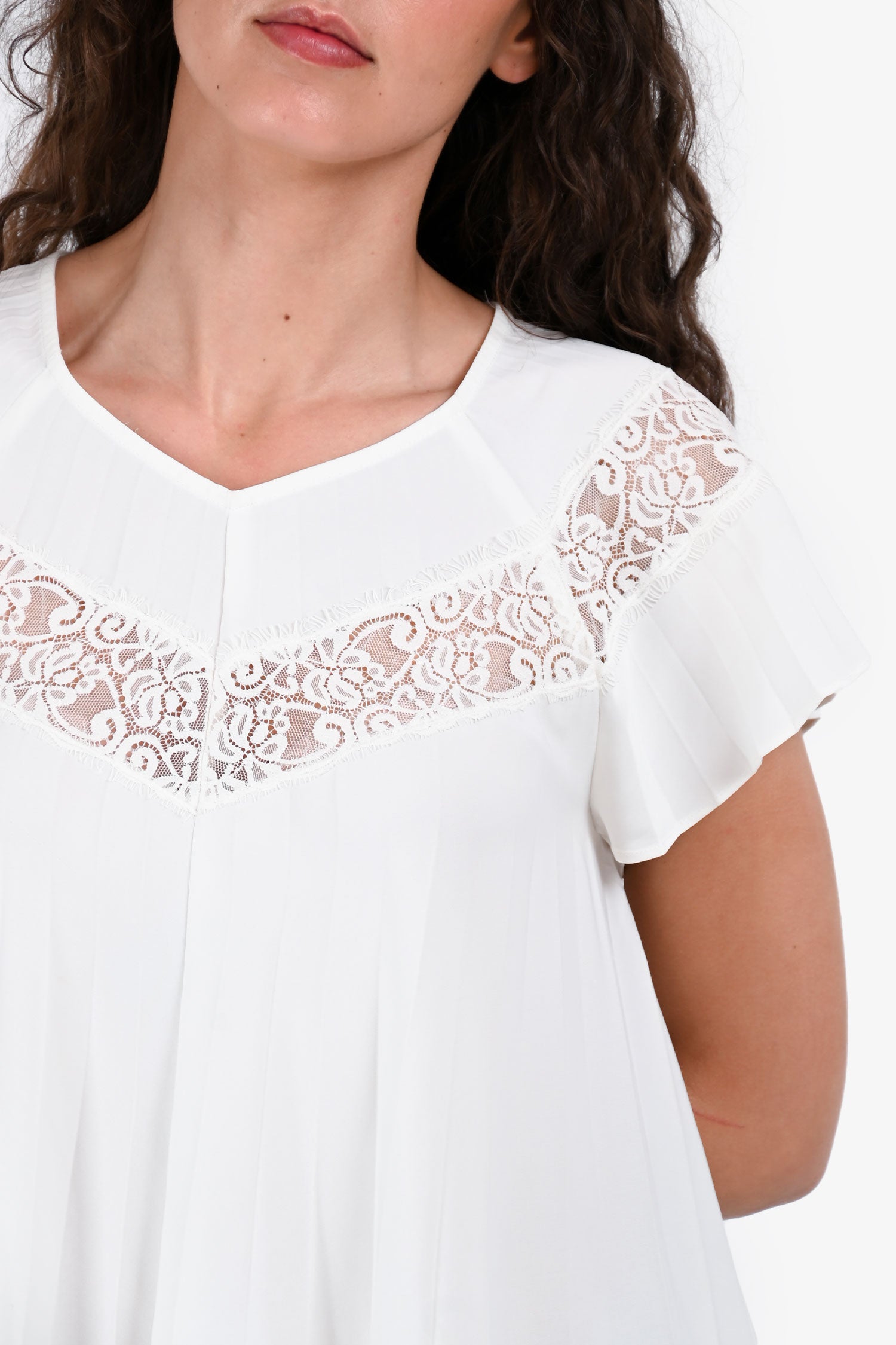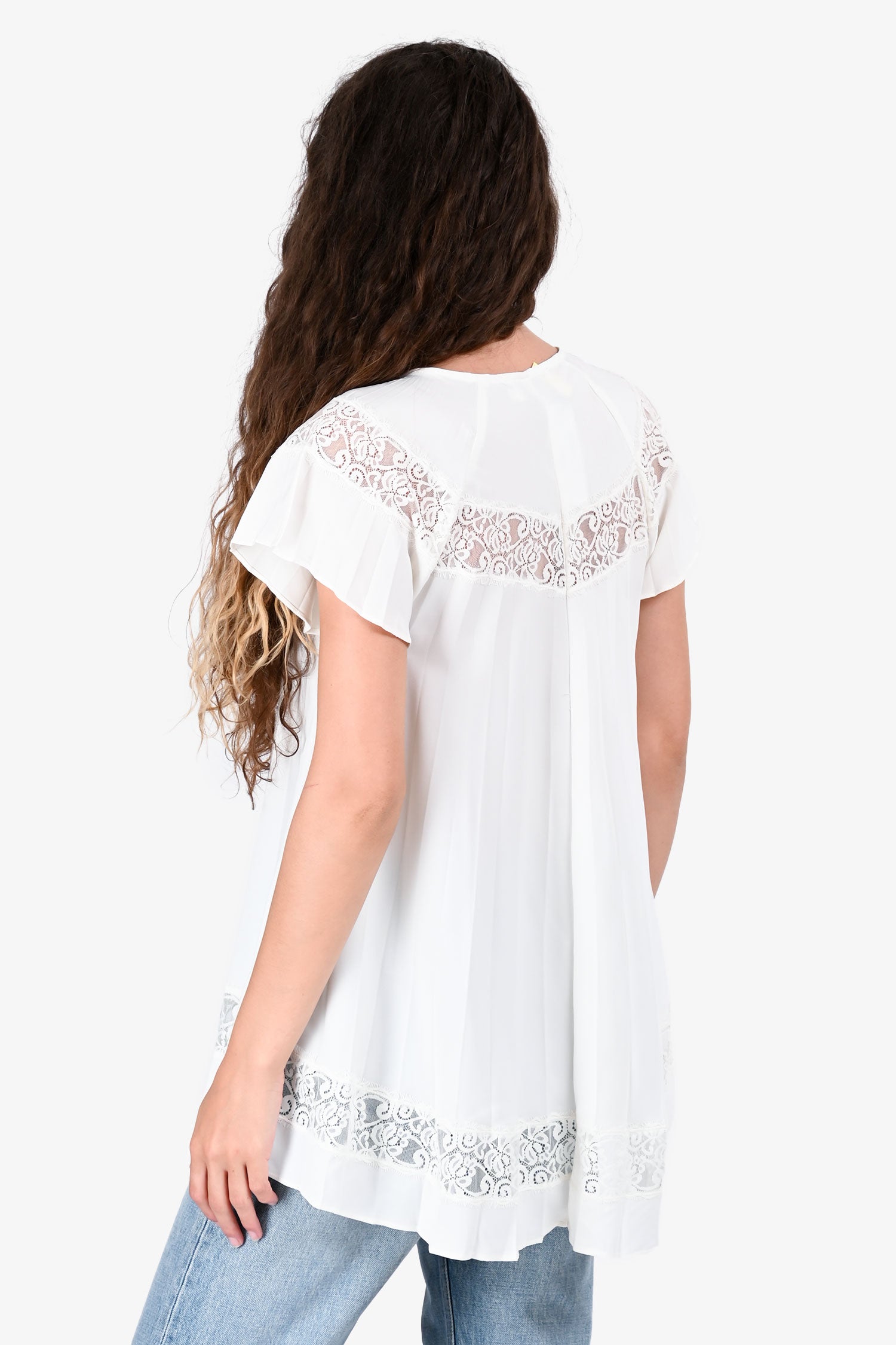 Refresh availabilityZimmermann White Pleated Lace Detail Top. V-neckline. Short sleeves. Tonal stitching.