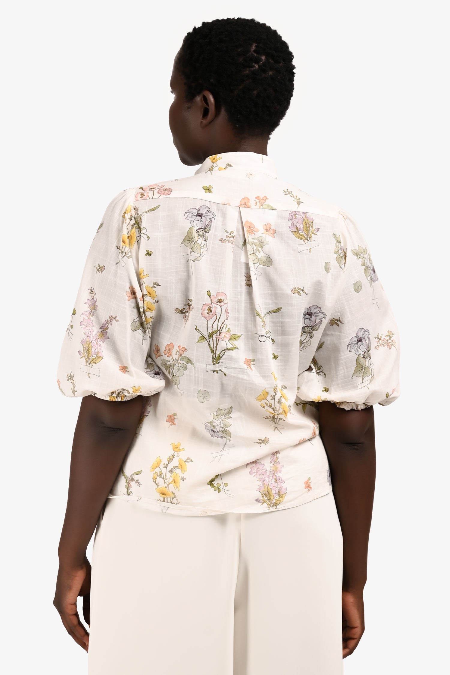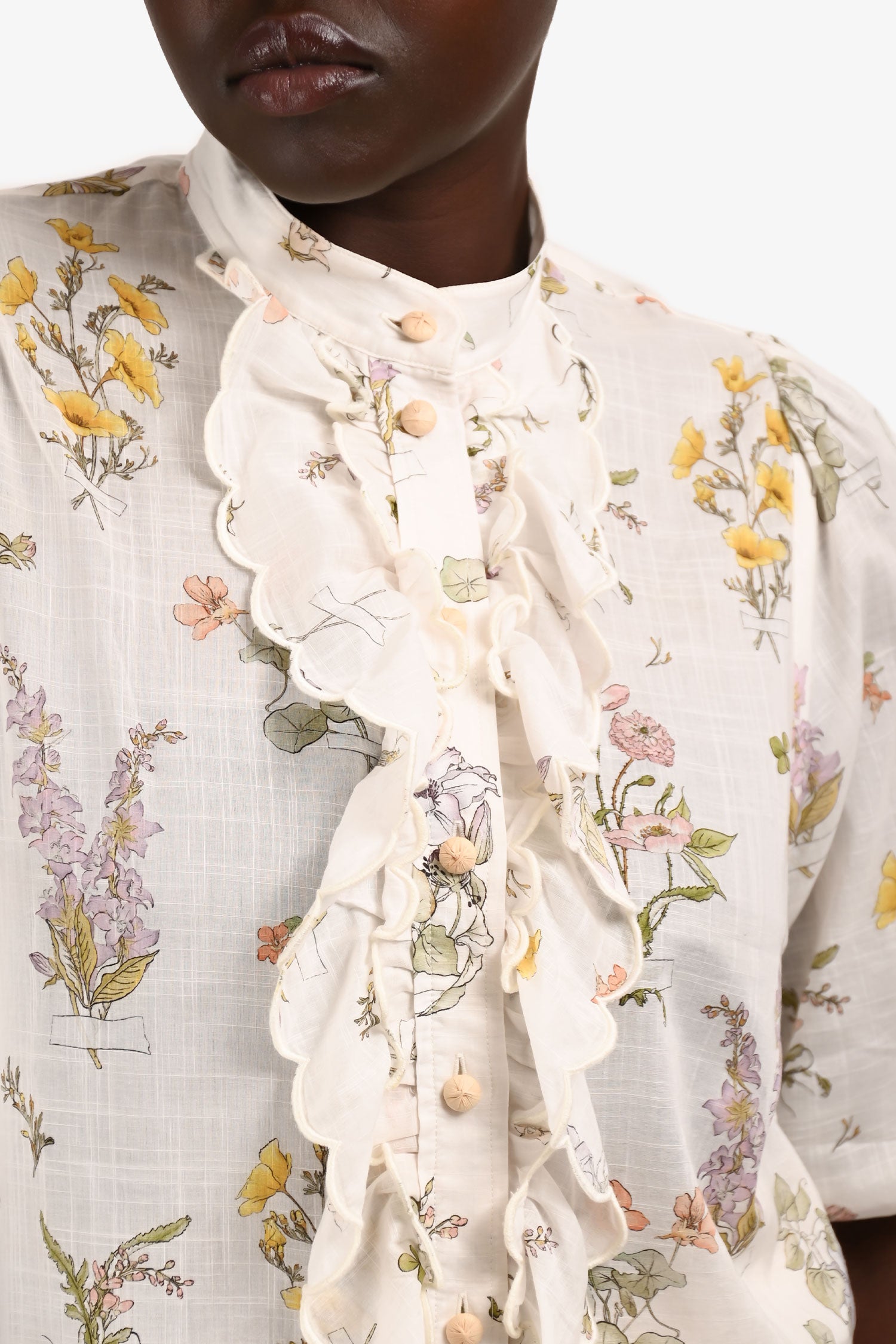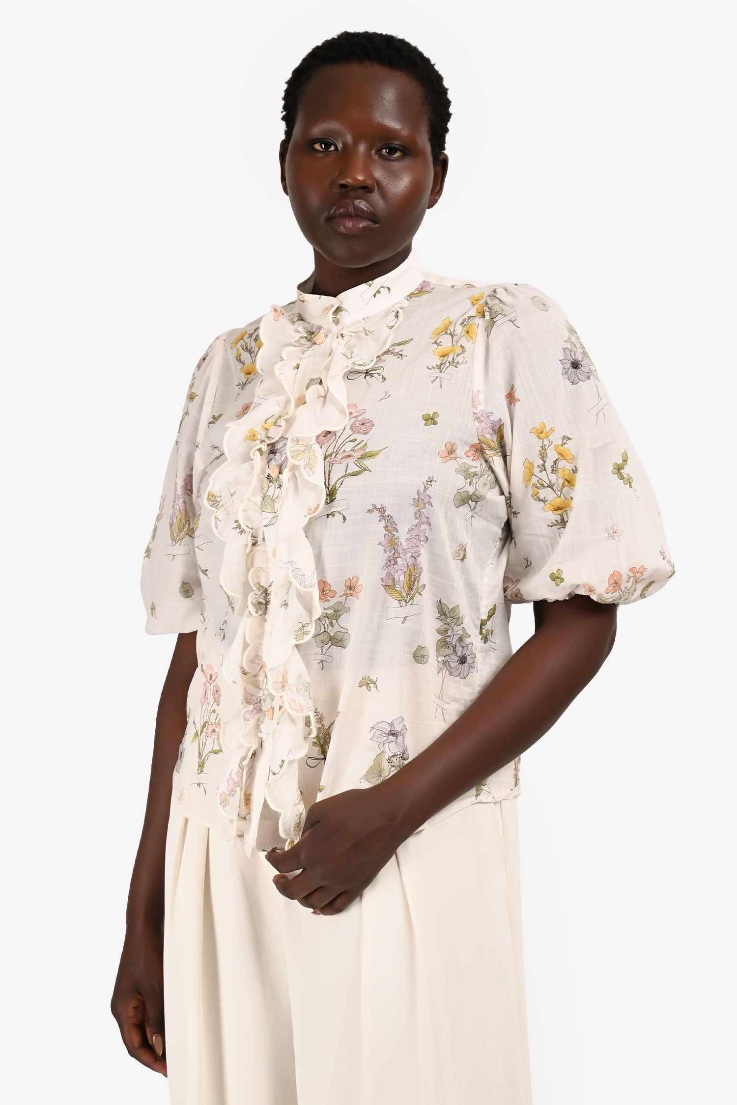 Refresh availabilityZimmermann White/Multicolour Floral Scalloped Ruffle Blouse. Elasticized cuffs.