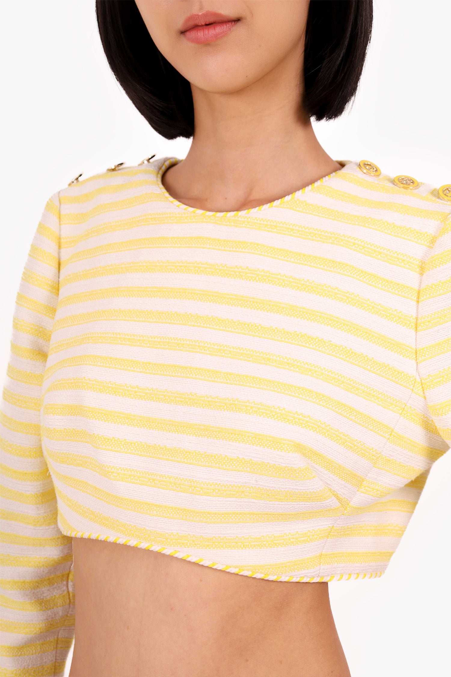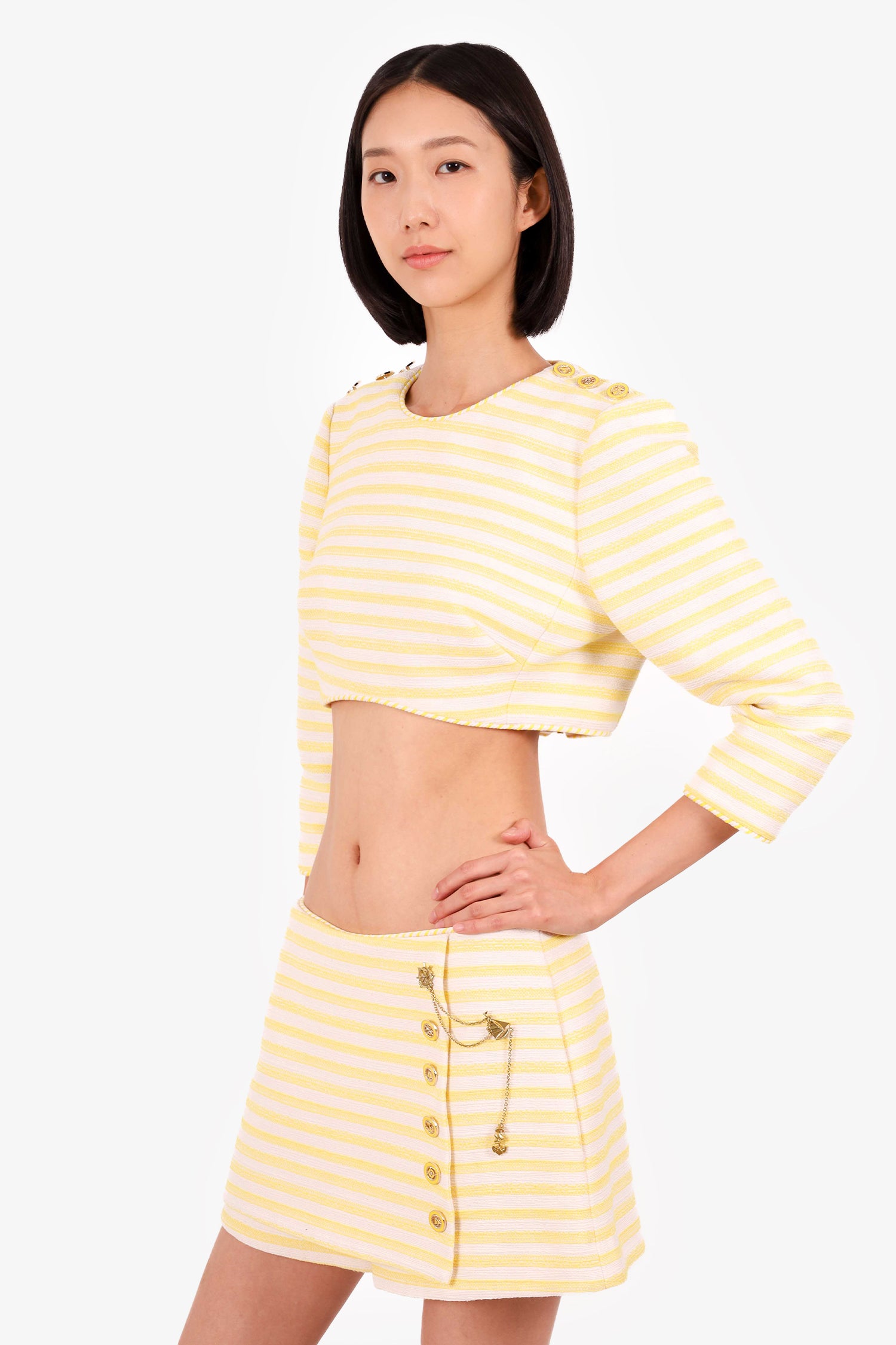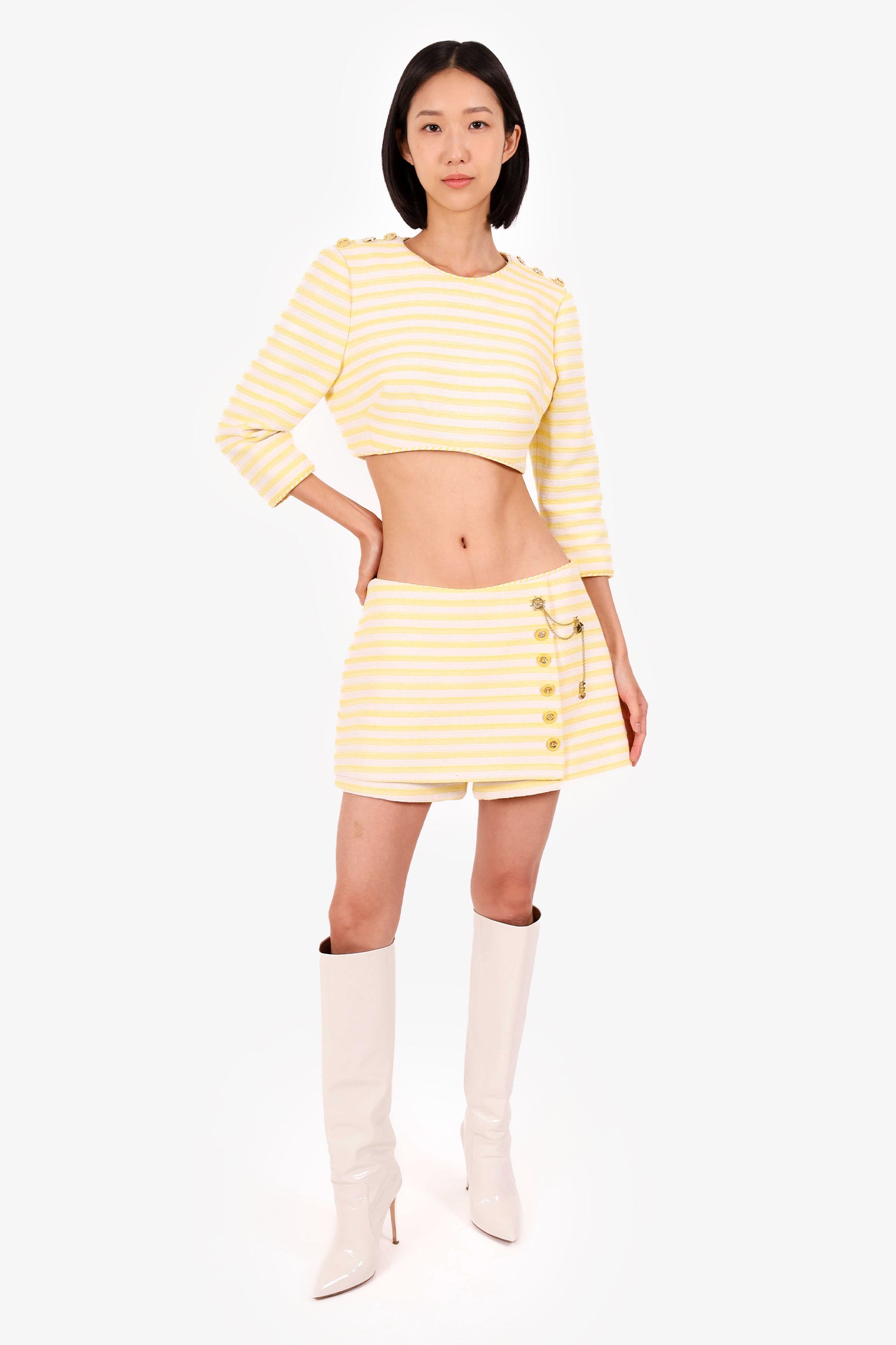 Refresh availabilityZimmermann Yellow/White Striped High Tide Cropped Top With Skort Set. Top: Pull-on. Round-neckline. Rear zip closure. Button detail on shoulders. Gold-tone hardware. Tonal stitching; Skort: Slip-on. Rear zip closure. Lined interior. Gold-tone hardware. Tonal stitching.